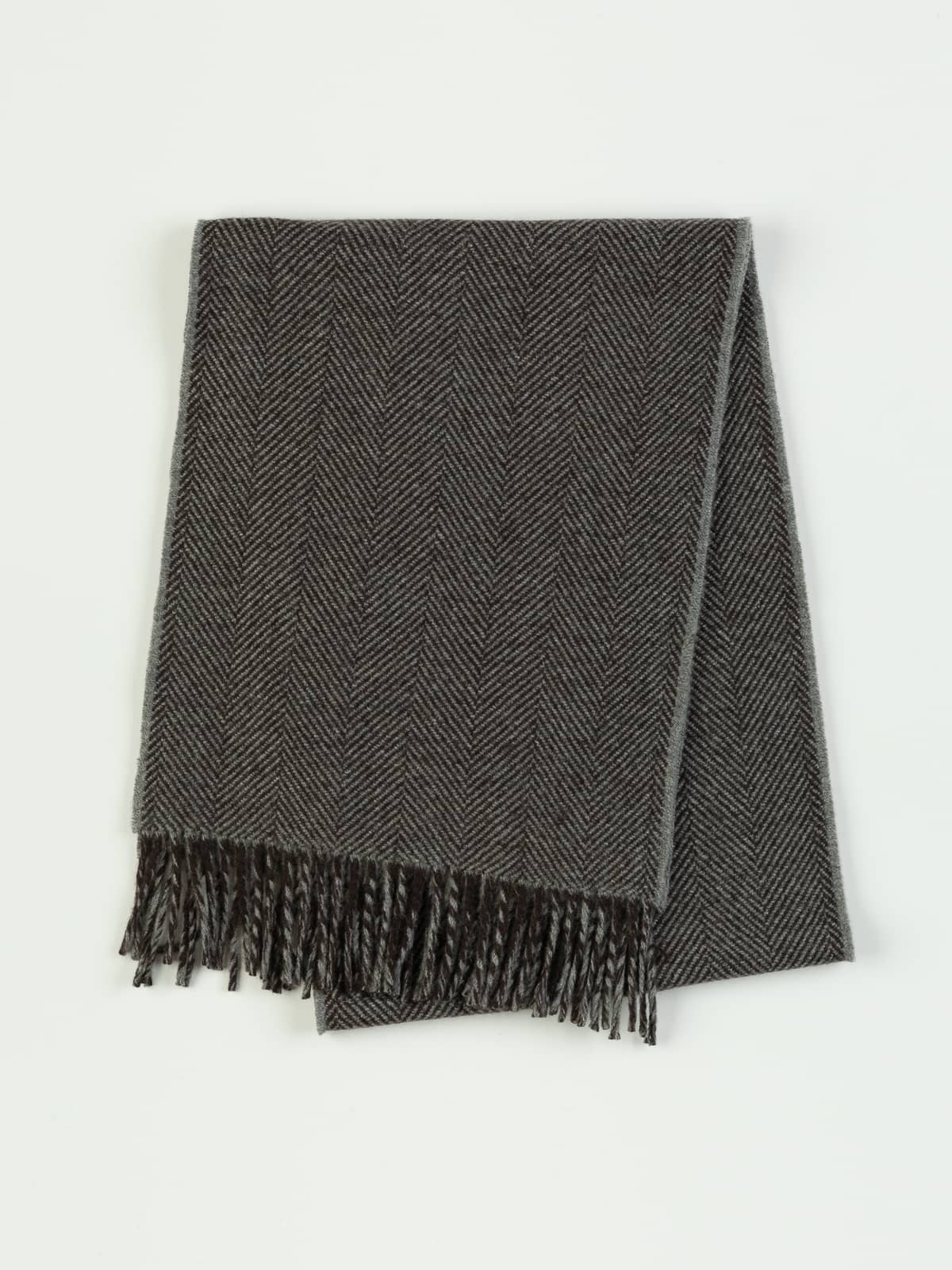 With a reversible weave of deep peat and weathered stone, evoking the upland paths where heather meets dry-stone wall. The subtle zig-zag chevrons bring gentle movement to the cloth, giving a timeless, tailored feel. Wonderfully soft and naturally warm, it offers easy sophistication for city and country alike.