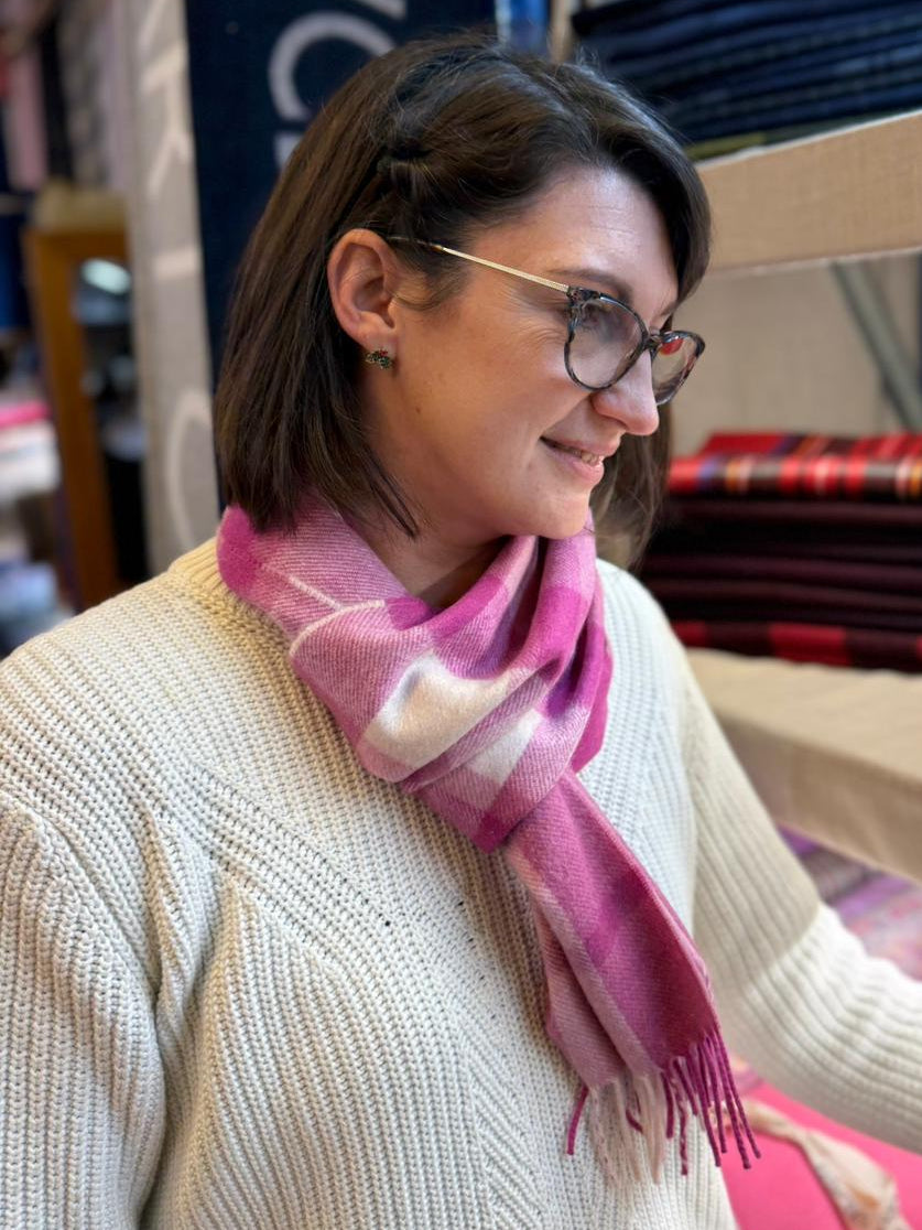 Alive with vivid heather and thistle pinks softened by pale cream tones, this scarf captures the vibrant bloom of Yorkshire moorland in late summer. Its fresh yet feminine palette brings warmth and brightness to cool days, while the fine cashmere weave lends an indulgent softness against the skin. A spirited, elegant piece that celebrates the natural colour and charm of the Northern landscape.