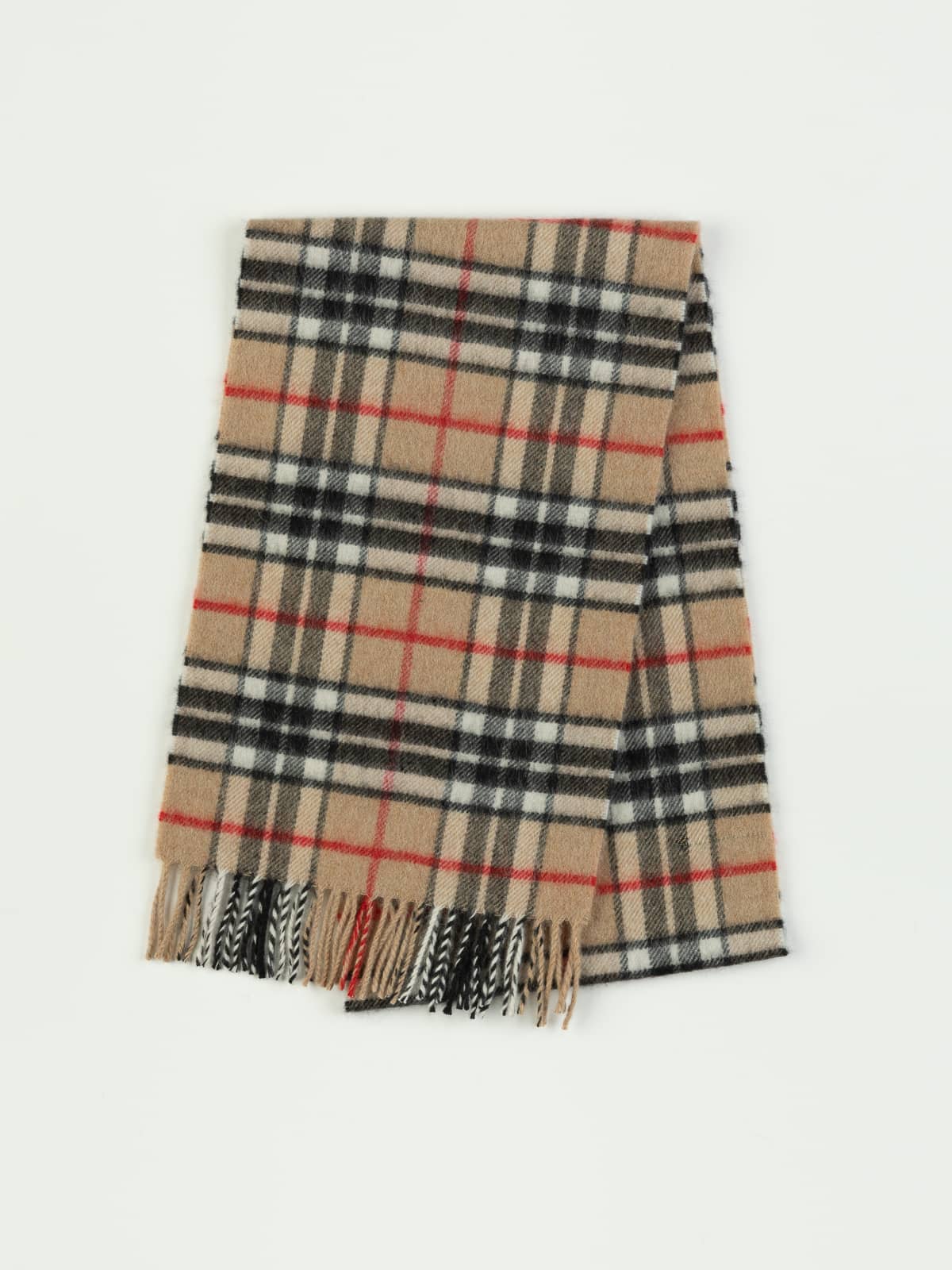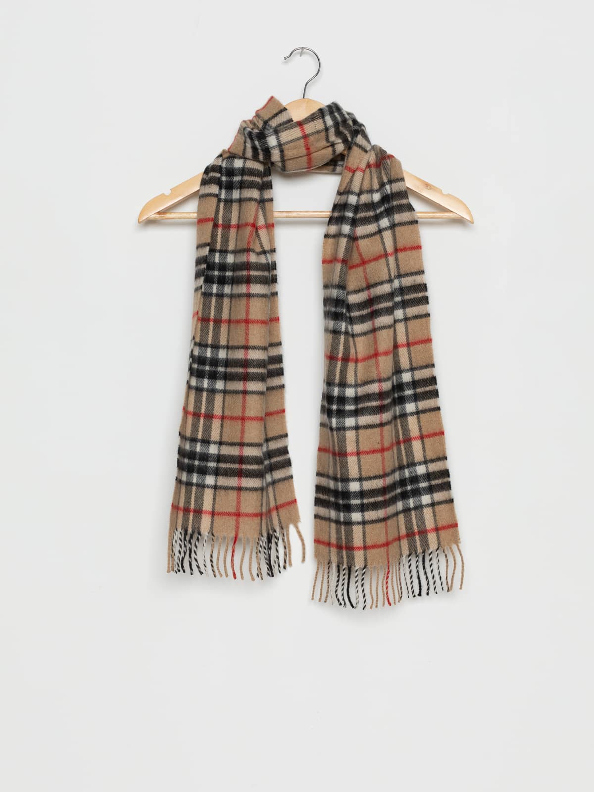 A soft sand-beige backdrop holds clean black and white bars, punctuated with fine red accents that add just the right spark. This check has a slightly lighter, softer tone than Camel, giving it a more understated, airy feel. Beautifully timeless, it complements cool-toned coats and relaxed silhouettes.