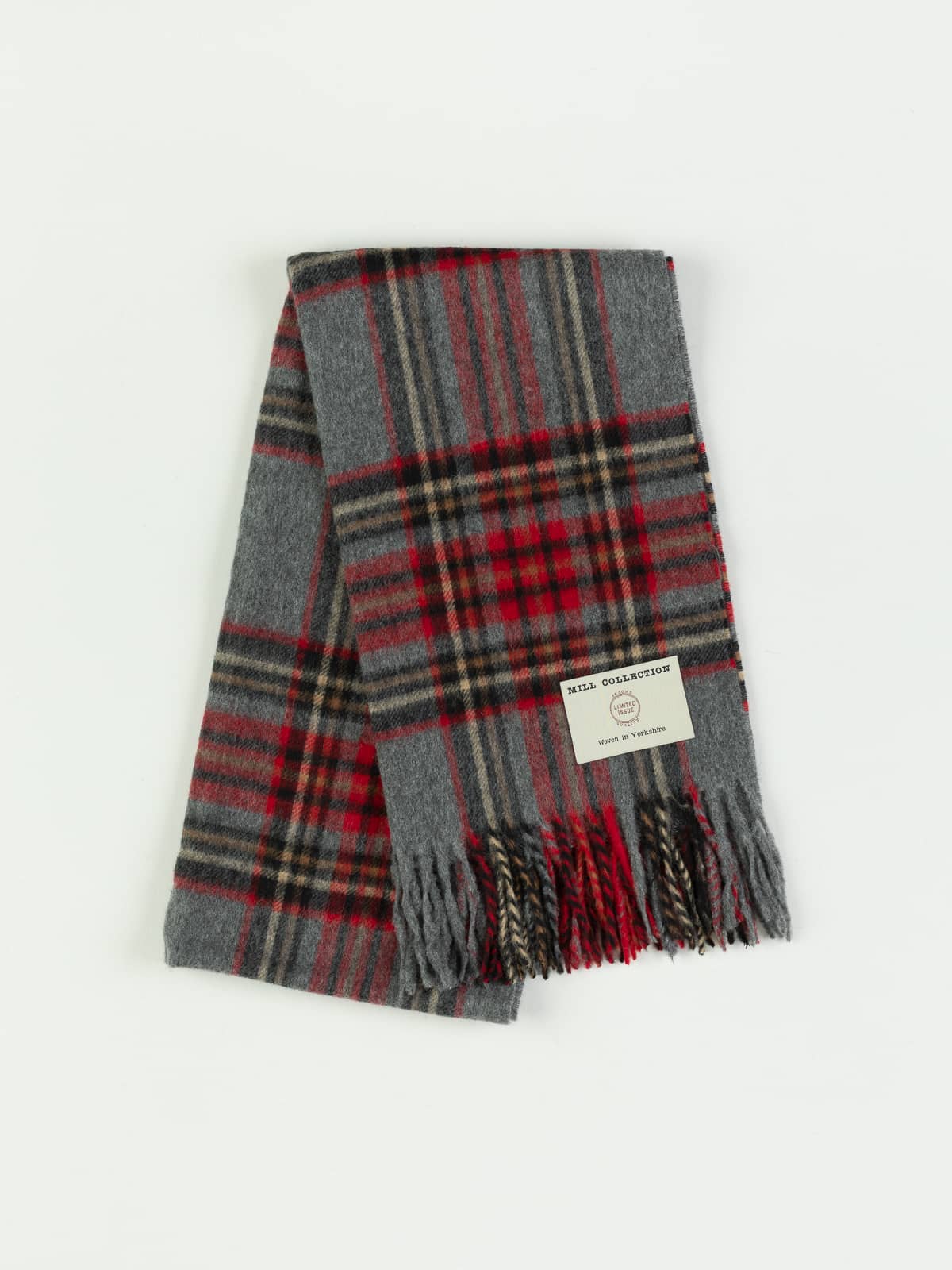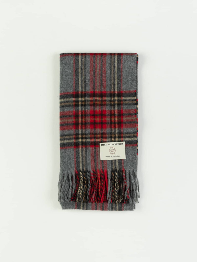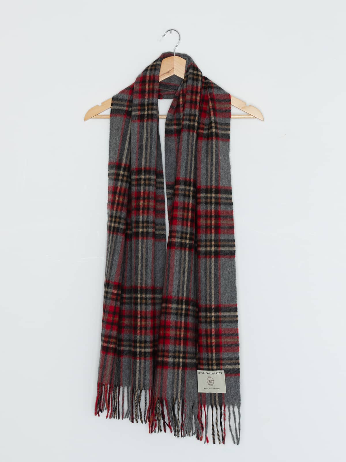 This scarf captures the quiet drama of a winter woodland, with storm grey melange forming a soft, misty backdrop for vibrant holly berry red highlights. Subtle accents of black, dried grass beige, and bracken brown evoke earthy textures and natural depth. Its smooth Merino weave wraps you in understated warmth with a touch of festive charm.