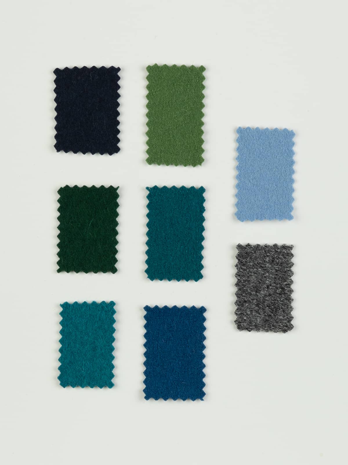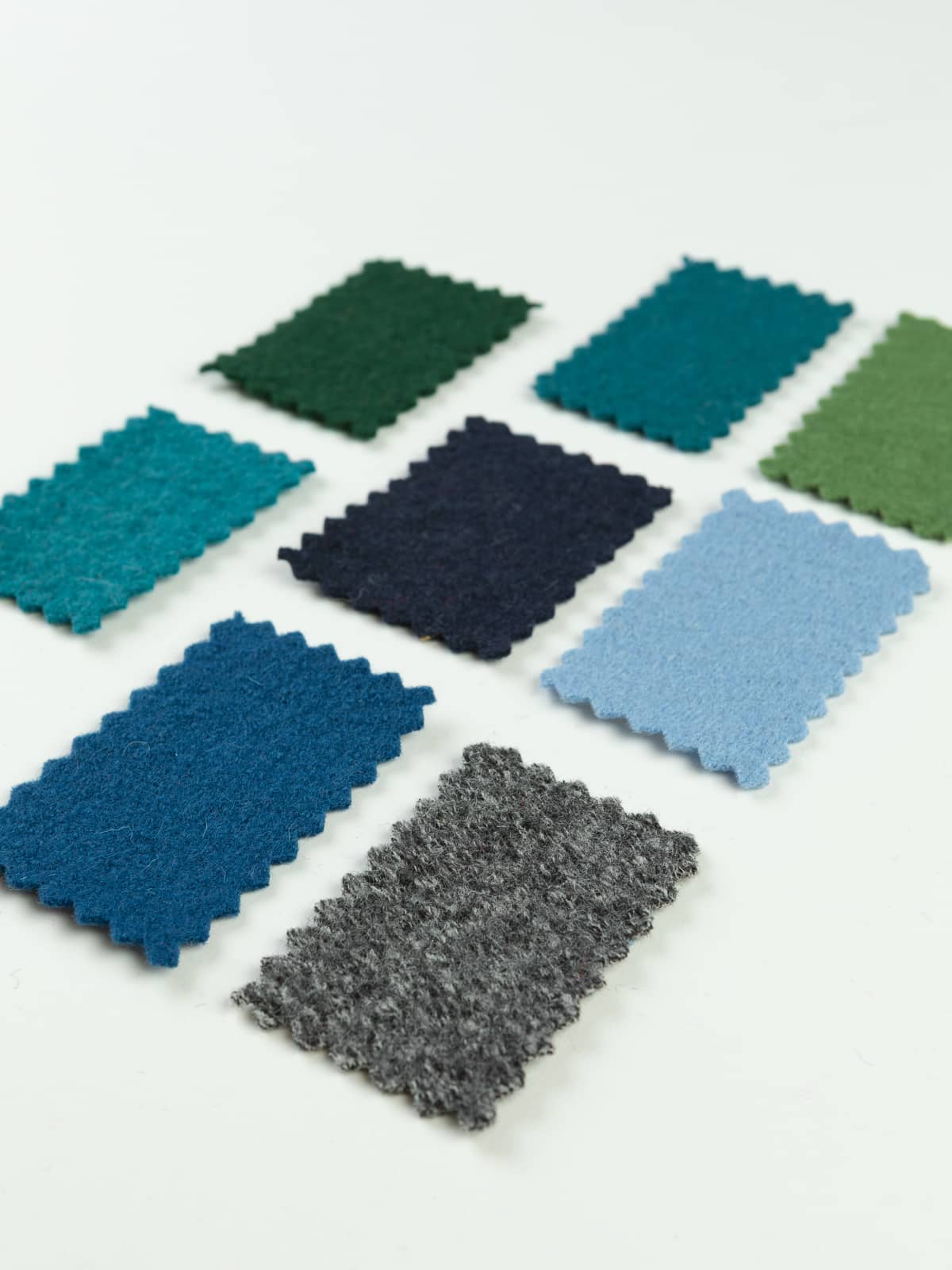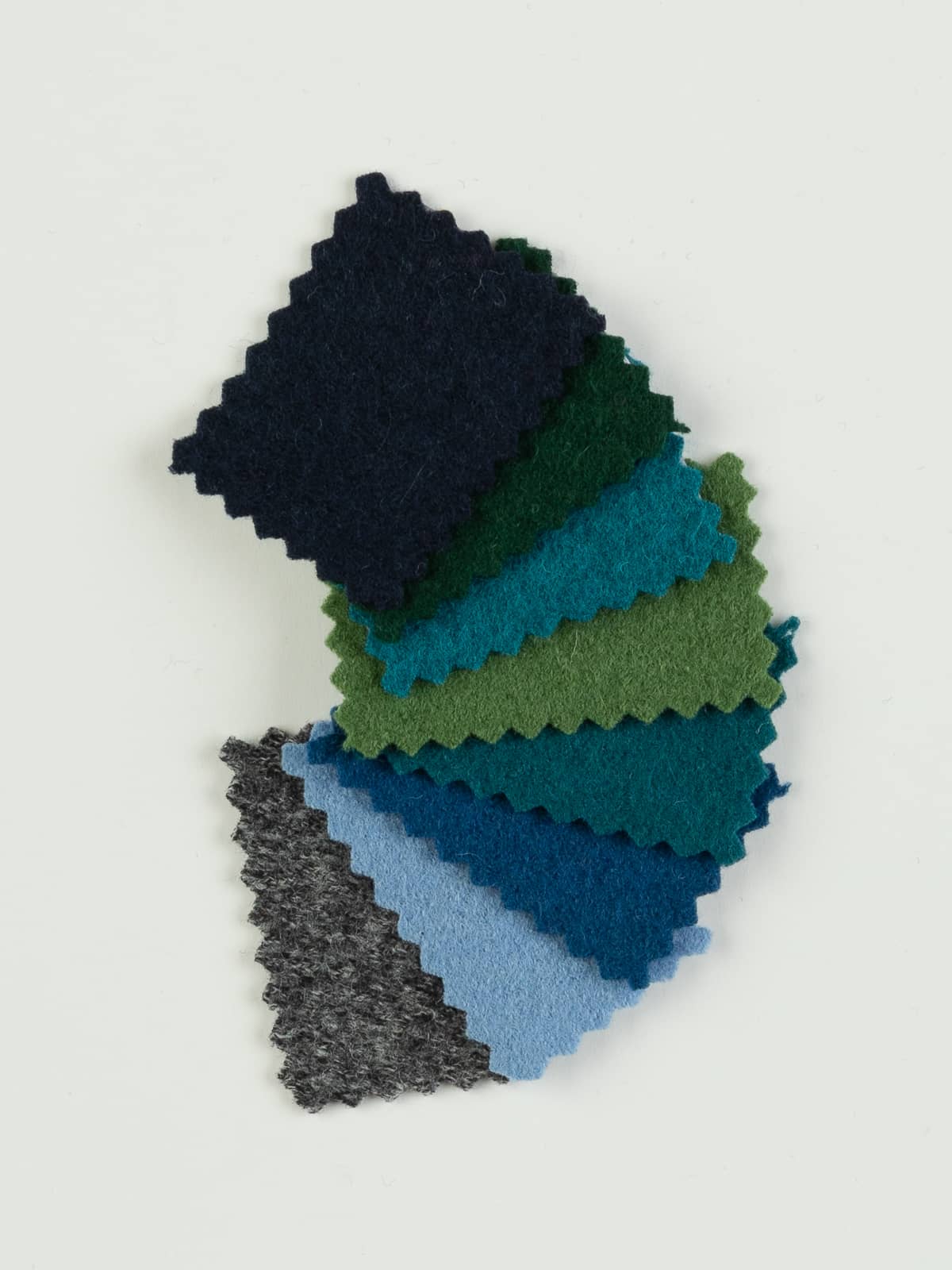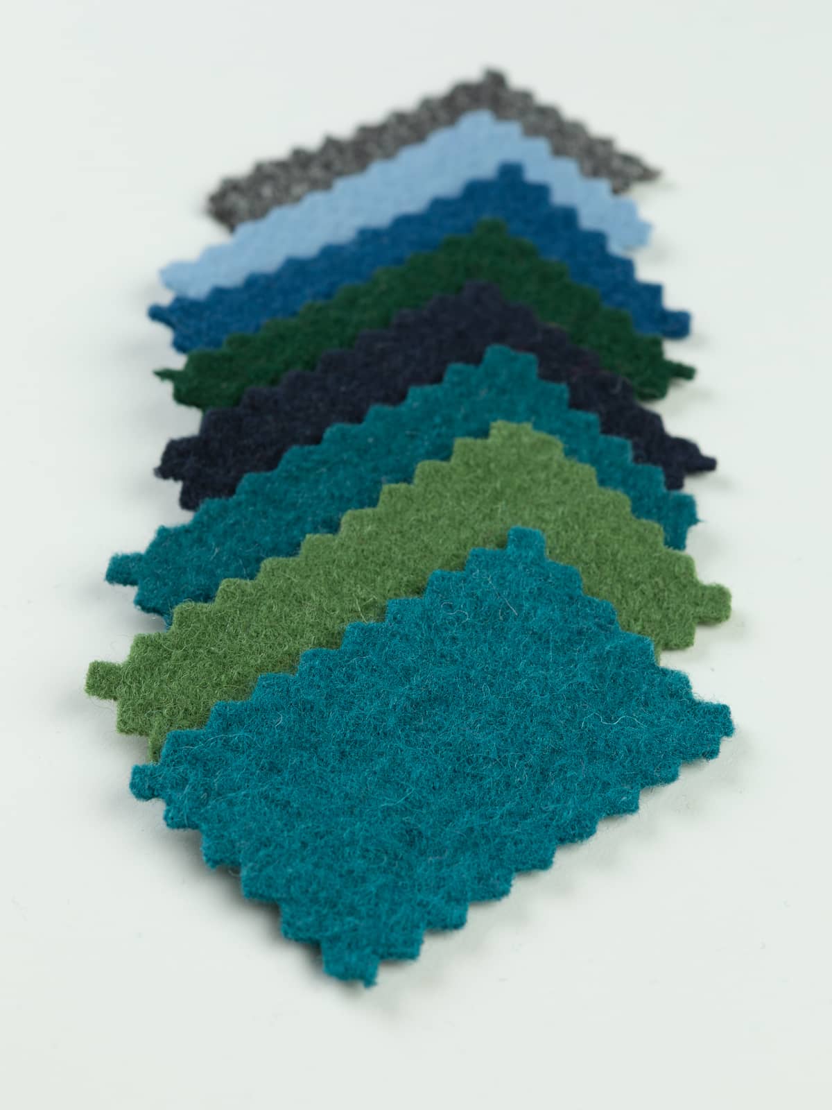 Samples Included: This pack contains 8 beautiful Boiled Wool samples in the blues and greens colour group, a curated selection taken from the full collection of 17 colours.