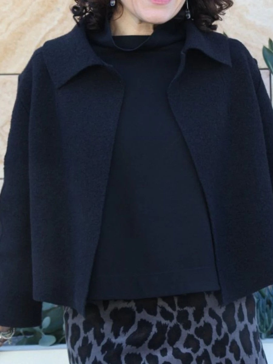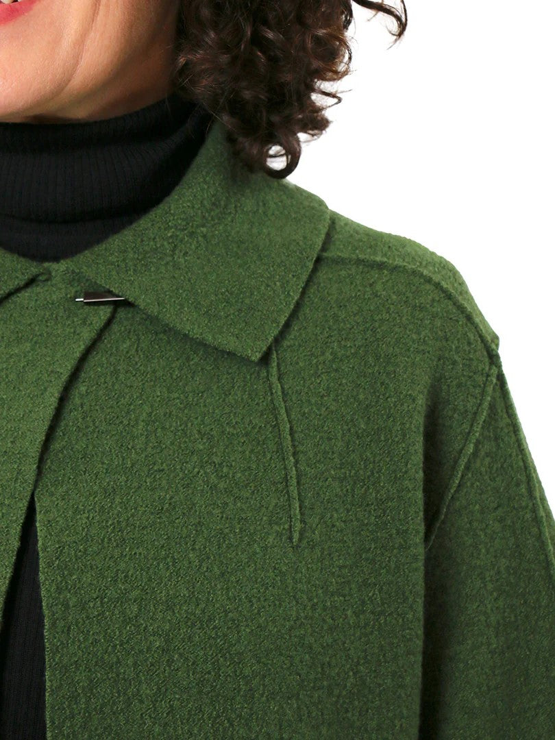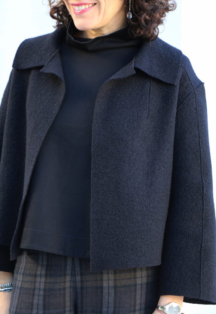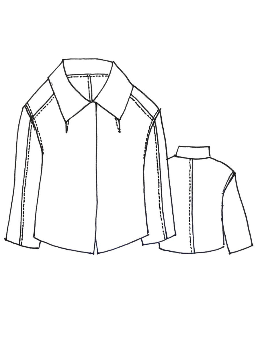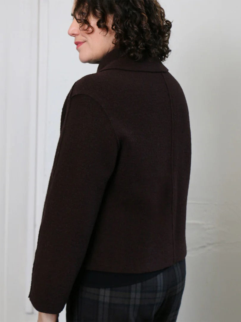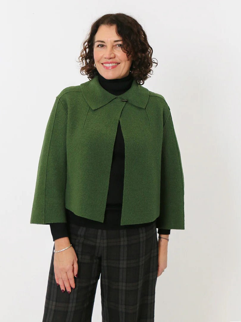 The cropped & boxy Verona Jacket features extended shoulders, a peaked hemline at the front, a collar, front shoulder darts and two-piece bracelet-length sleeves. This jacket can be worn open or secured at the neck with a decorative pin. A quick and easy sew and perfect layering piece for the autumn/winter months. As seams are overlapped, and edges and hems are left raw, the Verona Jacket is best made up in boiled felted wools or wool/blends.