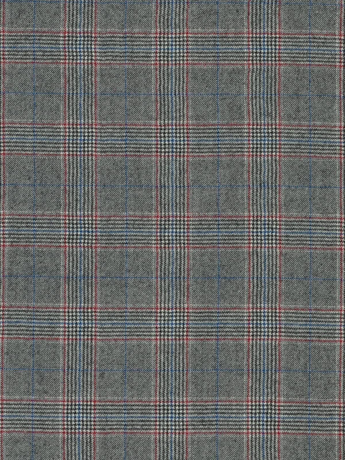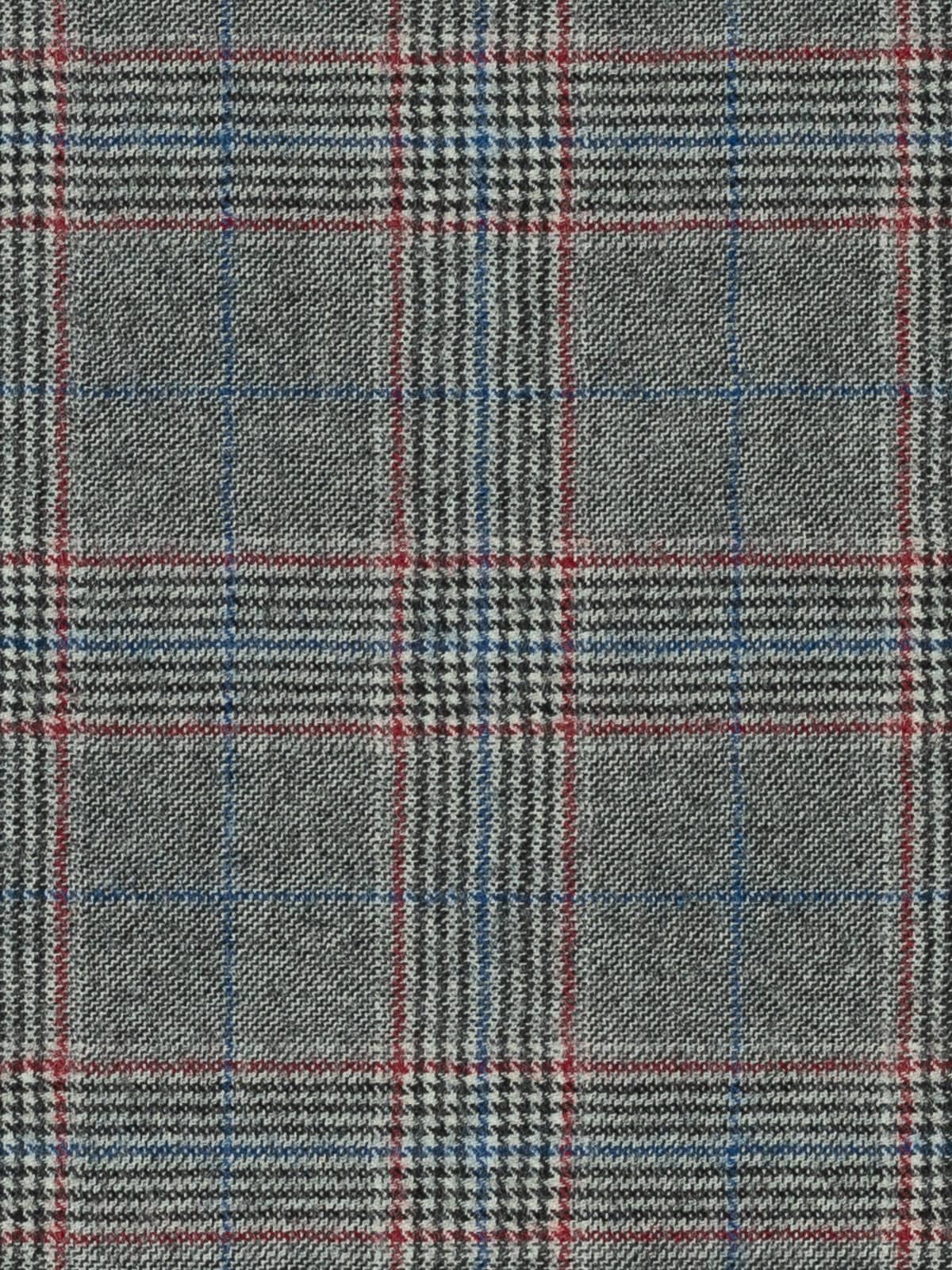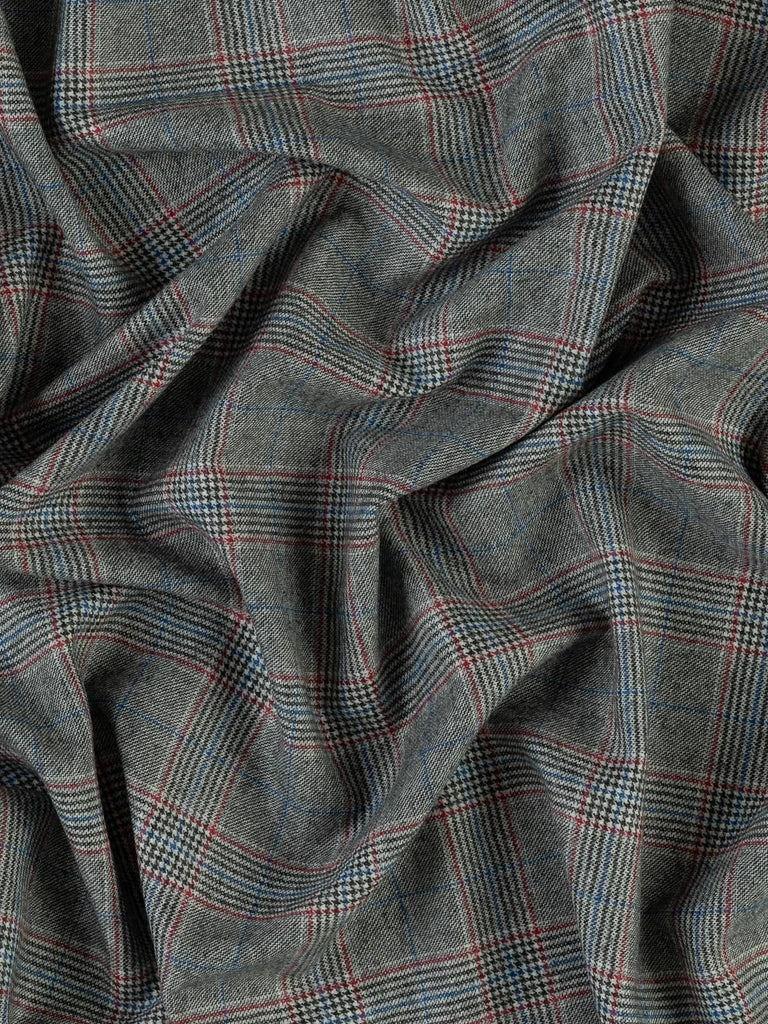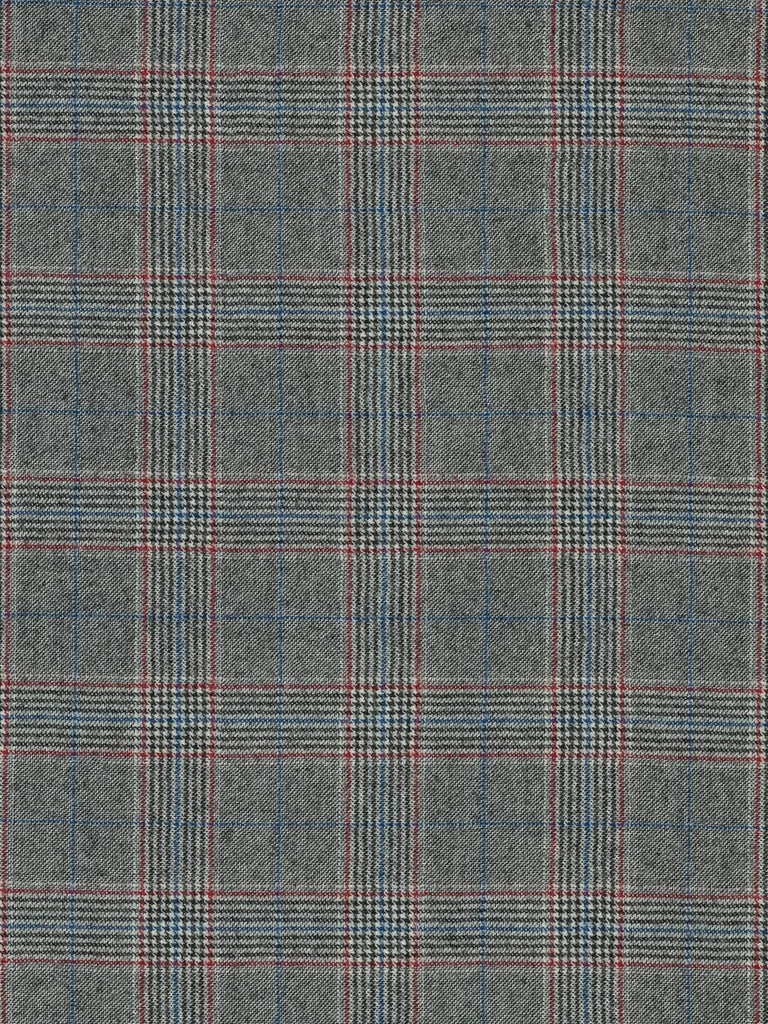 A monochrome palette of black and white forms the base of this Glenn Plaid, accentuated with deep berry red detailing and cobalt blue overchecks, adding a complementary pop of colour to the classic appearance.
