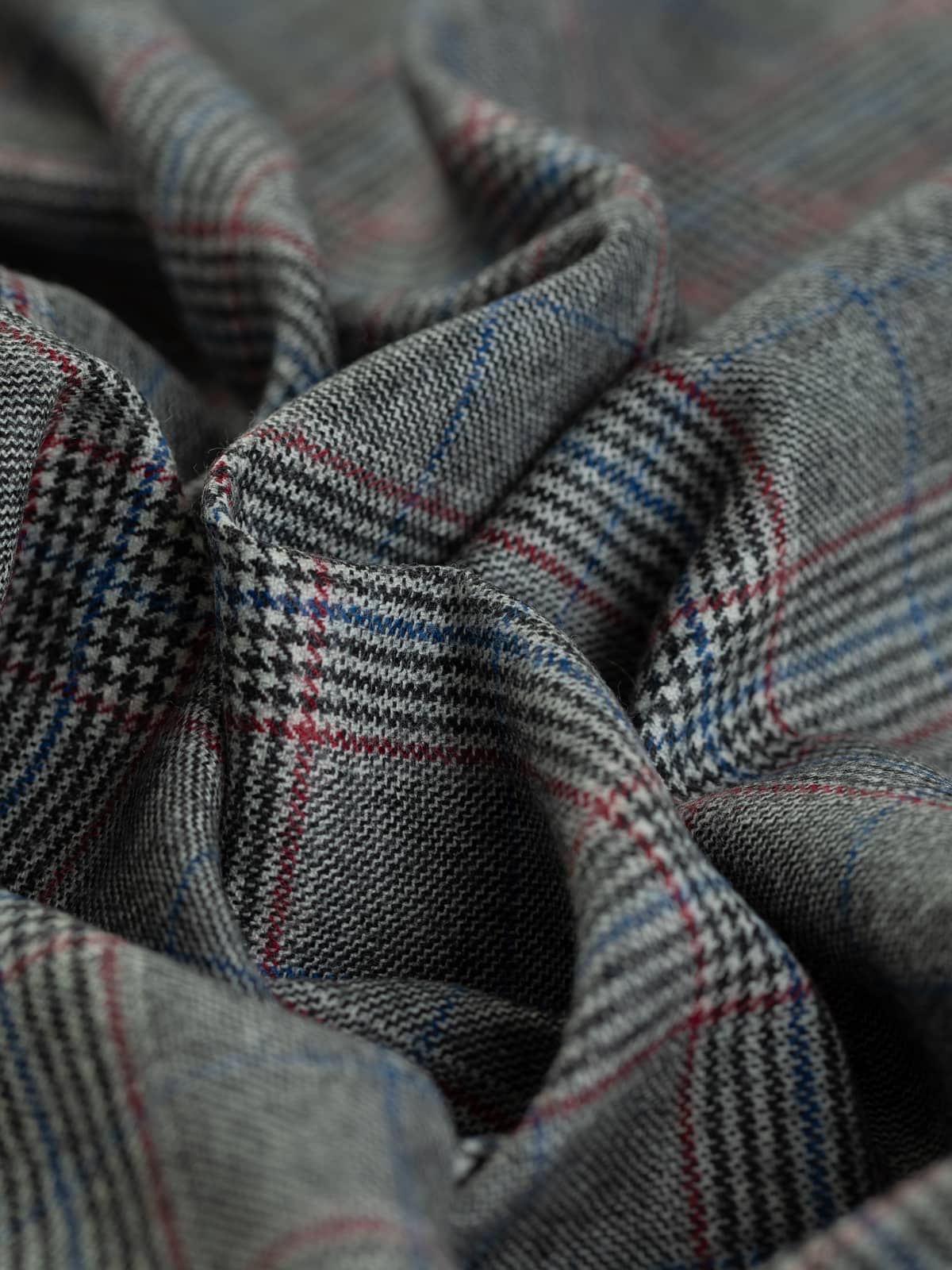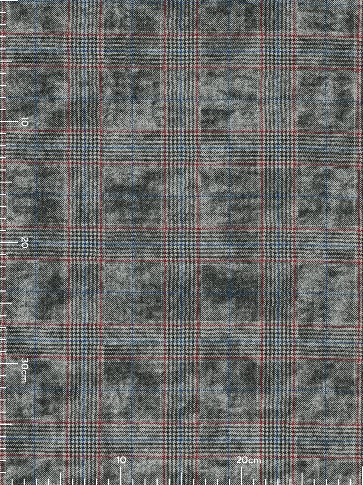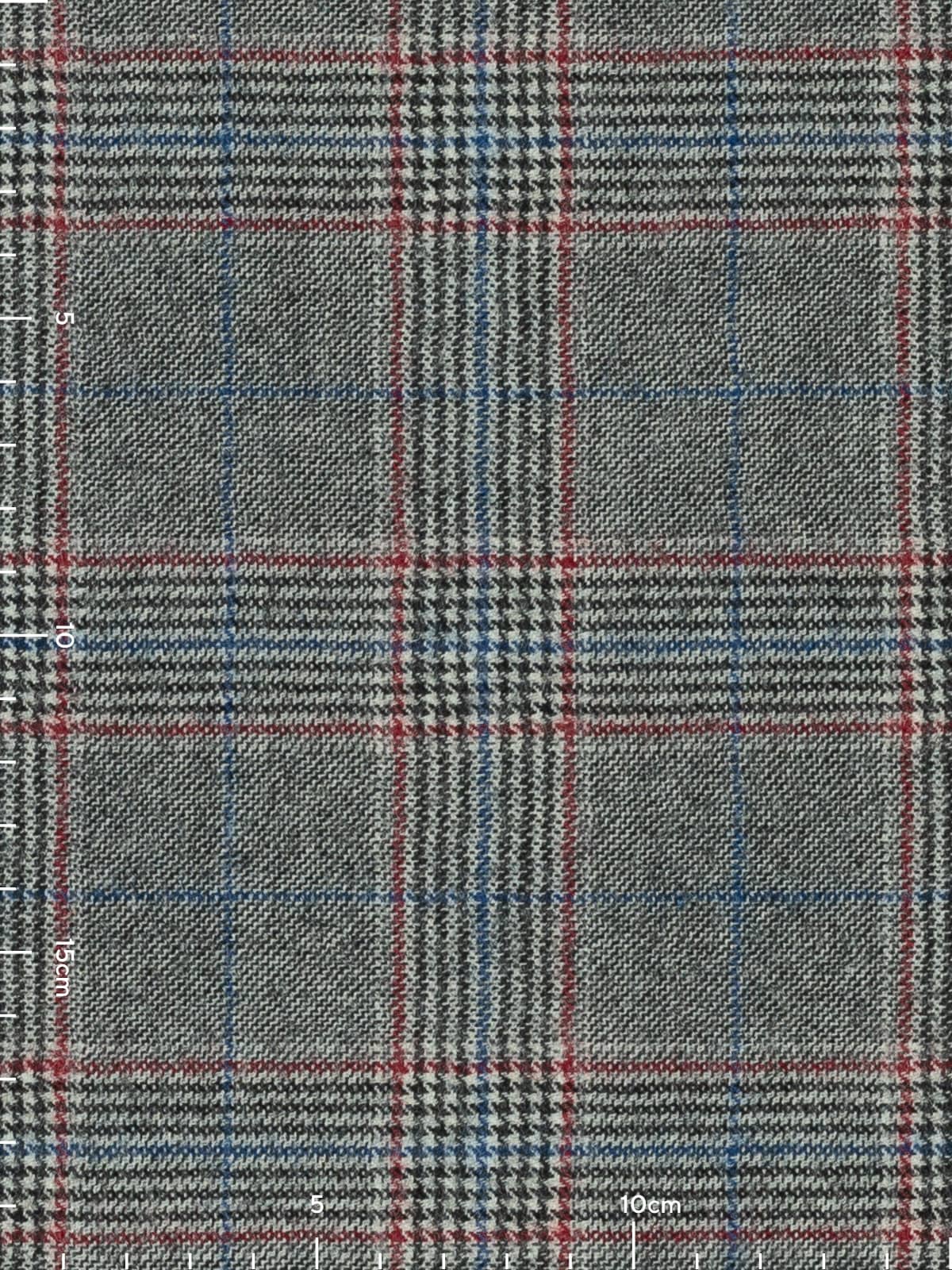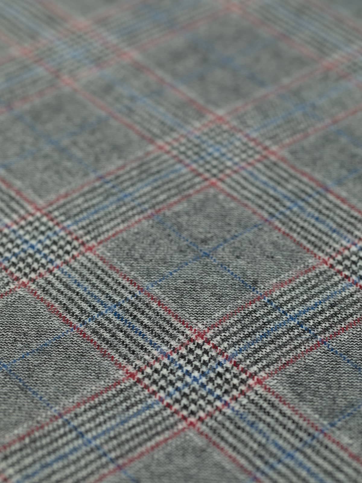 A monochrome palette of black and white forms the base of this Glenn Plaid, accentuated with deep berry red detailing and cobalt blue overchecks, adding a complementary pop of colour to the classic appearance.