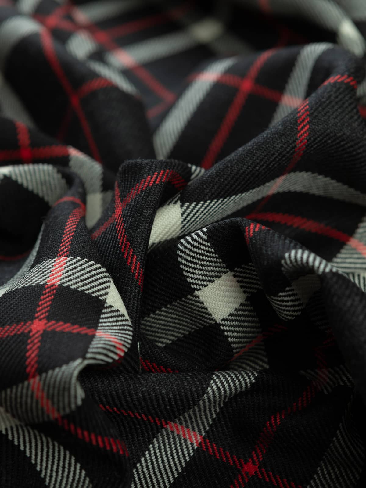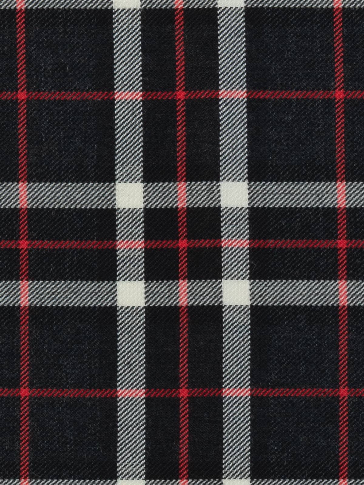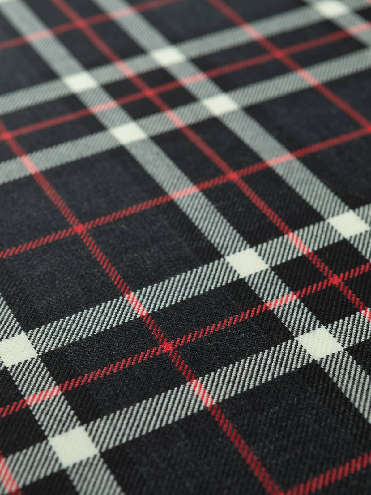 Shades: A cool monochromatic palette built on deep charcoal grey and black, brightened by clean white overchecks. Scarlet red pinstripes provide a sharp contrast, giving the tartan a crisp, modern edge. The greyscale foundation creates a neutral, versatile appearance while retaining strong visual clarity.