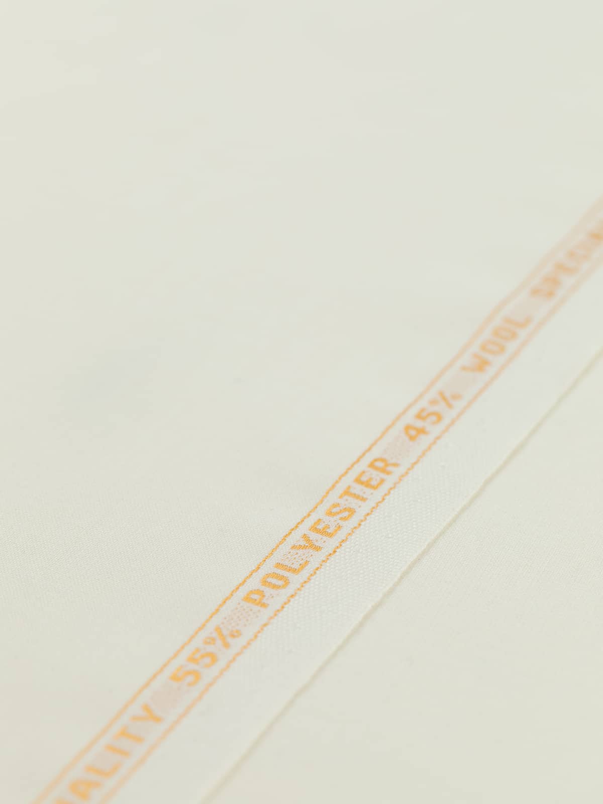 Shade:  This exquisite golden selvedge, fine worsted, uniform fabric features a cool, Classic Ecru hue. This natural cream / white hue evokes images of chic couples strolling in a Mediterranean resort.