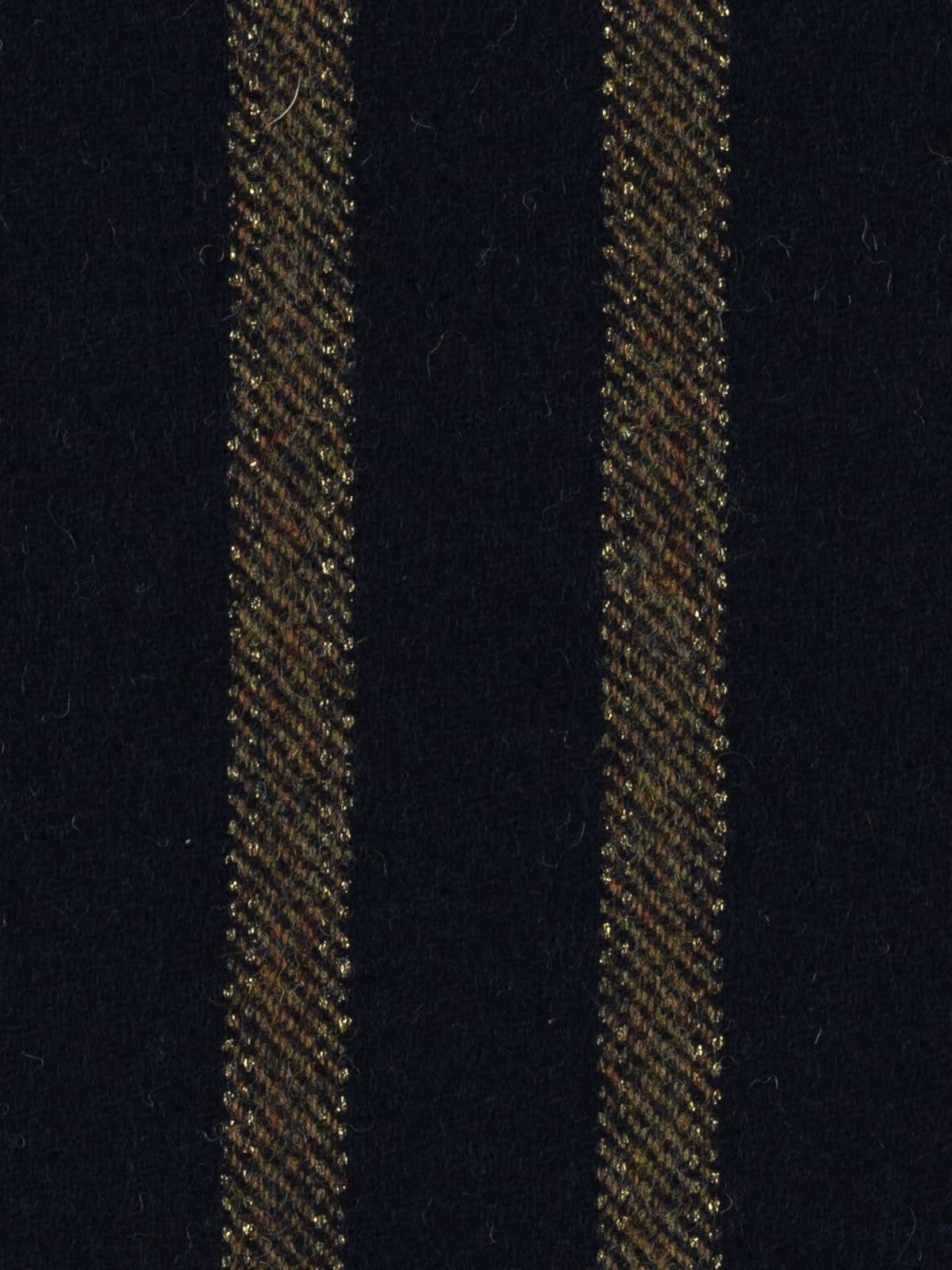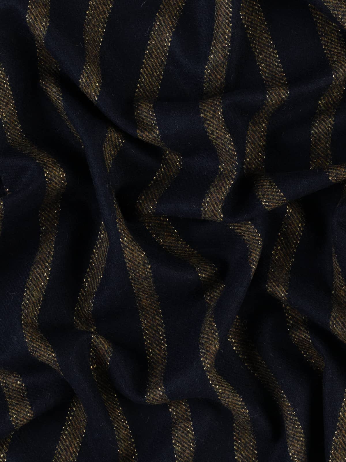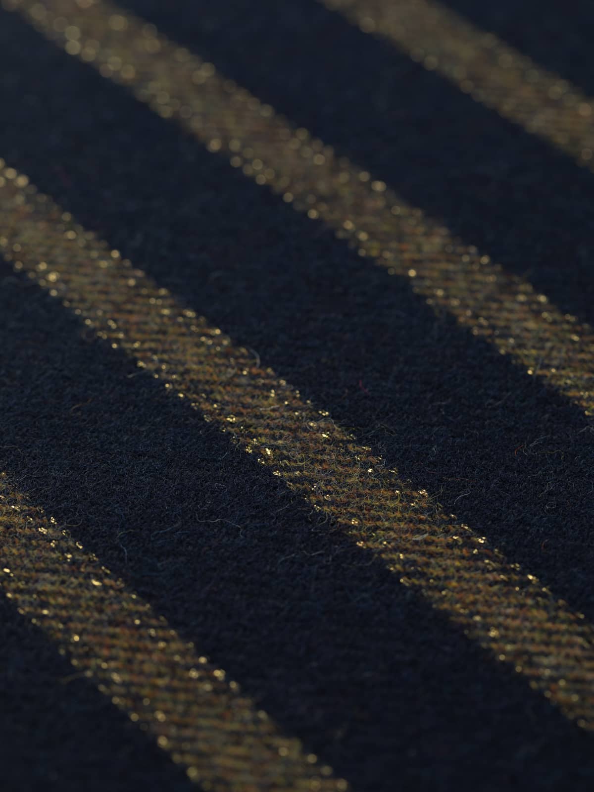 Eclipse Rays boasts a rich base of classic navy, which forms the background for 2cm stripes made up of earthy golden and orange melange tones, framed with 2 fine strips of metallic gold Lurex on the edges of each stripe.