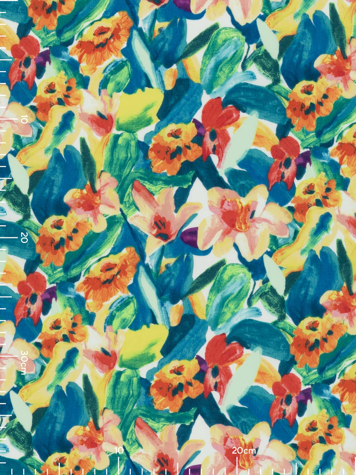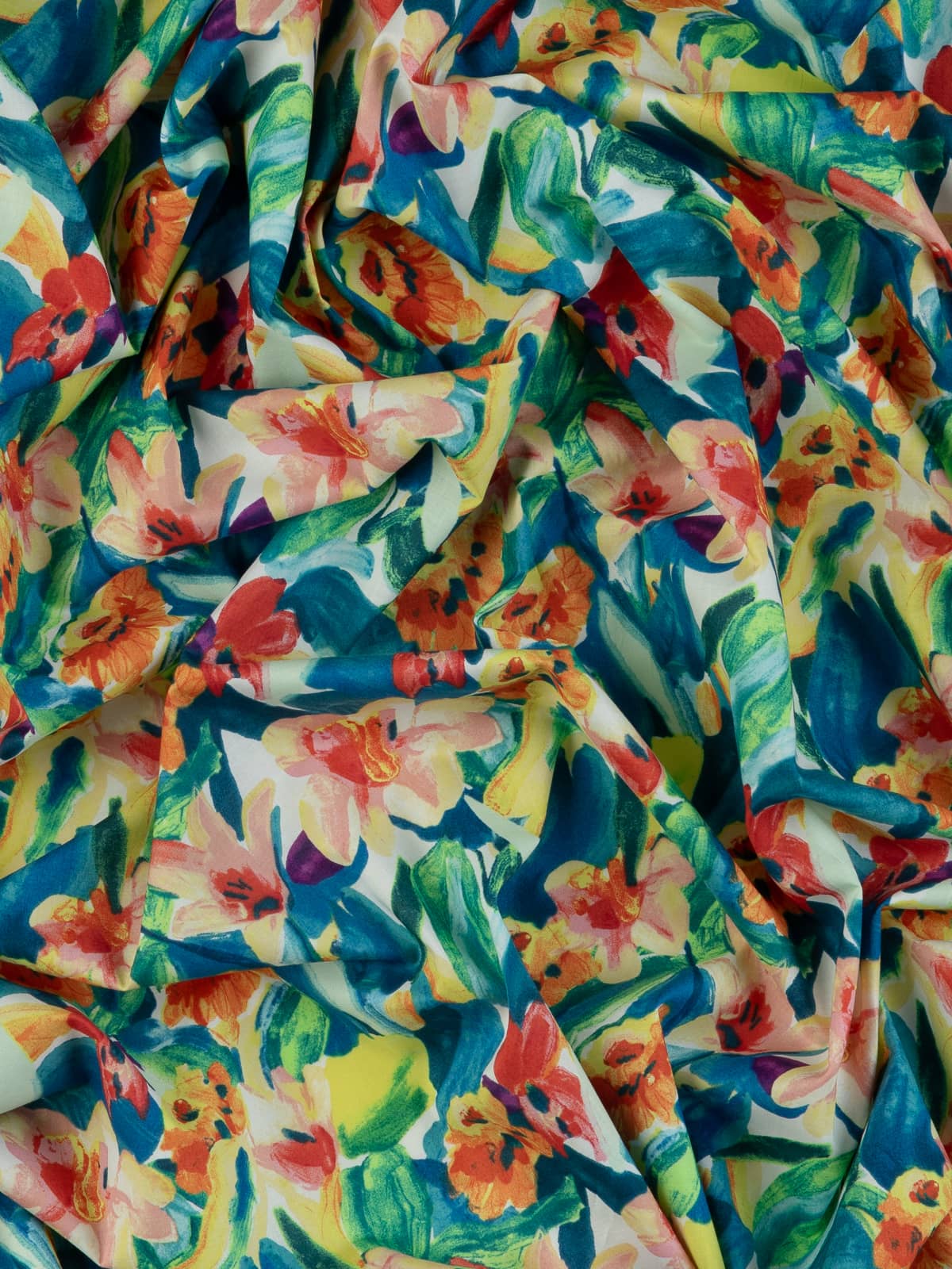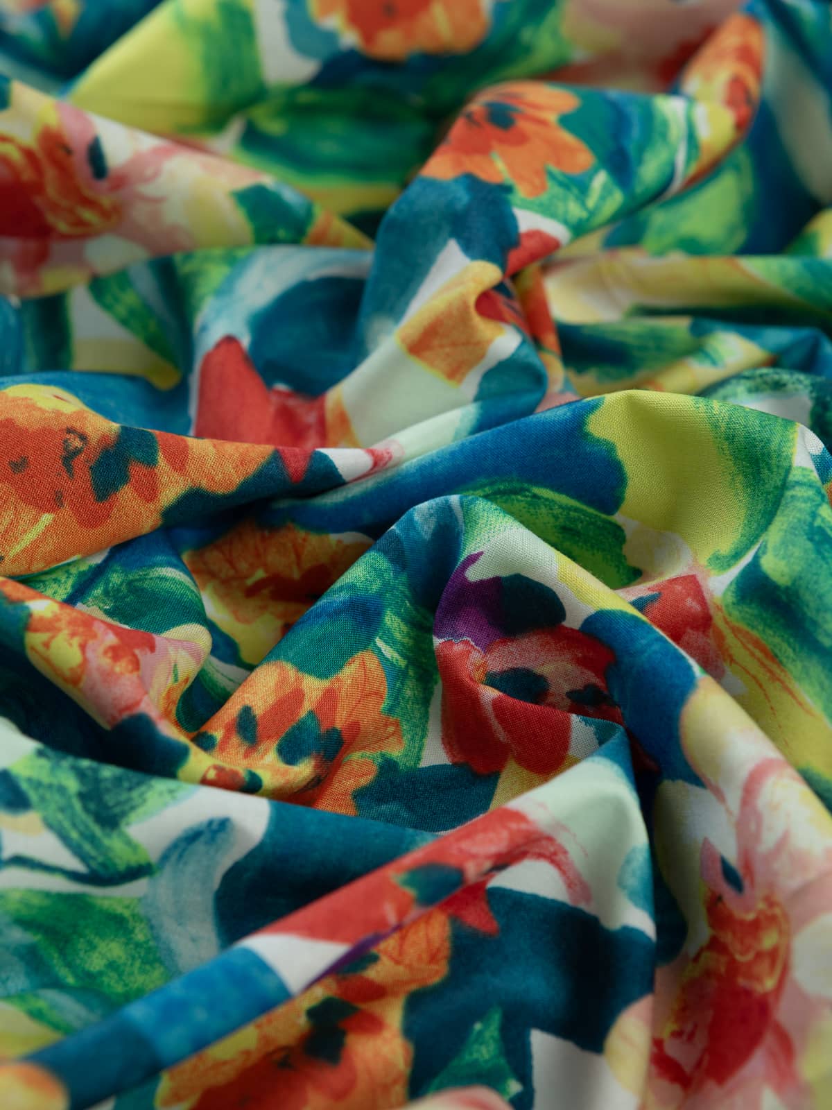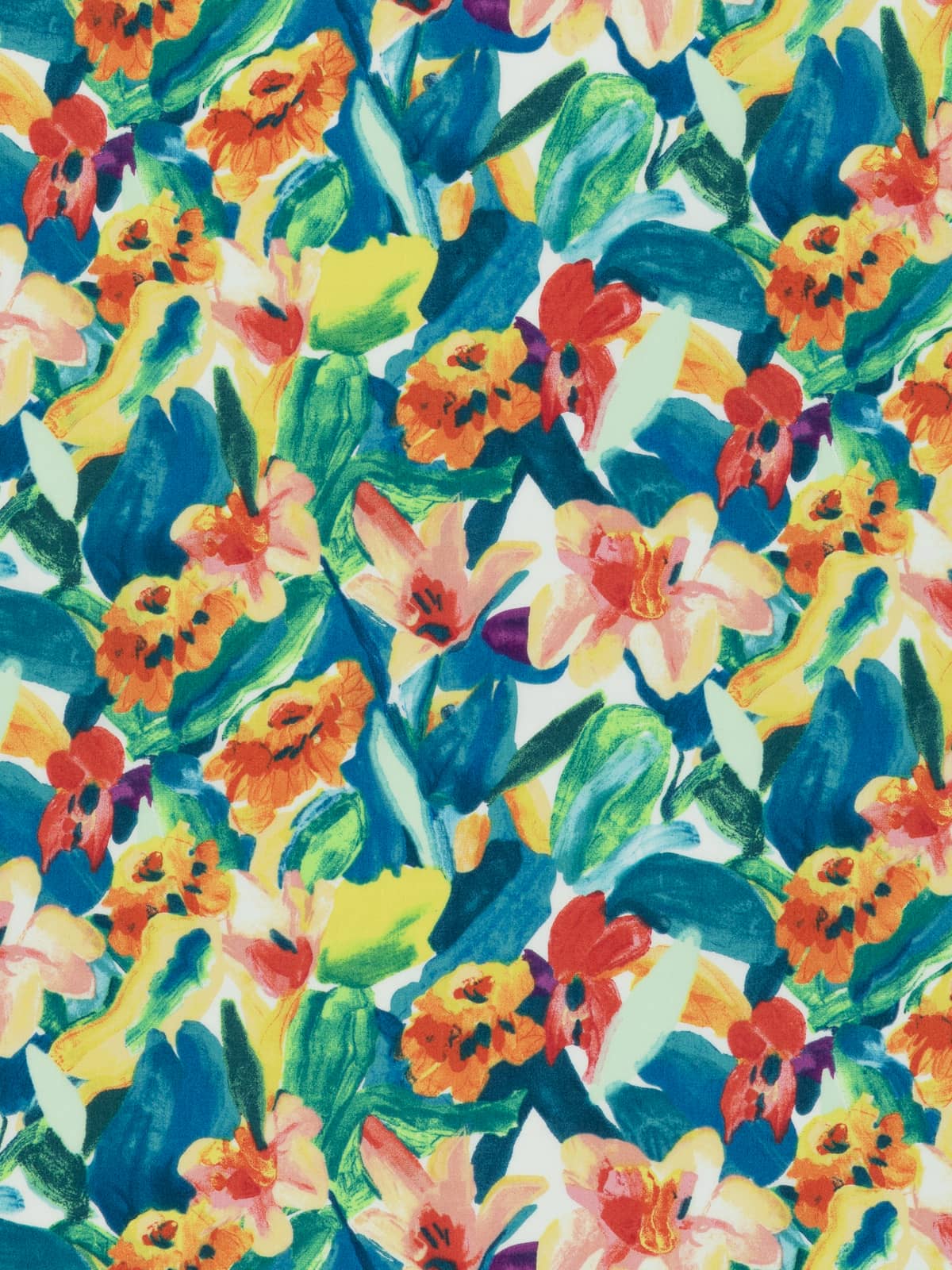 Design: Paint me a picture of paradise, and I would say the design on this Pima lawn is the perfect depiction. Eden’s Brushstroke is a lush, painterly botanical print, vivid, exotic, and full of warmth and movement. Since it’s a cotton lawn, there’s an elegance and lightness to balance the bold palette. A riot of blooms from the lily family jostle for position in this design, from the flushed pink centres of stargazer lilies to the fire hues of Frittliaries, all surrounded by jewel-hued foliage.