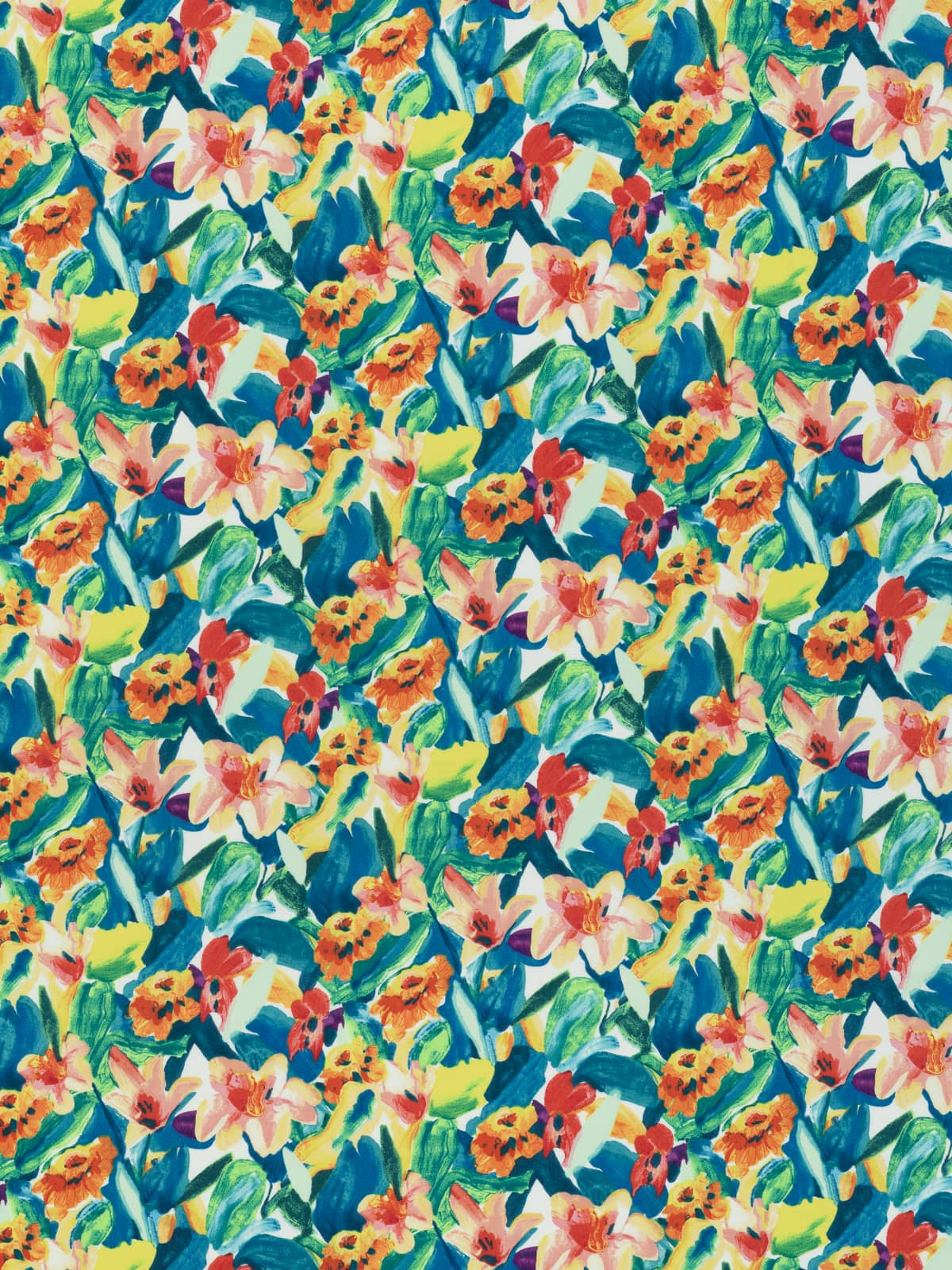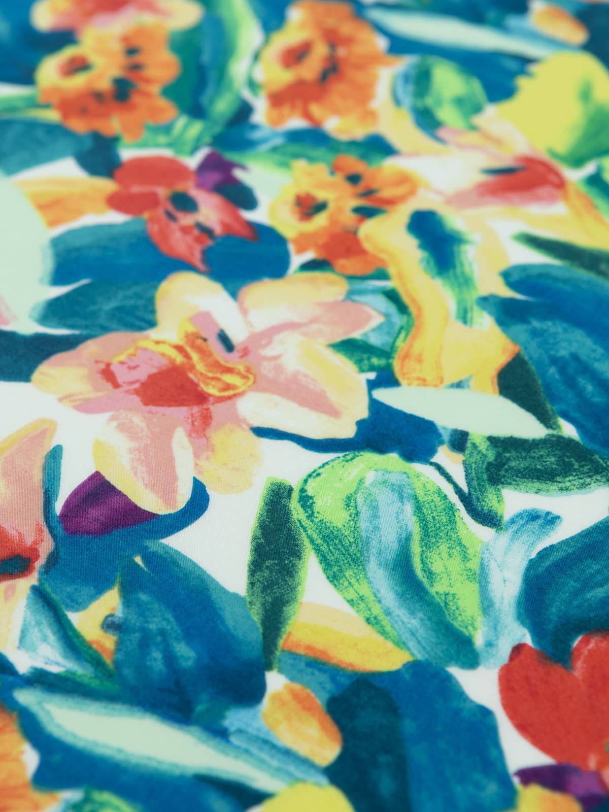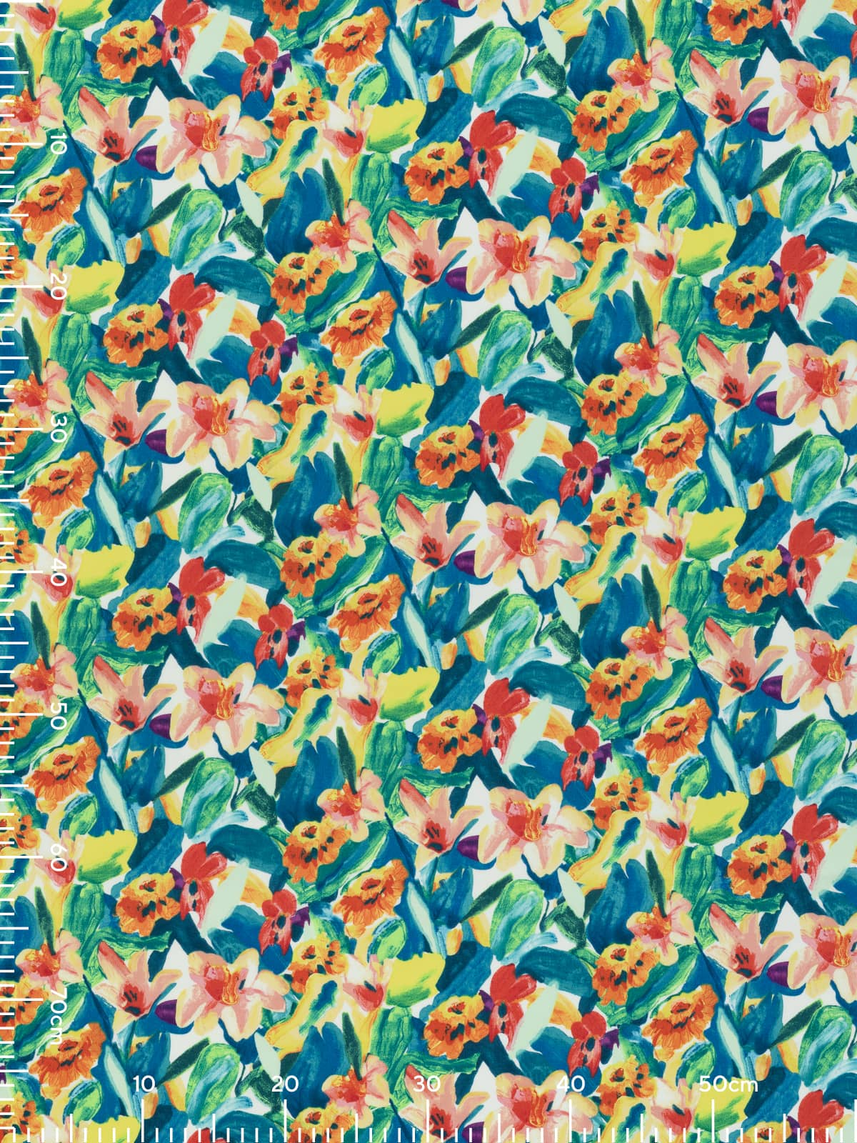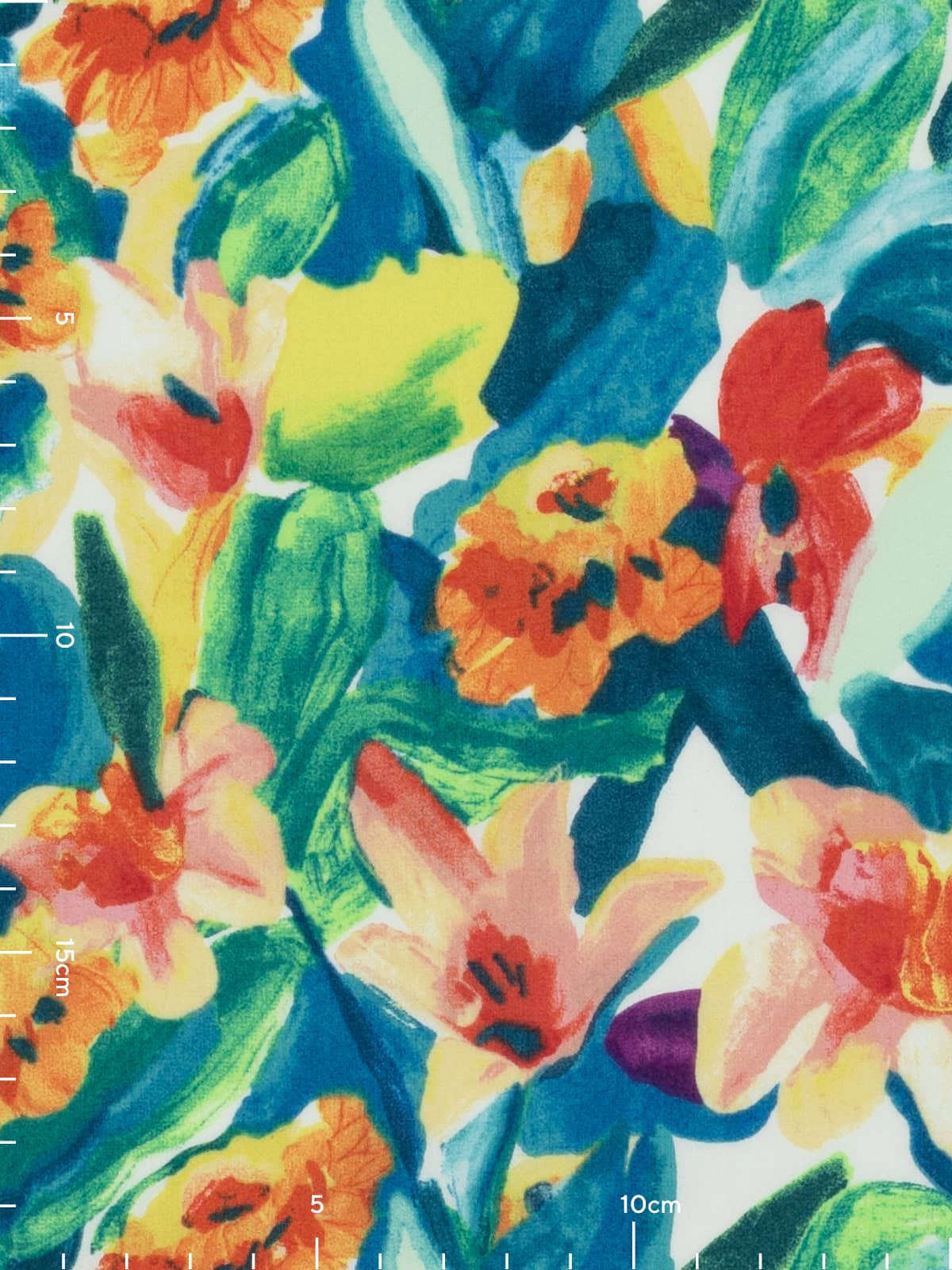 Design: Paint me a picture of paradise, and I would say the design on this Pima lawn is the perfect depiction. Eden’s Brushstroke is a lush, painterly botanical print, vivid, exotic, and full of warmth and movement. Since it’s a cotton lawn, there’s an elegance and lightness to balance the bold palette. A riot of blooms from the lily family jostle for position in this design, from the flushed pink centres of stargazer lilies to the fire hues of Frittliaries, all surrounded by jewel-hued foliage.