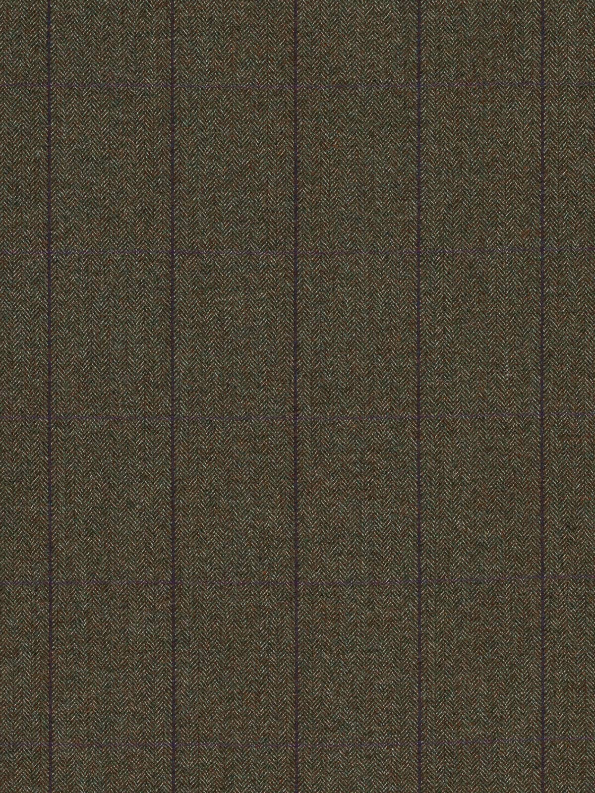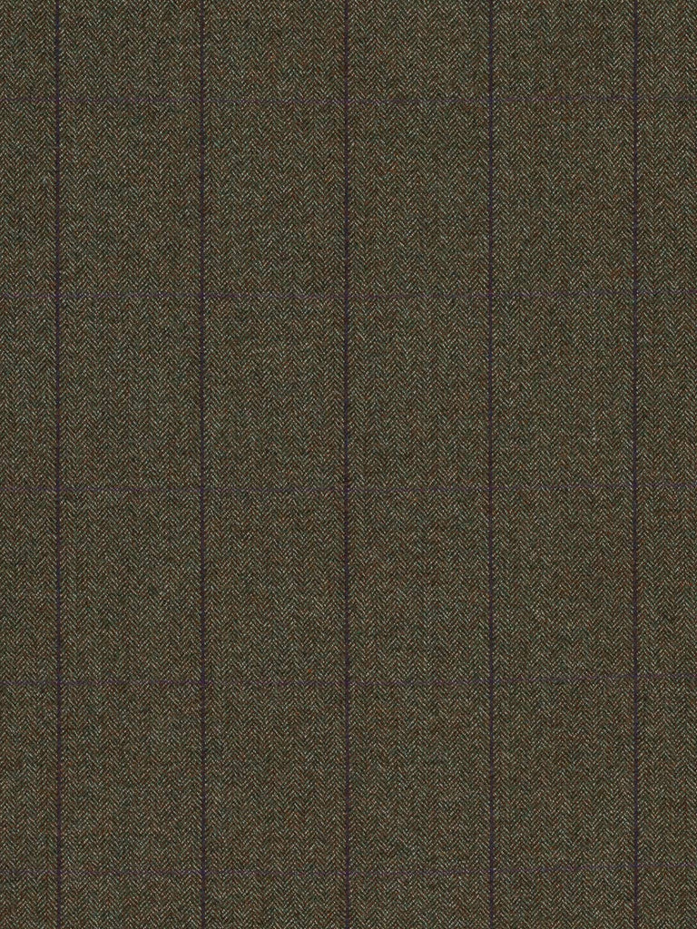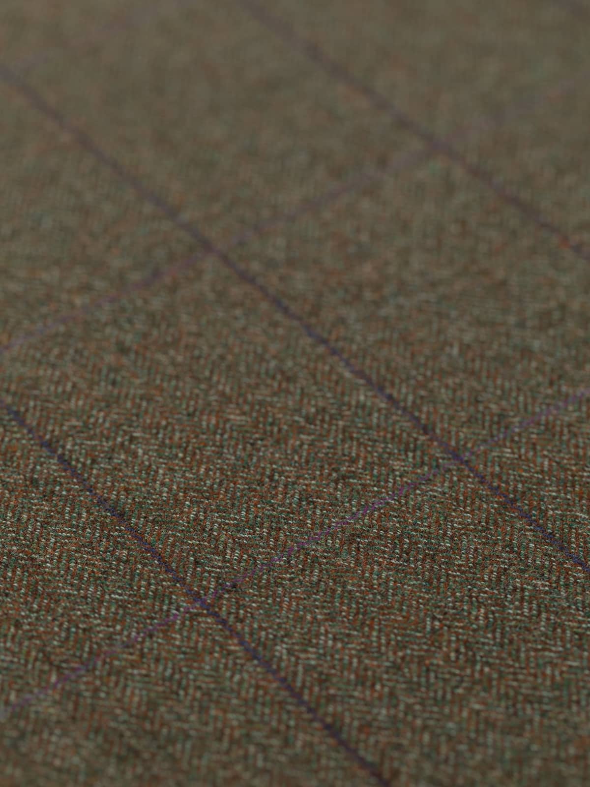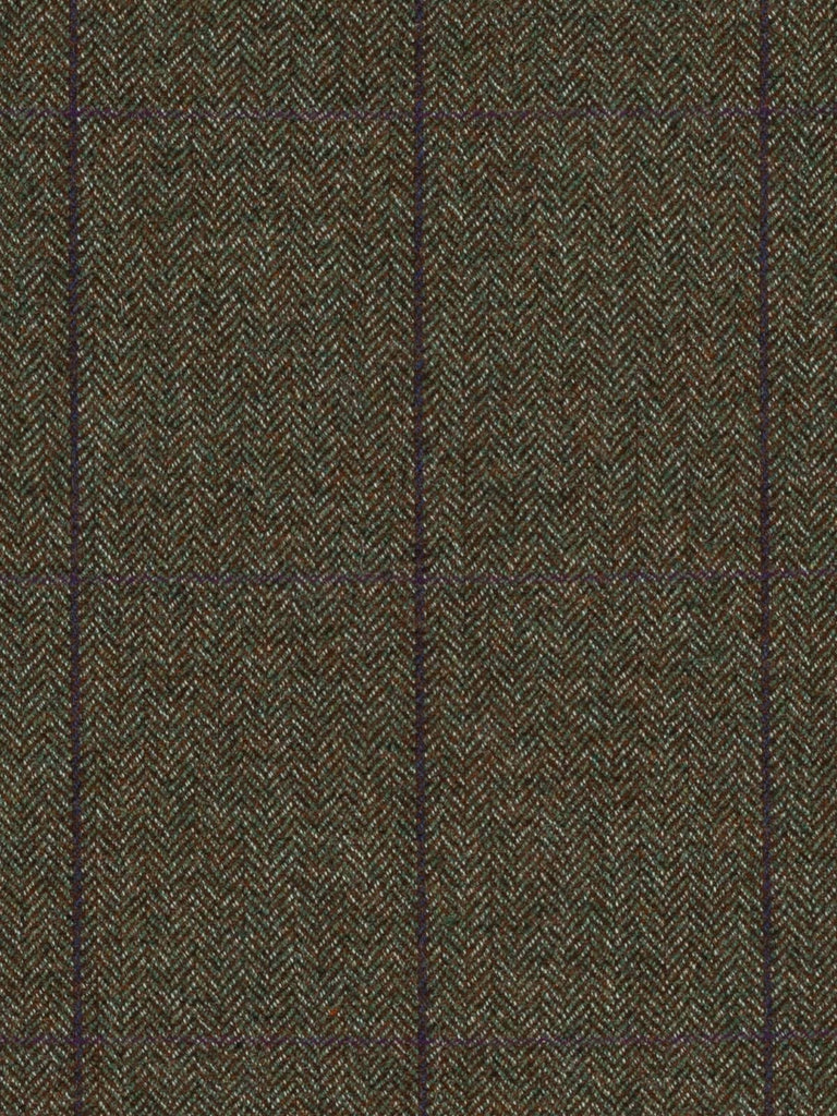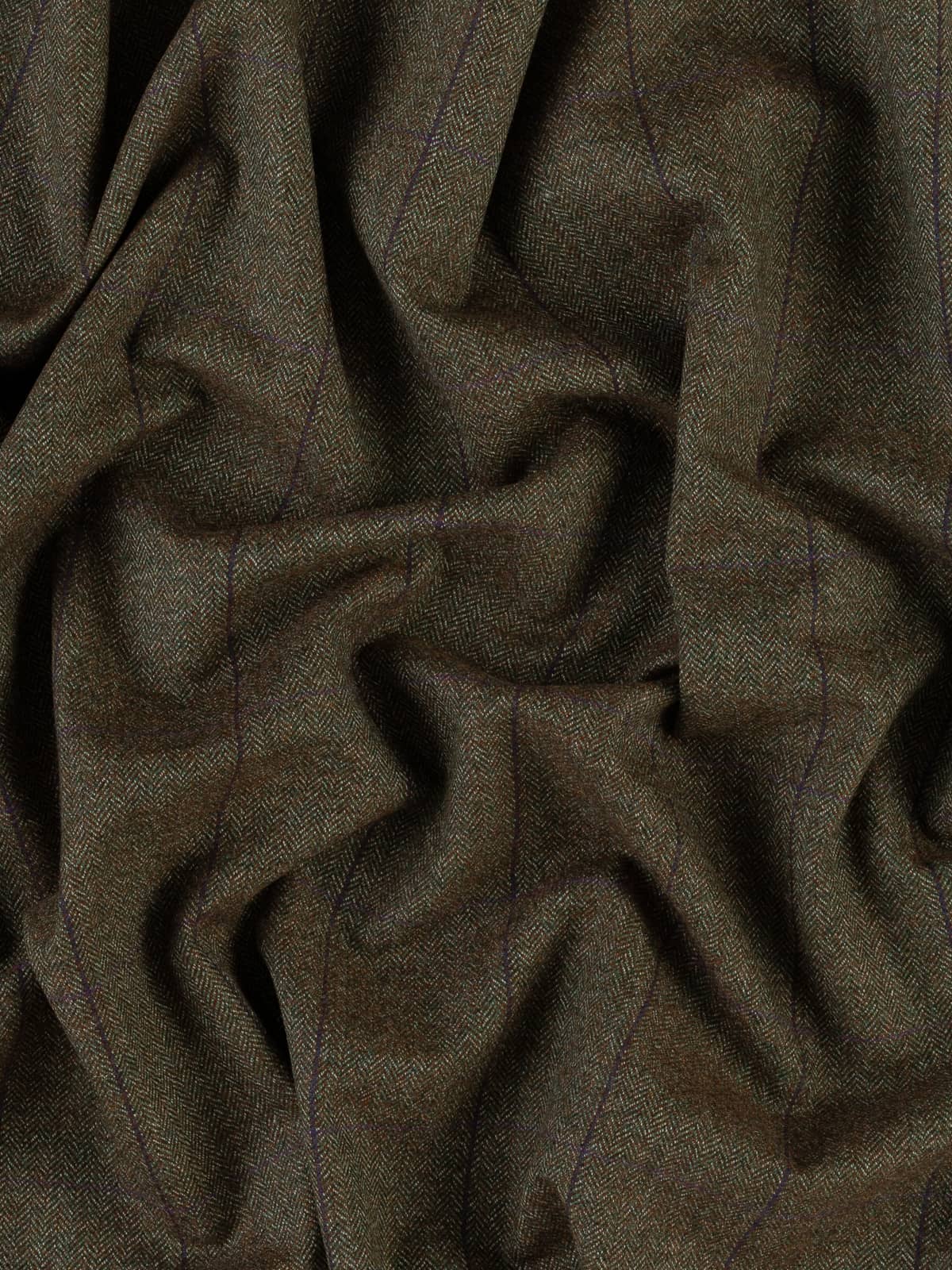 Plum Orchards boast a natural, tweedy palette of chestnut brown, moss green and white marl. These yarns form a classic herringbone design which create a backdrop to windowpane overcheck, with a deep purple/blue following the warp and a subtle rich, plum purple following the weft.