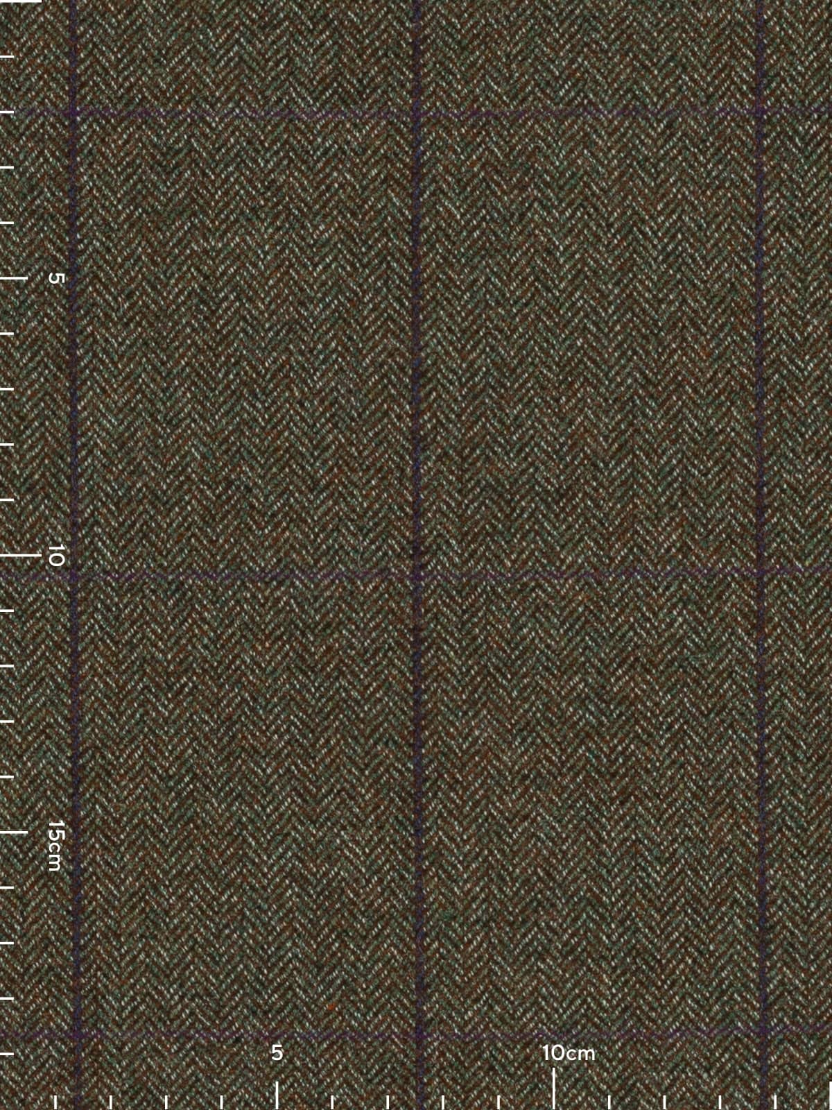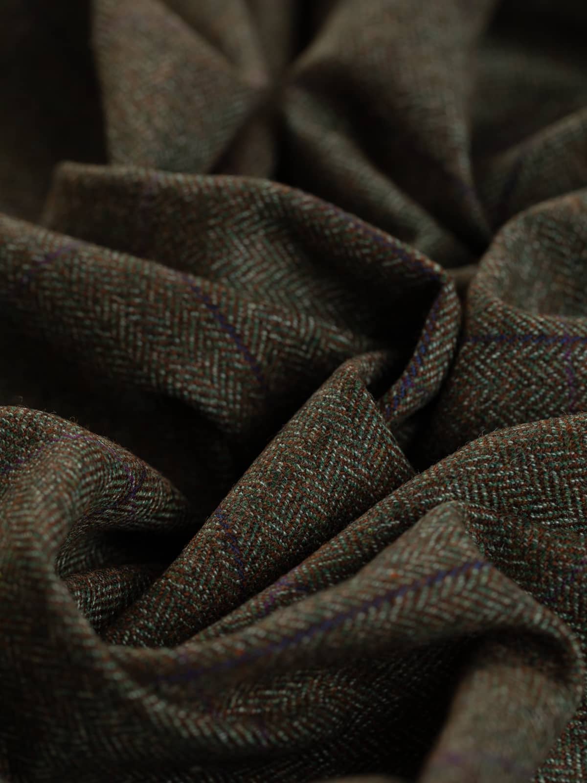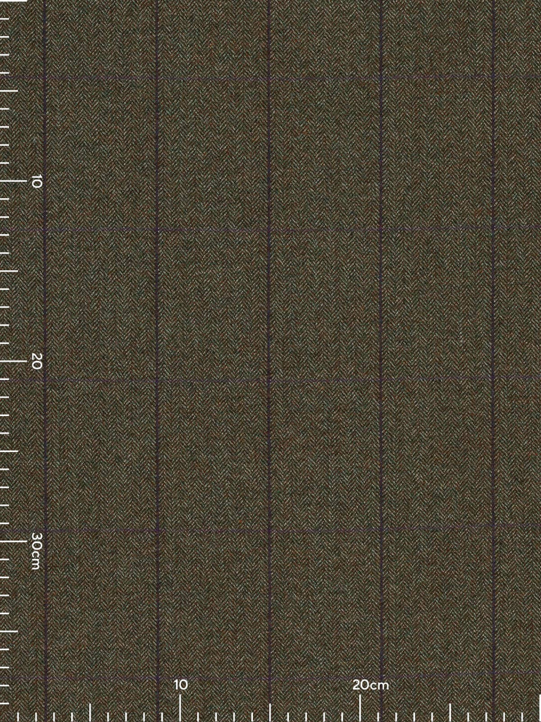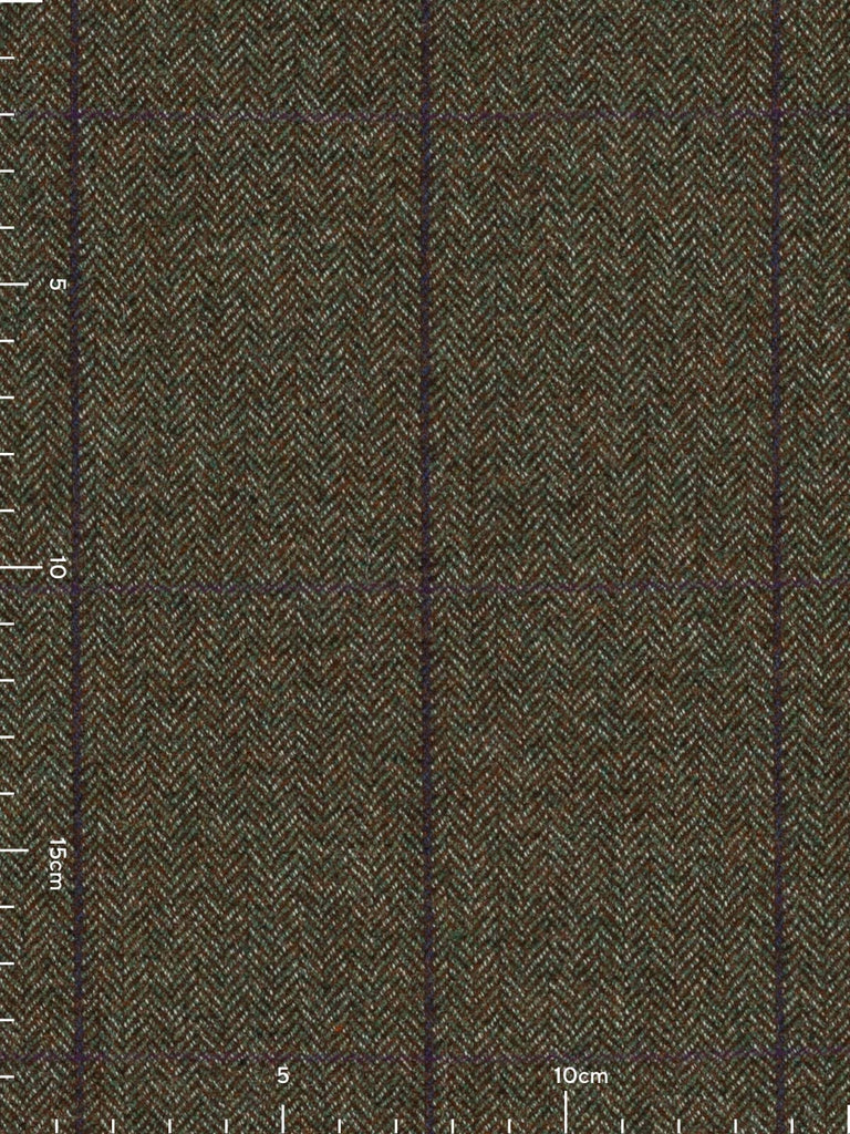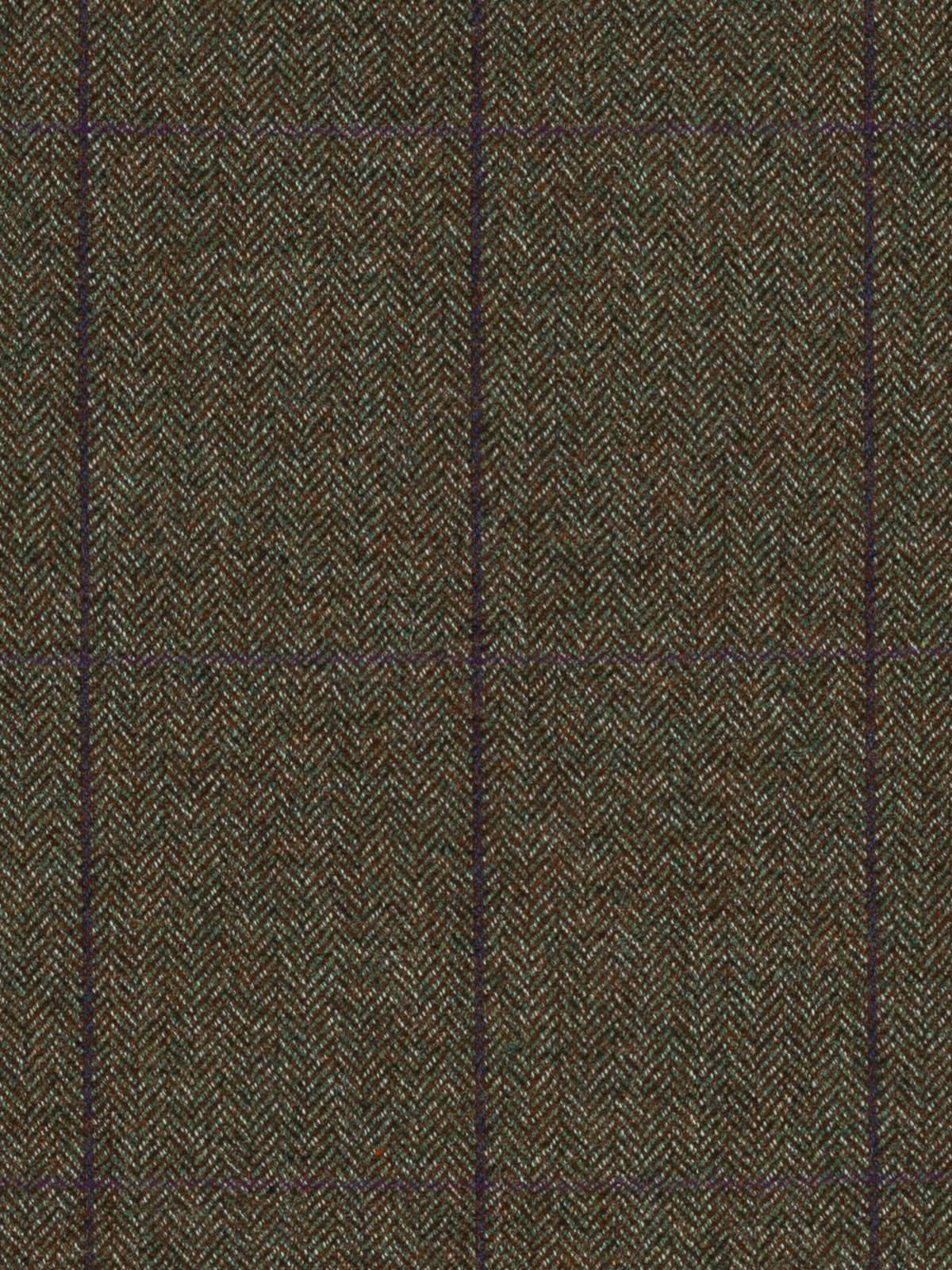 Plum Orchards boast a natural, tweedy palette of chestnut brown, moss green and white marl. These yarns form a classic herringbone design which create a backdrop to windowpane overcheck, with a deep purple/blue following the warp and a subtle rich, plum purple following the weft.