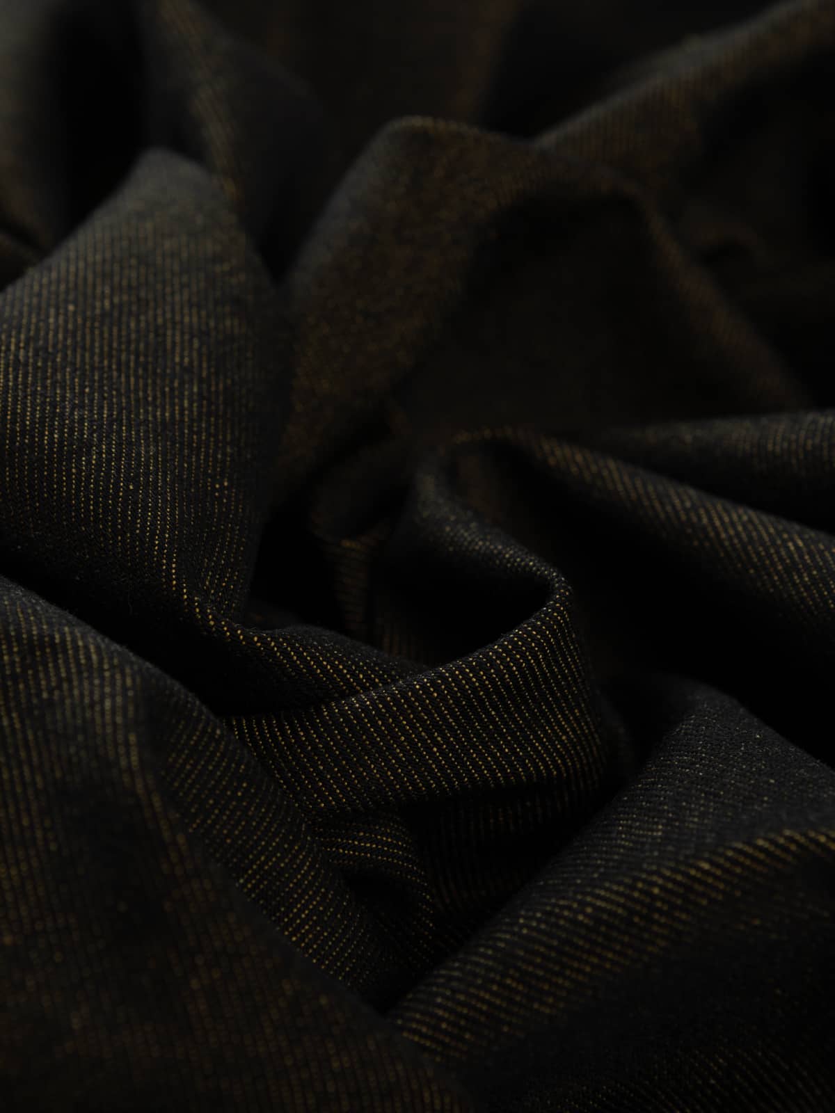 Design: Black cotton warps are woven with golden-mustard weft yarns to create a reversible fabric, with one side showcasing a deep, inky denim tone and the reverse offering a vibrant, golden hue. This dual nature gives the fabric remarkable versatility, ideal for garments that highlight both tones through turned edges, cuffs, and interior details.