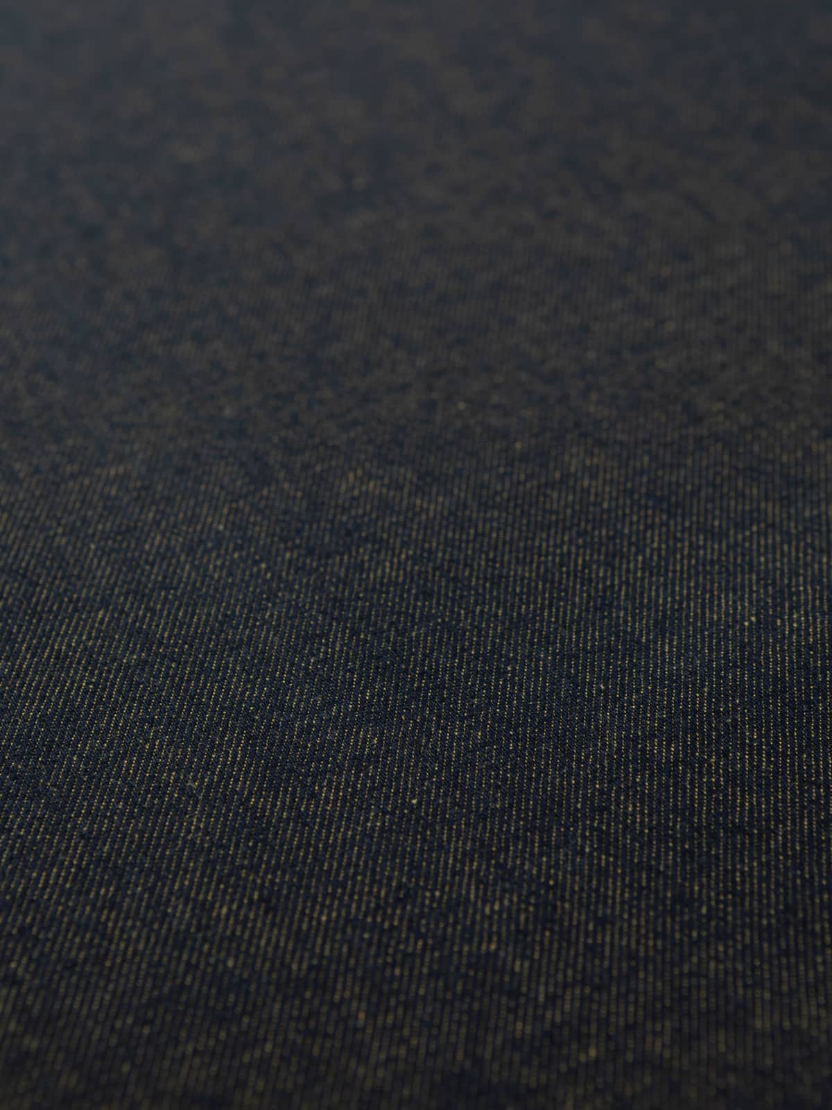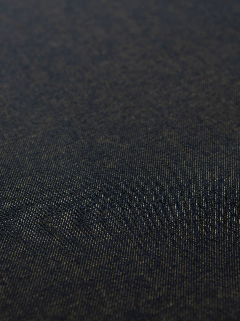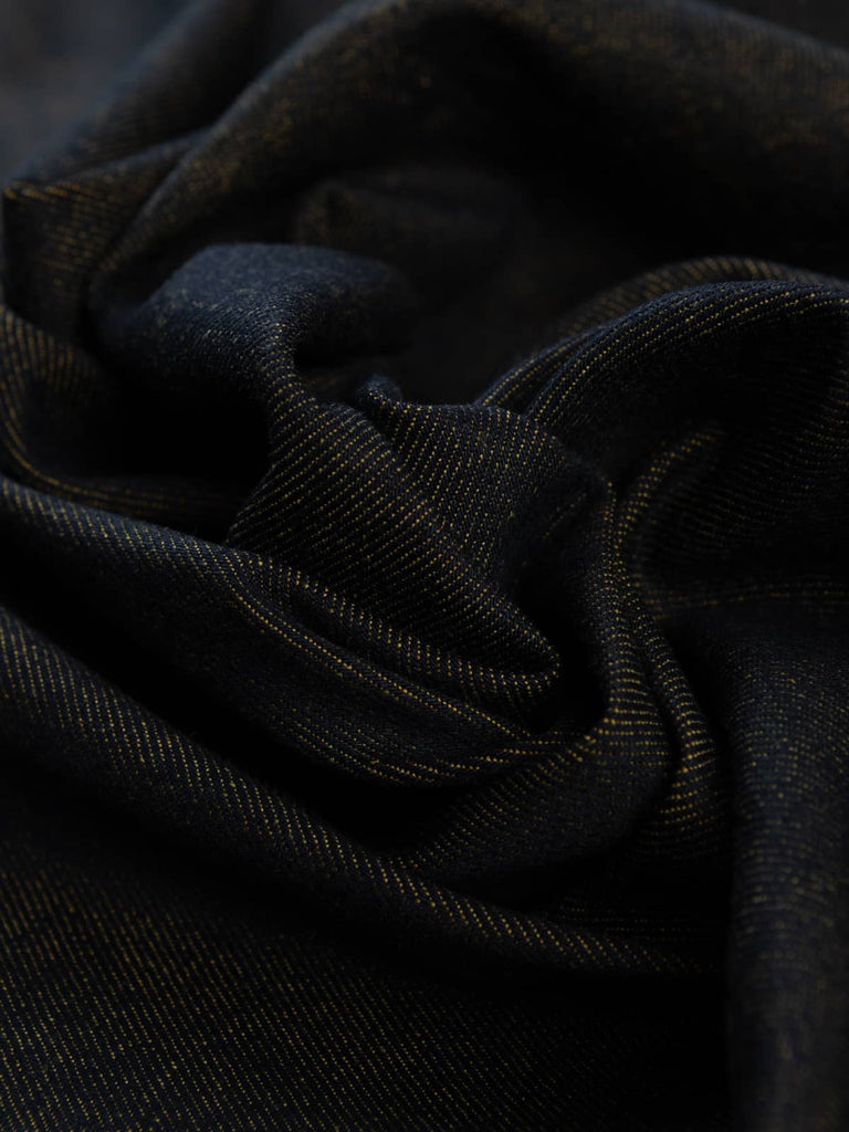 Design: Dark navy cotton warps are woven with golden-mustard weft yarns to create a reversible fabric, with one side showcasing a deep, inky denim tone and the reverse offering a vibrant, golden hue. This dual nature gives the fabric remarkable versatility, ideal for garments that highlight both tones through turned edges, cuffs, and interior details.