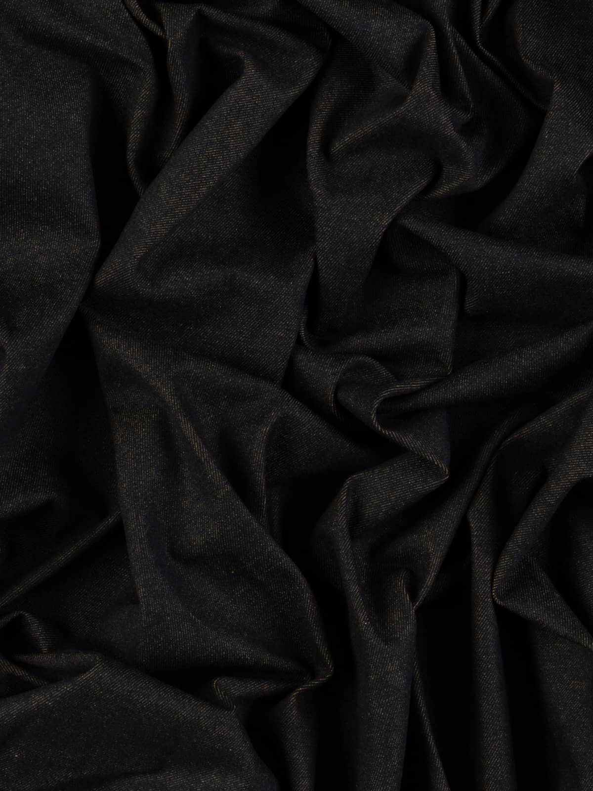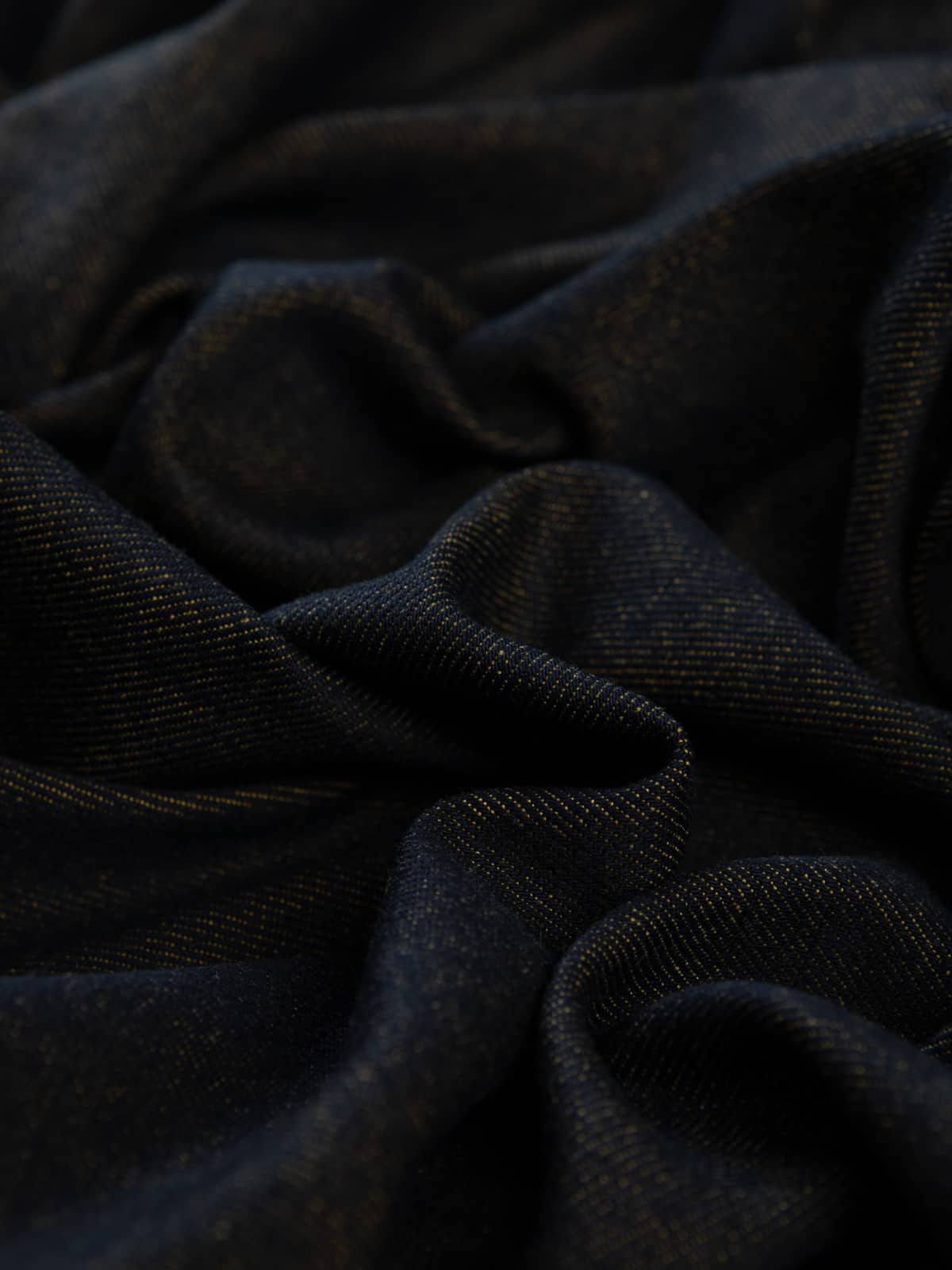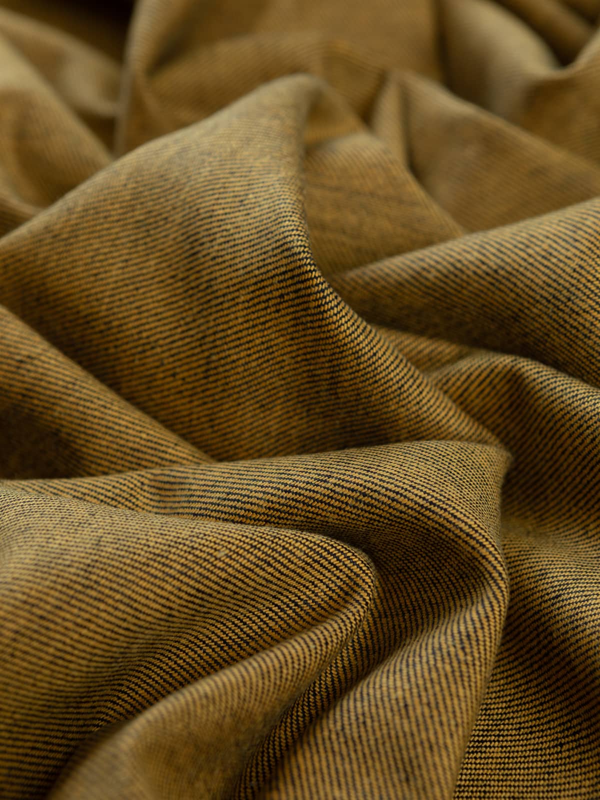 Design: Dark navy cotton warps are woven with golden-mustard weft yarns to create a reversible fabric, with one side showcasing a deep, inky denim tone and the reverse offering a vibrant, golden hue. This dual nature gives the fabric remarkable versatility, ideal for garments that highlight both tones through turned edges, cuffs, and interior details.