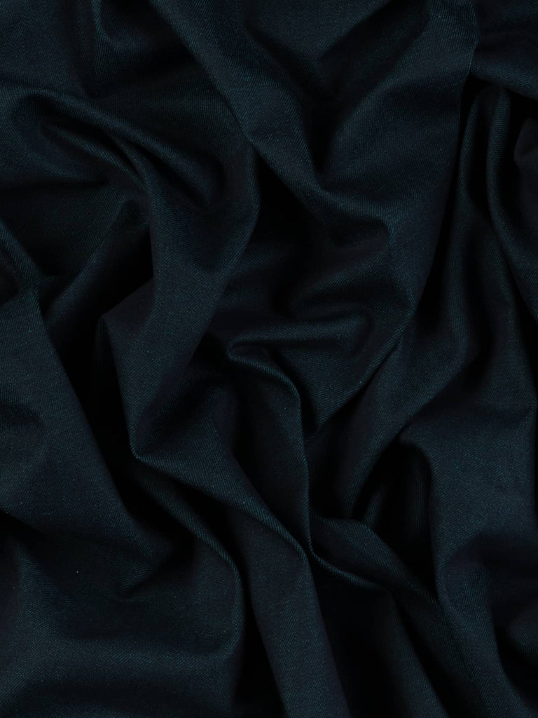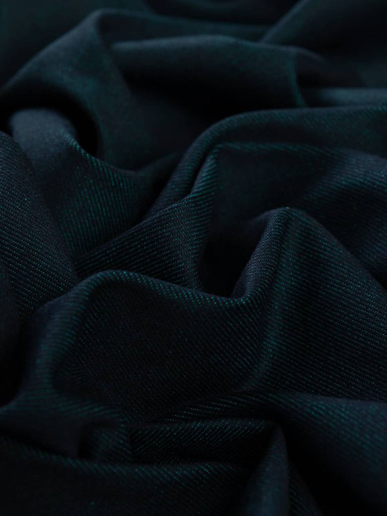 Shades: This striking two-tone denim presents a deep navy face interwoven with rich teal yarns. The contrast between the dark warp and the vibrant green-blue weft produces a sophisticated shot effect that offers differing looks on the face and the reverse.