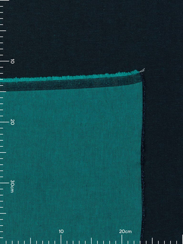 Design: Dark navy cotton warps are woven with deep teal weft yarns to create a reversible fabric, with one side showcasing a deep, inky denim tone and the reverse offering a vibrant pop of teal. This dual nature gives the fabric remarkable versatility, ideal for garments that highlight both tones through turned edges, cuffs, and interior details.