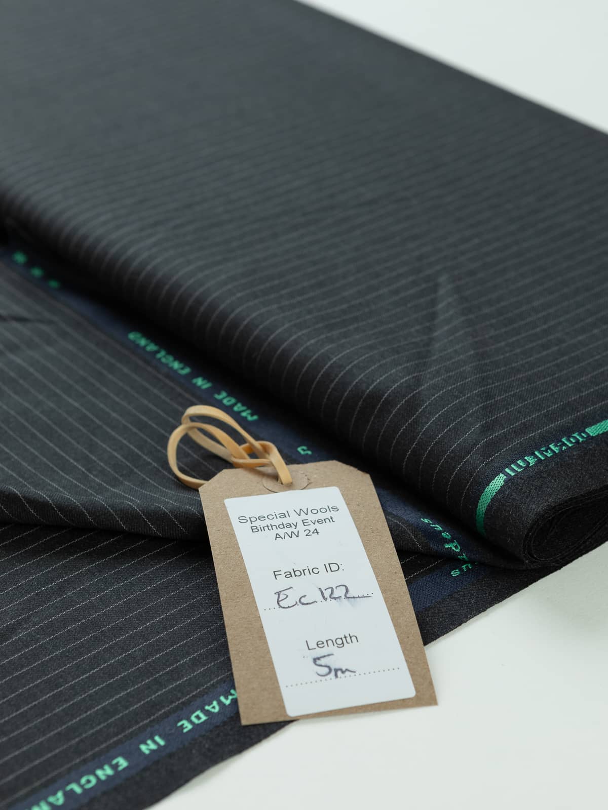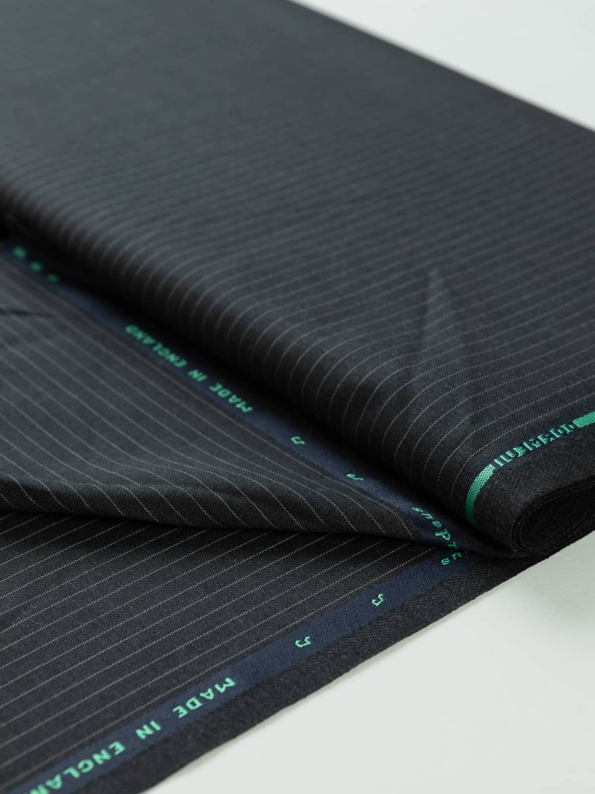 This overall tonality of this silky pinstripe fabric appears as an (almost) charcoal grey with silver stripe. However, it is actually comprised of the darkest night-sky blue (leaning to grey, rather than inky black) which means that its delicate white pinstripe stands out clearly without screaming its presence and being off-key. Instead it sings its quality like a top flight opera star.