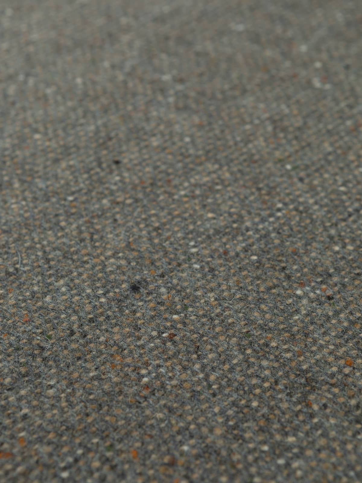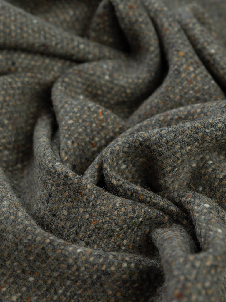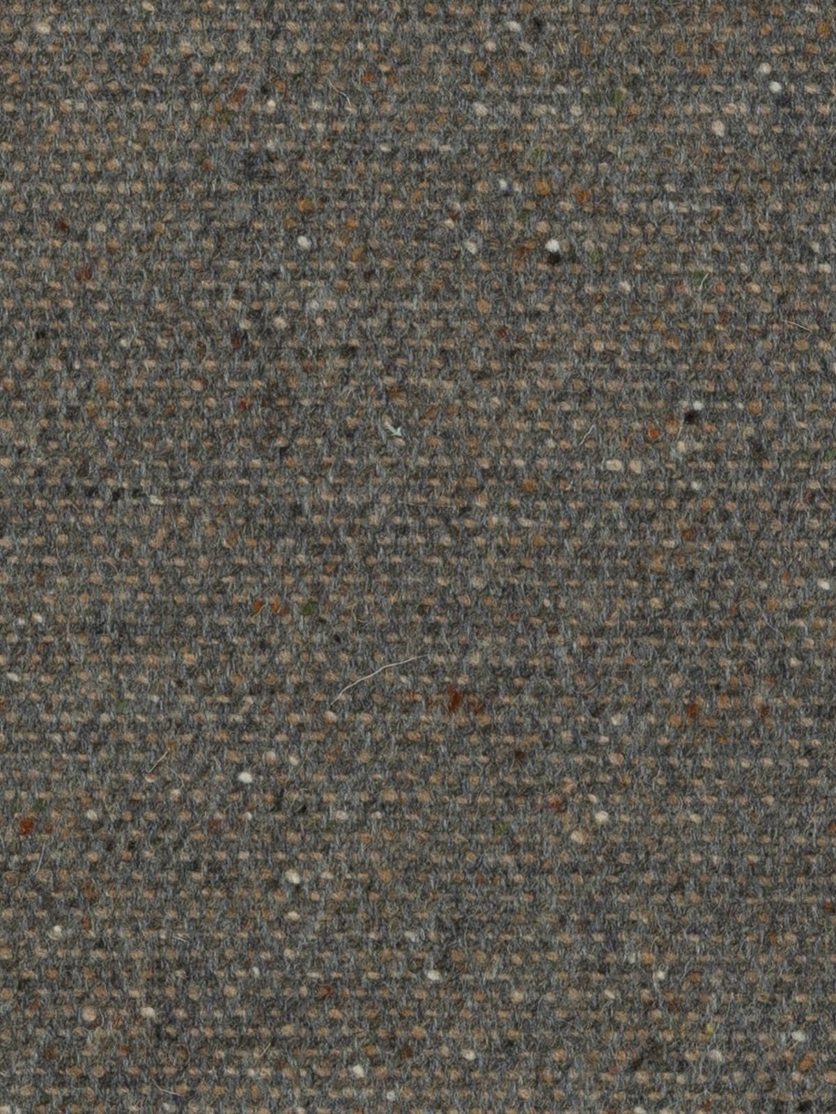 Design: Look closely, and a classic herringbone weave can be perceived within this Lambswool Donegal Tweed. The flecked nature of the Donegal yarns sitting against the grey melange yarns of the weft creates an obscured effect to the weave.