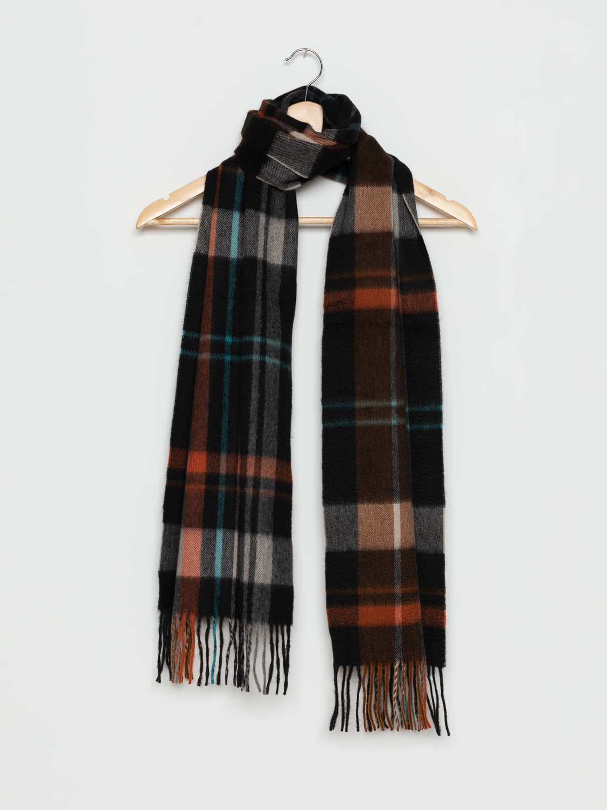 Blackwood, rust, walnut and smoke grey come together in a plaid that feels like a walk through late-autumn woods, the air rich with scent of bark, the ground soft with fallen leaves. Flecks of pale turquoise catch the eye like sky glimpsed through branches. Woven from pure cashmere, it holds warmth close while carrying a quiet, earthy confidence, as at home by the fireside as it is on a windswept moor.