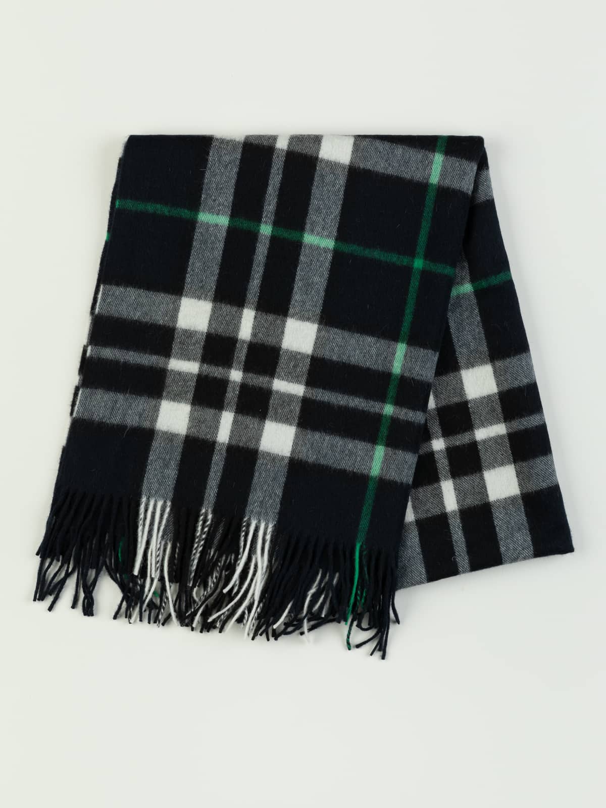 A striking contrast tartan in navy, black, and crisp peppermint white, touched by mint-toned highlights. Its playful name nods to classic British humour, yet the palette feels smart and bold. A fresh twist on monochrome with a dash of cool wit.