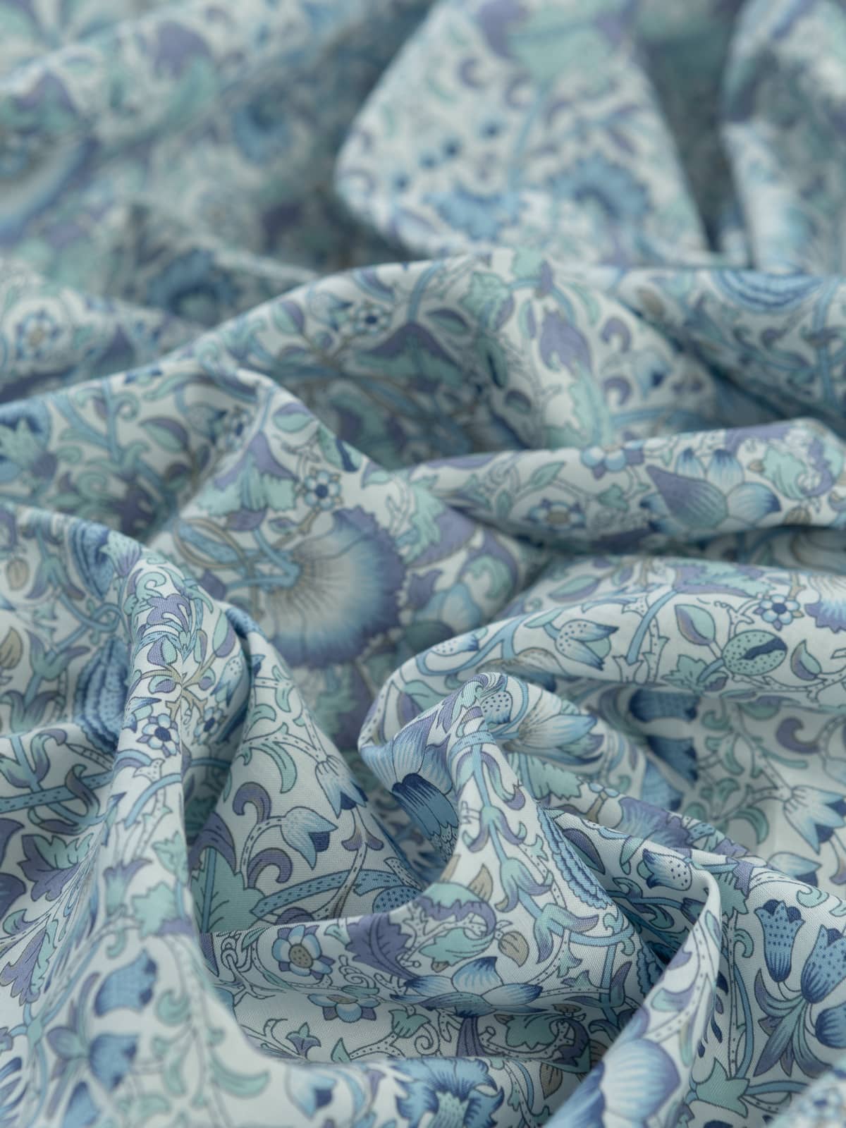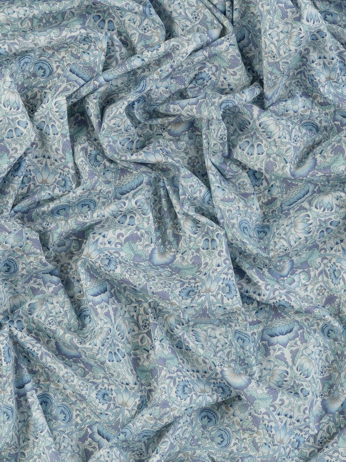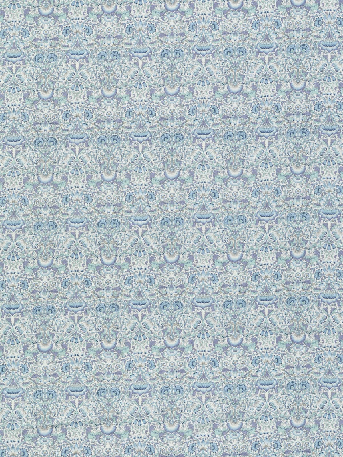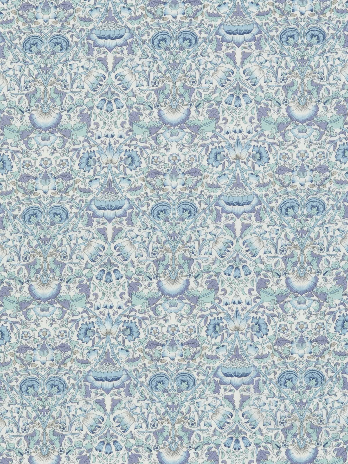 Shades: This William Morris "Lodden" design features a calming palette of lavender blue, powder blue, pastel green and accents of beige and midnight blue, set on a background of natural white.