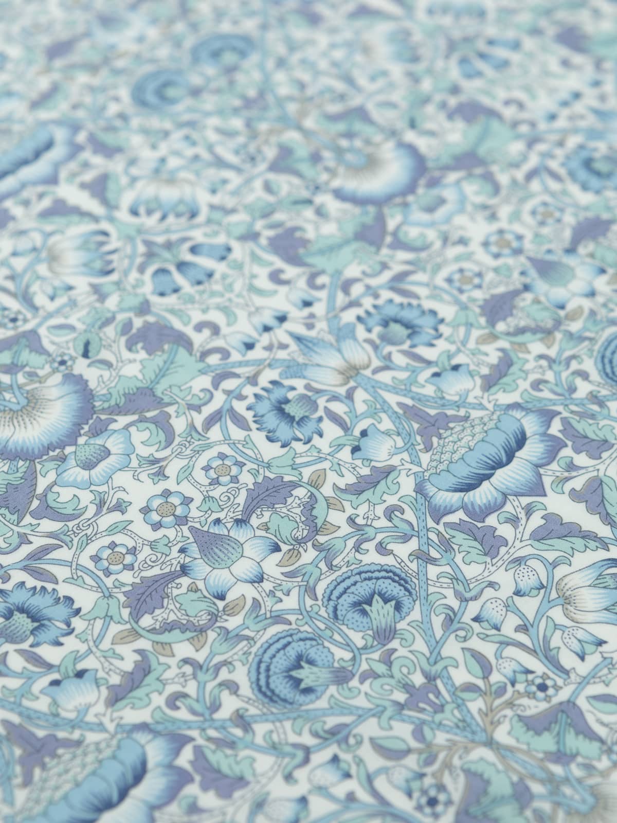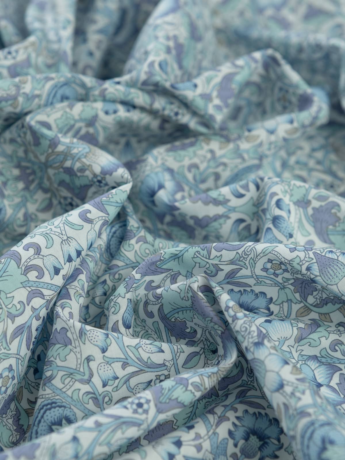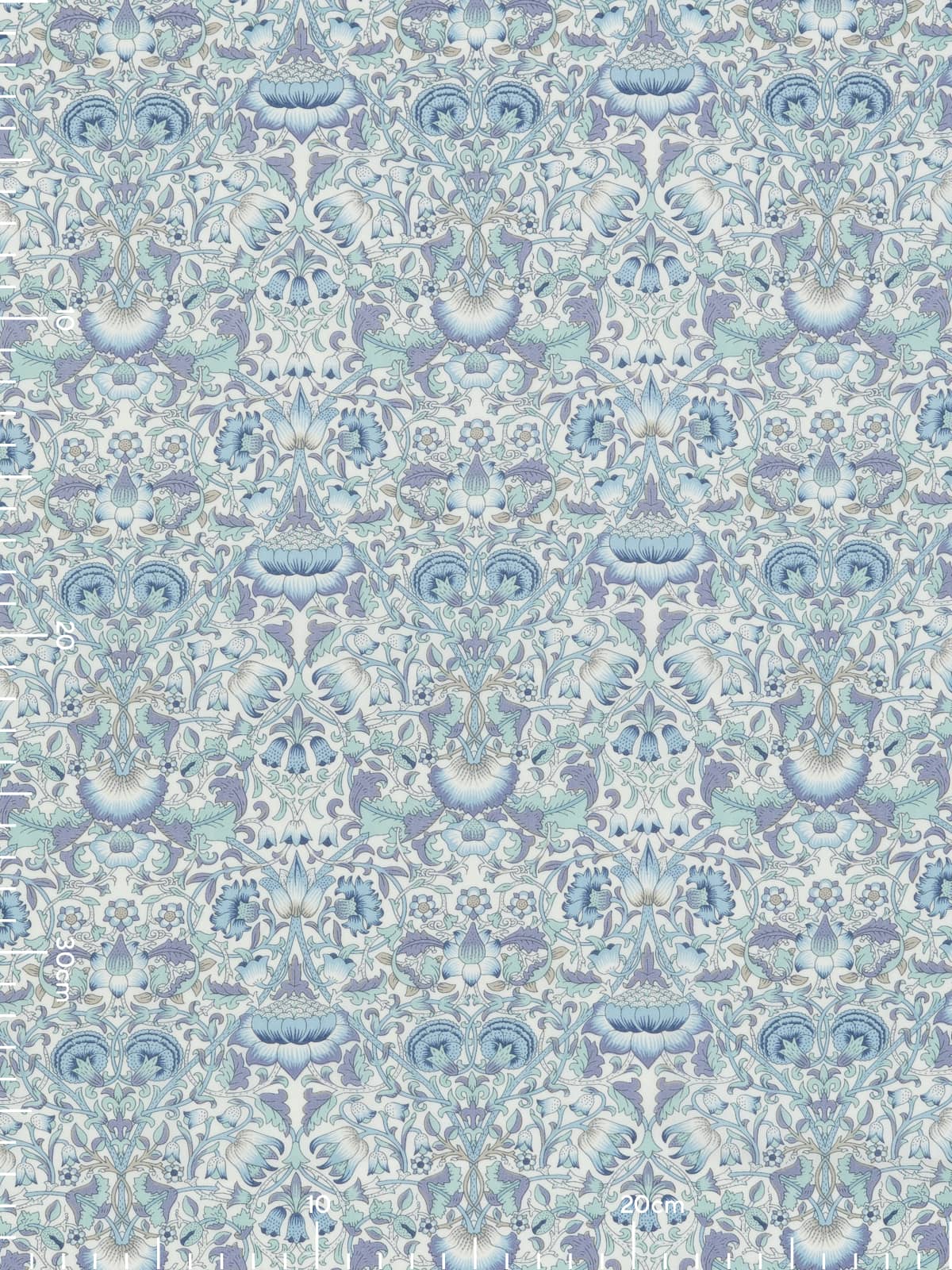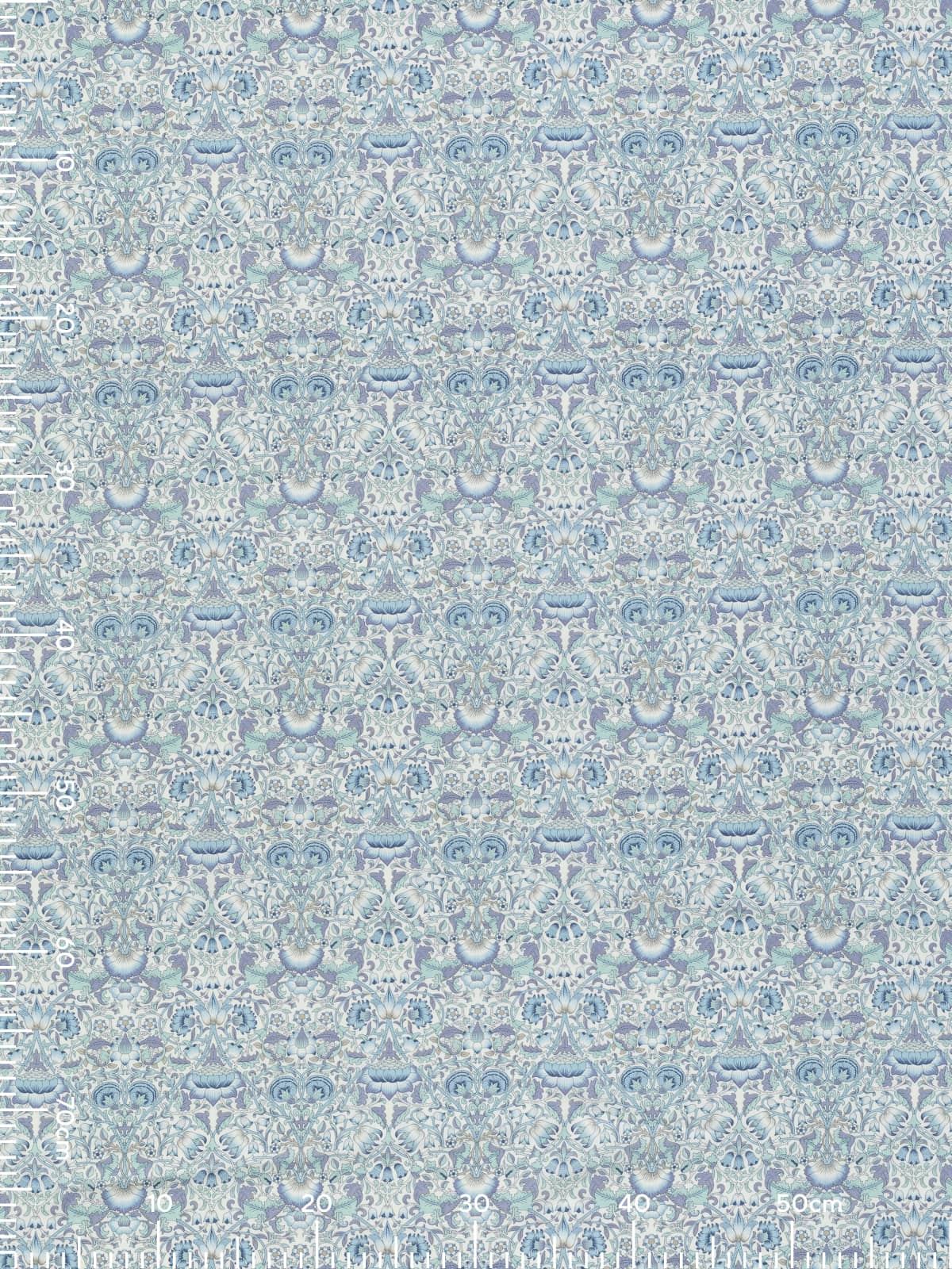 Shades: This William Morris "Lodden" design features a calming palette of lavender blue, powder blue, pastel green and accents of beige and midnight blue, set on a background of natural white.