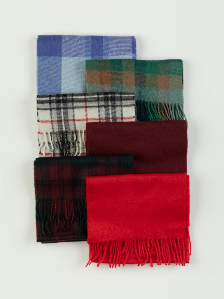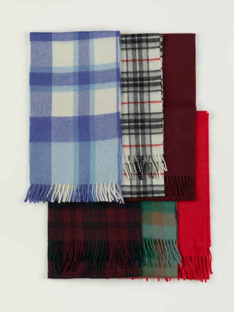 You will receive a random cashmere scarf chosen from a versatile selection of twill woven designs, including refined plain shades and classic plaids and checks. This collection spans bold reds and rich wine tones, sleek city-inspired monochromes, deep forest greens, blue green blends and fresh denim blues, offering a timeless palette suitable for every wardrobe. Each scarf is crafted in Yorkshire from pure cashmere with a medium-weight drape that brings warmth, softness and understated luxury to everyday dressing.