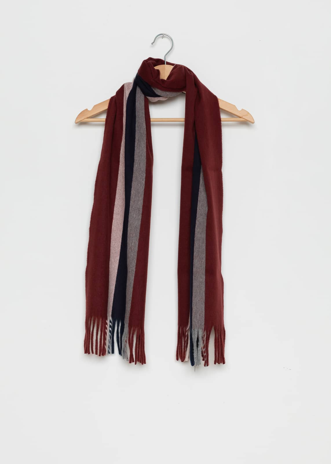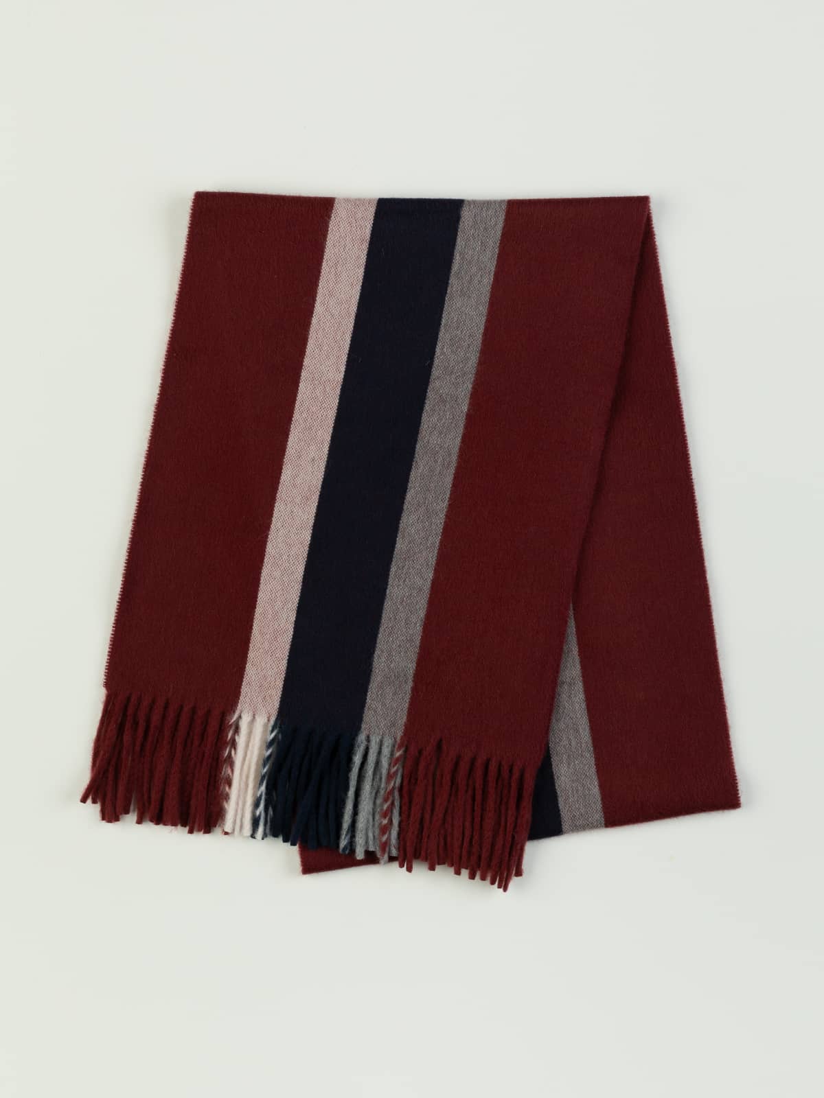 Vertical stripes of port wine red, midnight navy, and smoke grey, edged with clean cloud white. A sophisticated collegiate-inspired design, it balances heritage confidence with minimal tailoring. The mix of deep hues and soft contrasts lends an academic refinement: classic, urbane, and composed.