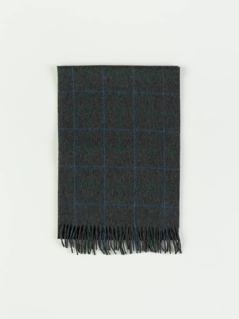 In a thunderstorm-grey melange, this windowpane design hints at mid-blue flashes and deep seaweed green, like a sky darkening before rain. Soft, light and beautifully warm, it brings a moody elegance to winter dressing, perfect with navy or charcoal coats.