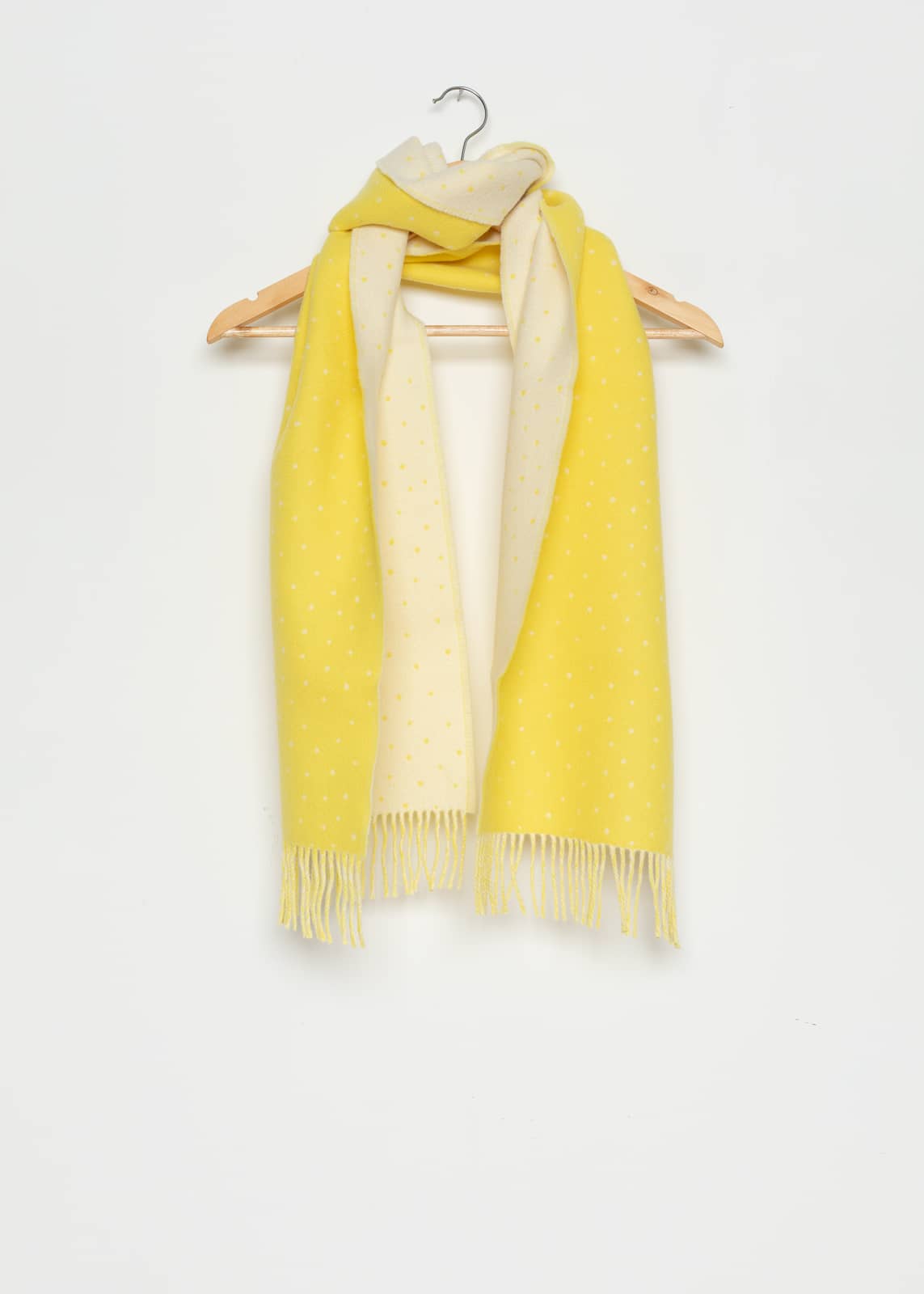 Reversible and irresistibly cheerful, this scarf pairs white sugar dots with a lemon sherbet base, like confectionery dusted in light. Soft, bright, and playful, it radiates easy optimism. A tactile delight that brightens winter layers with its candy-like charm.