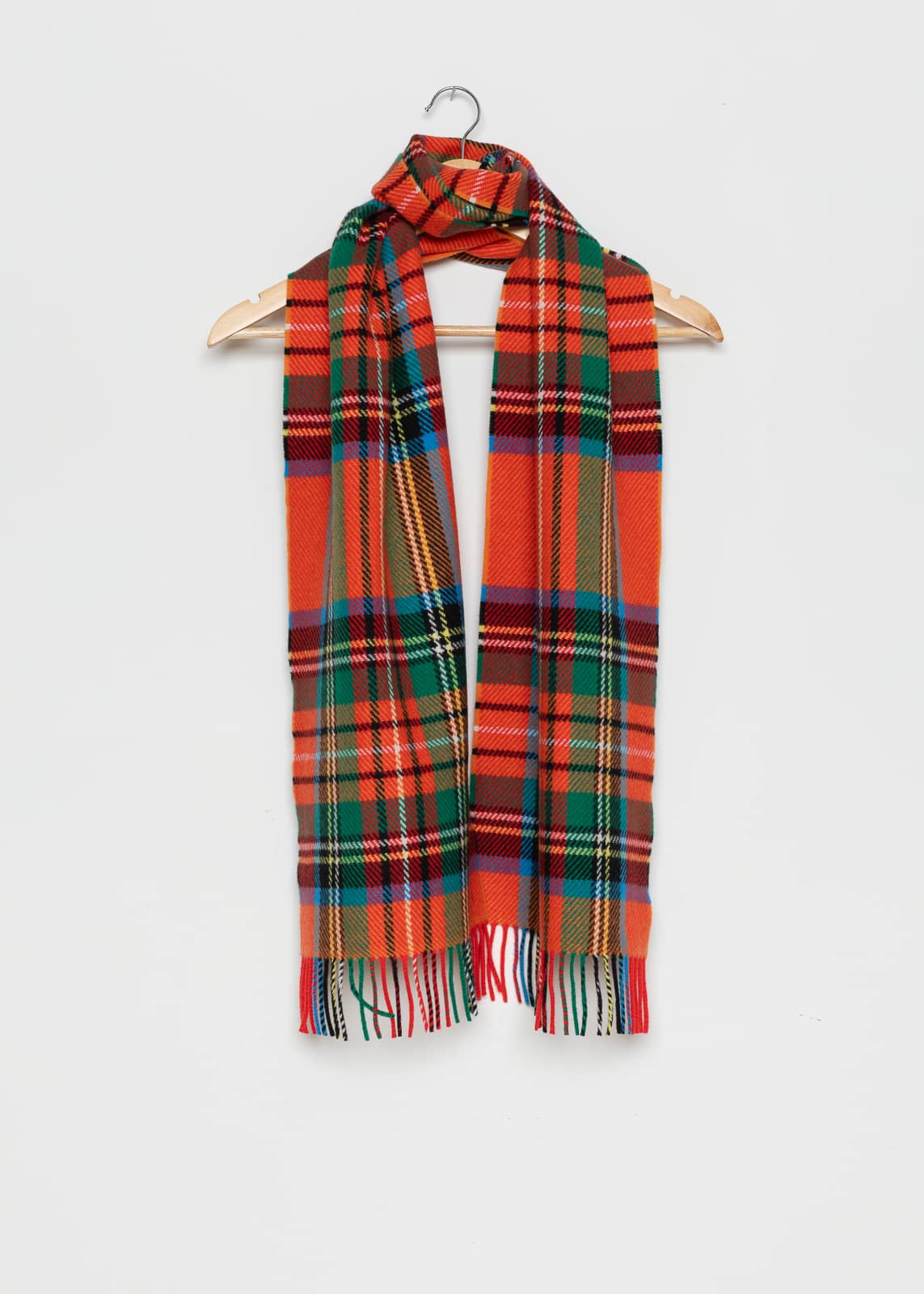 A vivid, festival-bright tartan bursting with orange, emerald green, red, royal blue, yellow, black, and white. Intense and joyful, it holds the energy of outdoor fairs, city parades, and colourful knitted sweaters. The contrast between warm citrus hues and cool blues creates a lively check with strong graphic impact.