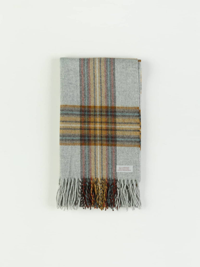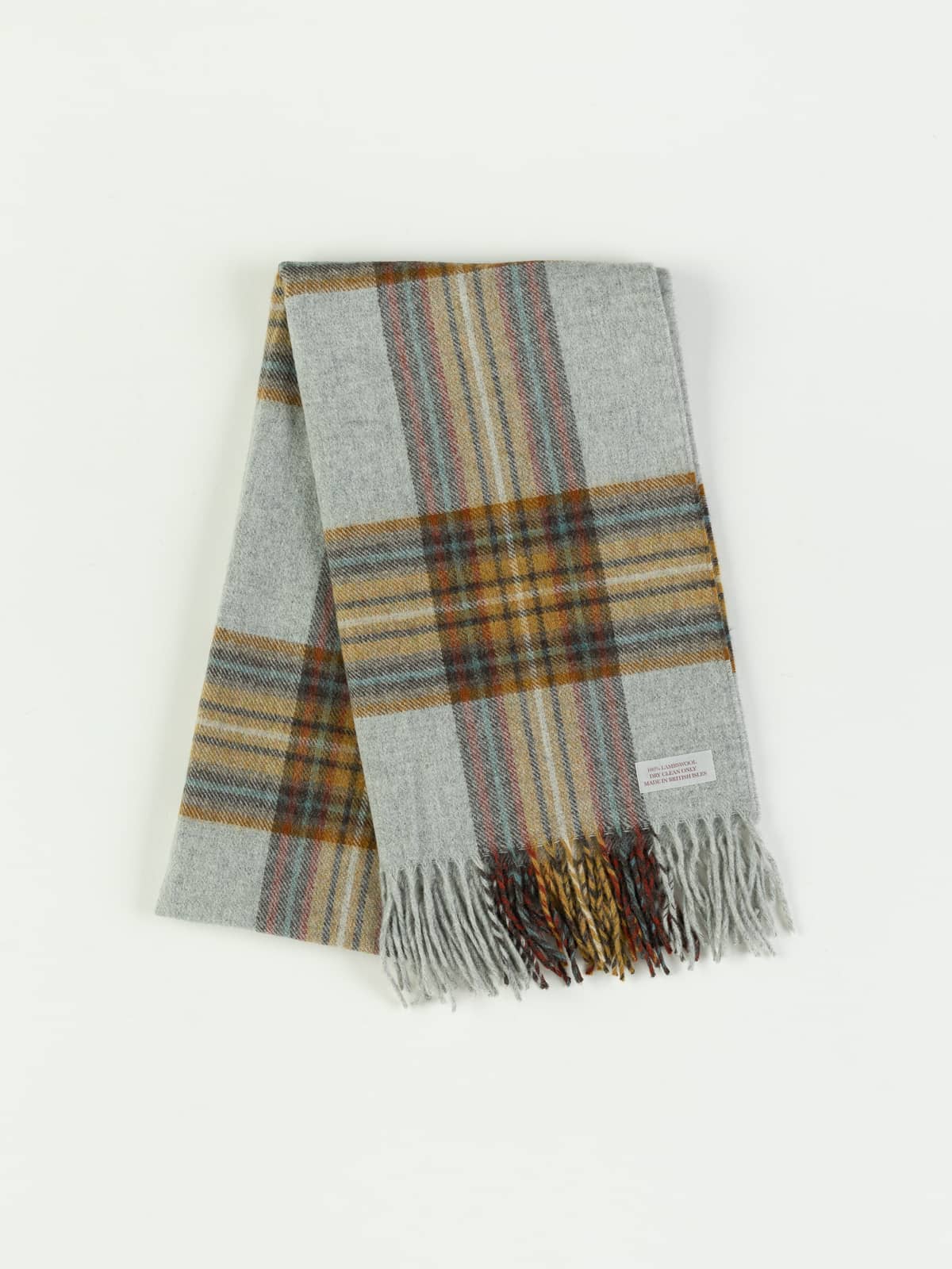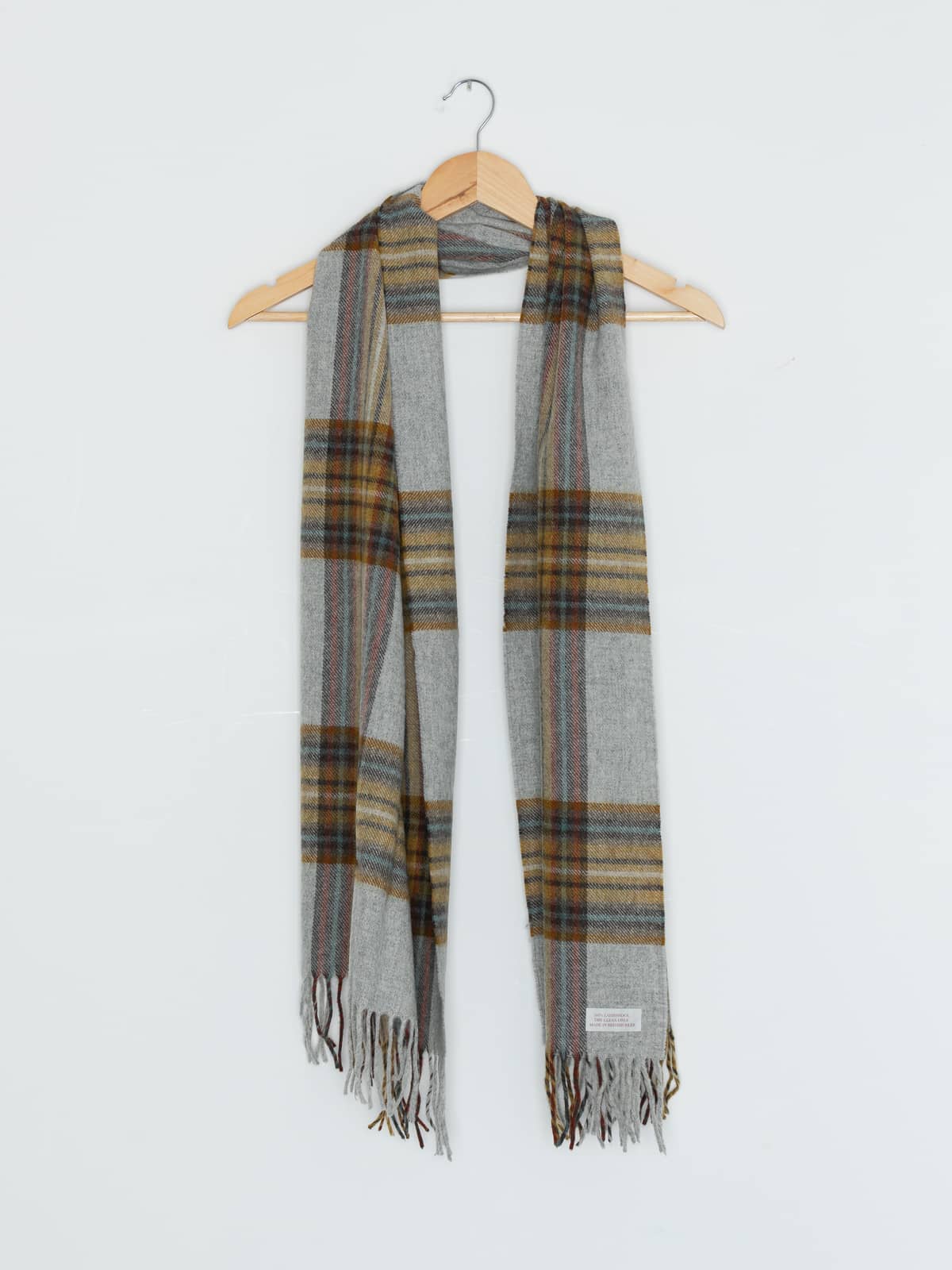 This scarf evokes a frost-kissed forest, with a misted grey melange base like early morning fog over woodland paths. Golden autumn ochre brings warmth, while accents of canary brown, iced blue, and bark brown reflect the subtle colours of frozen leaves and icy streams. Woven in soft Merino, it wraps you in serene, understated elegance.