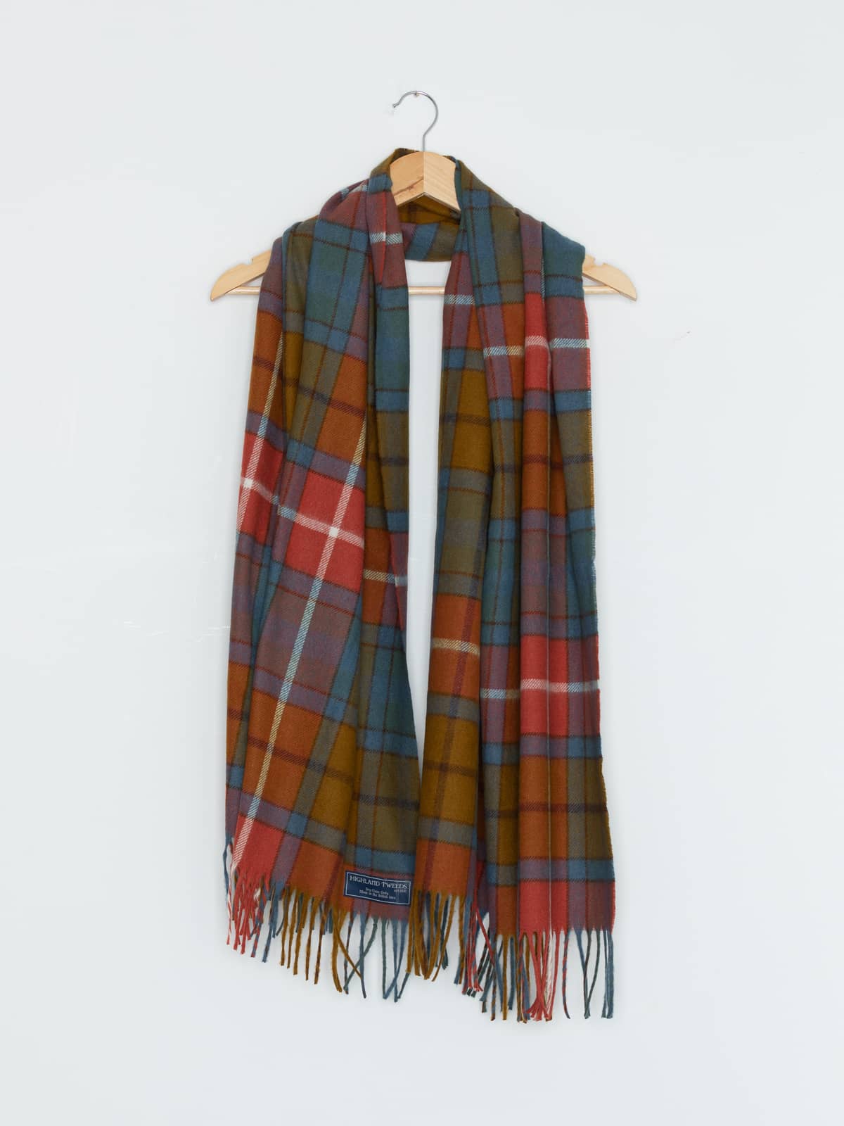 This scarf captures the gentle movement of a Highland stream, where summer sky blue and soft ochre flow together like sunlit water over stone. Ironstone brown and wild salmon red add depth and warmth, lifted by a crisp freshwater white overcheck that feels clean and invigorating. Its harmonious, nature-rooted palette brings an easy elegance to both classic coats and relaxed weekend layers.