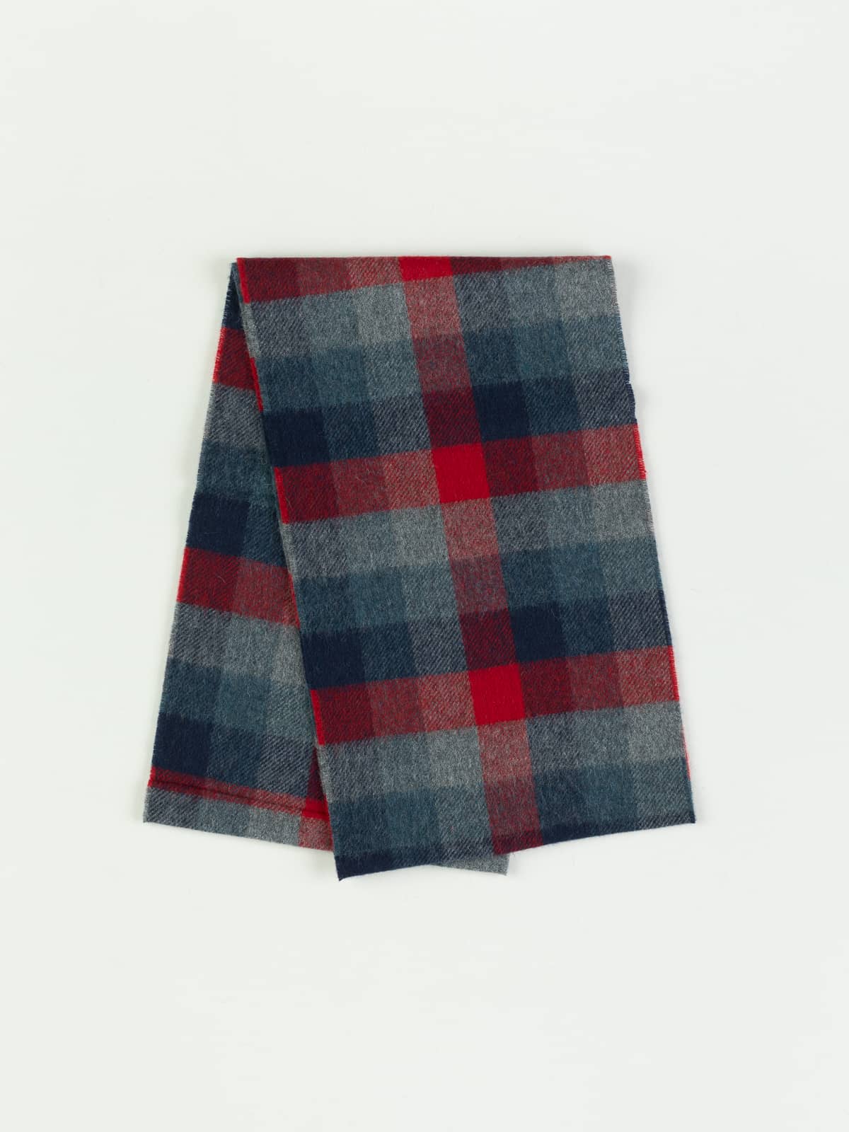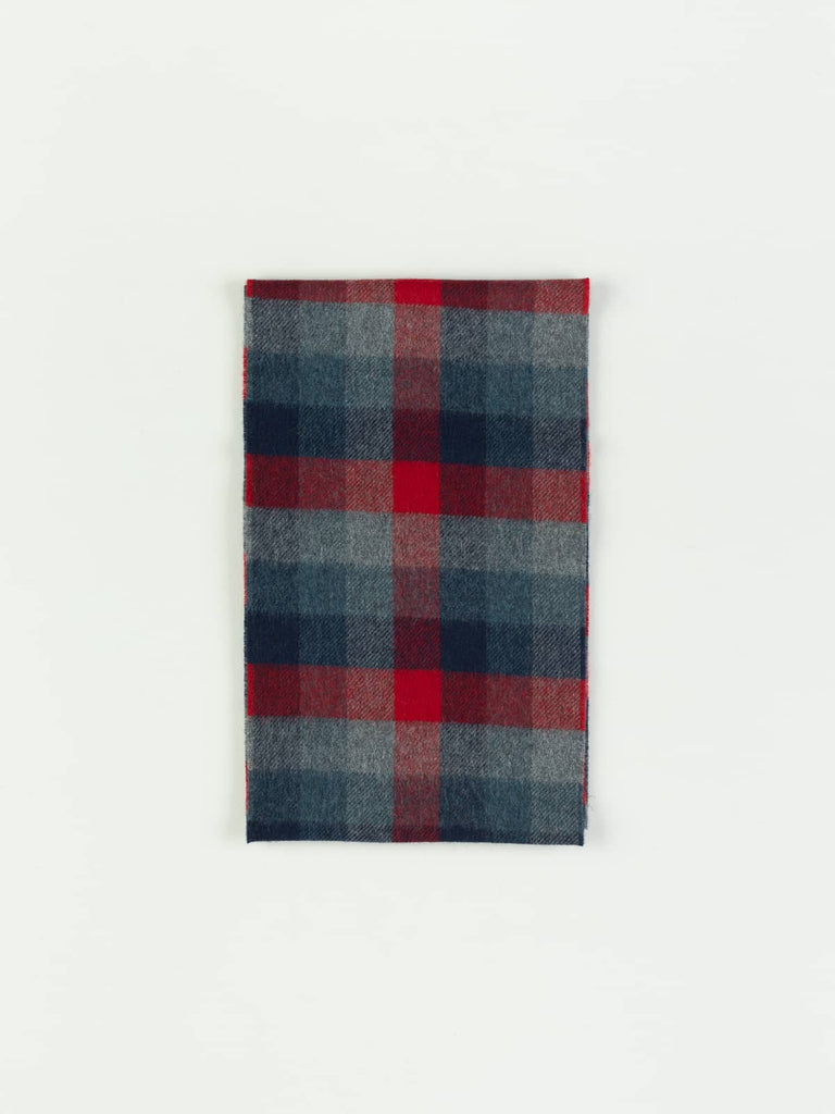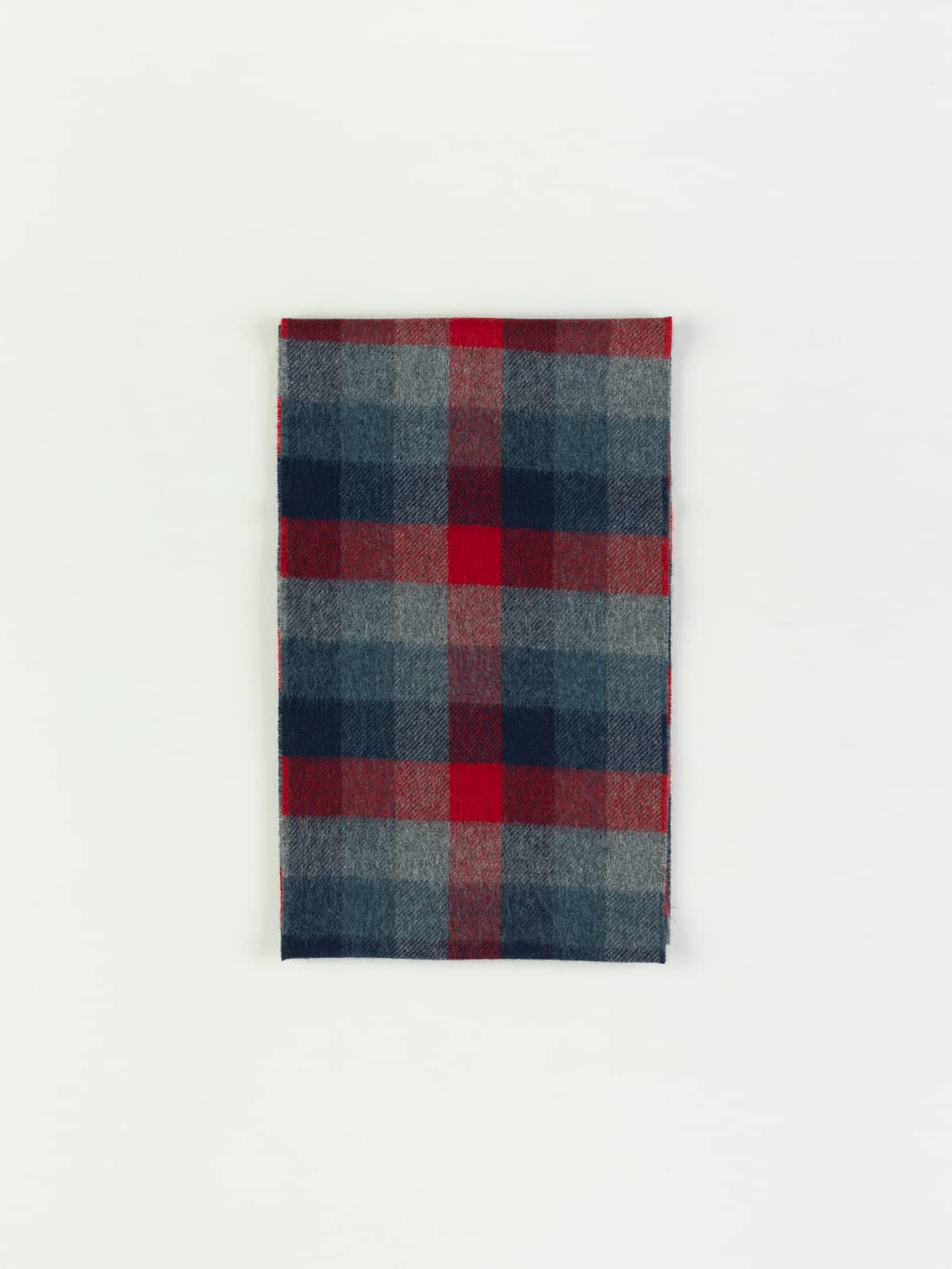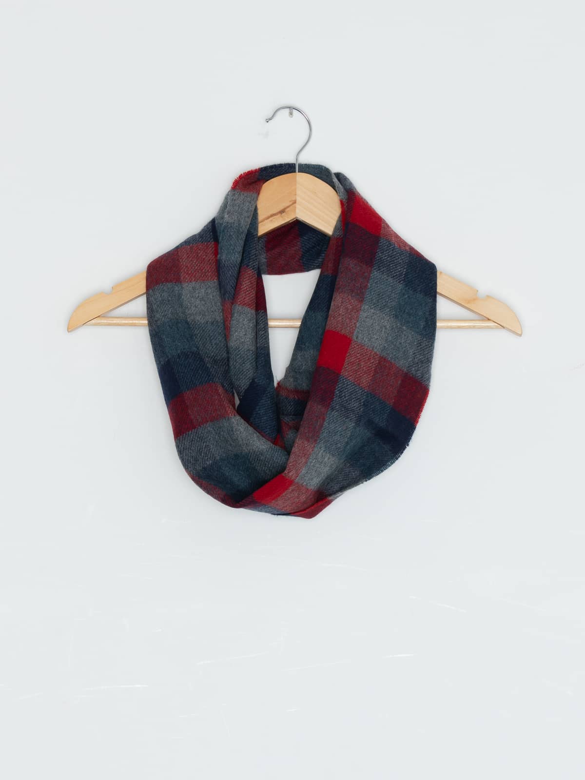 This cosy merino wool infinity scarf is woven in a timeless twill block check, blending melange tones of navy softly, ocean blue, mid-grey and a beacon-like red for a classic, coastal-inspired palette. Lightly brushed and stitched into a secure loop with an overlocked, topstitched seam, it twists easily into snug, stay-put layers of warm merino wool that won’t slip or stray.