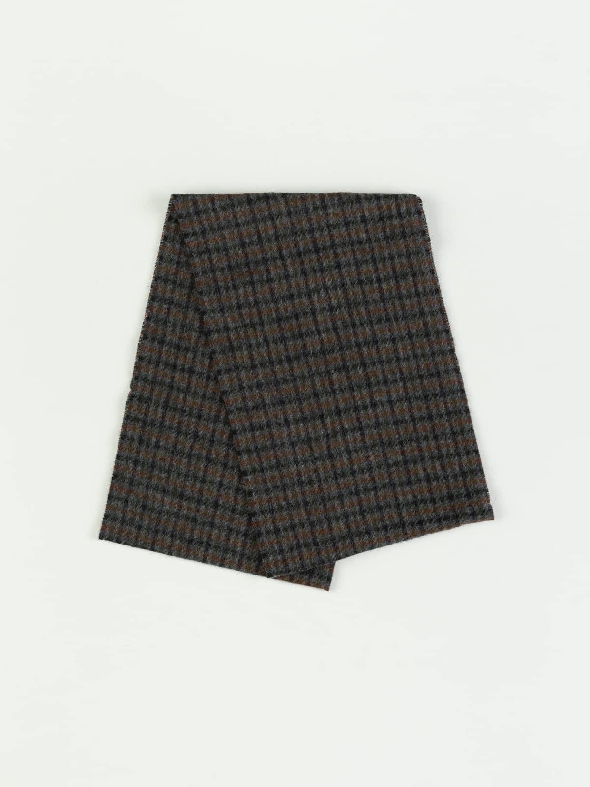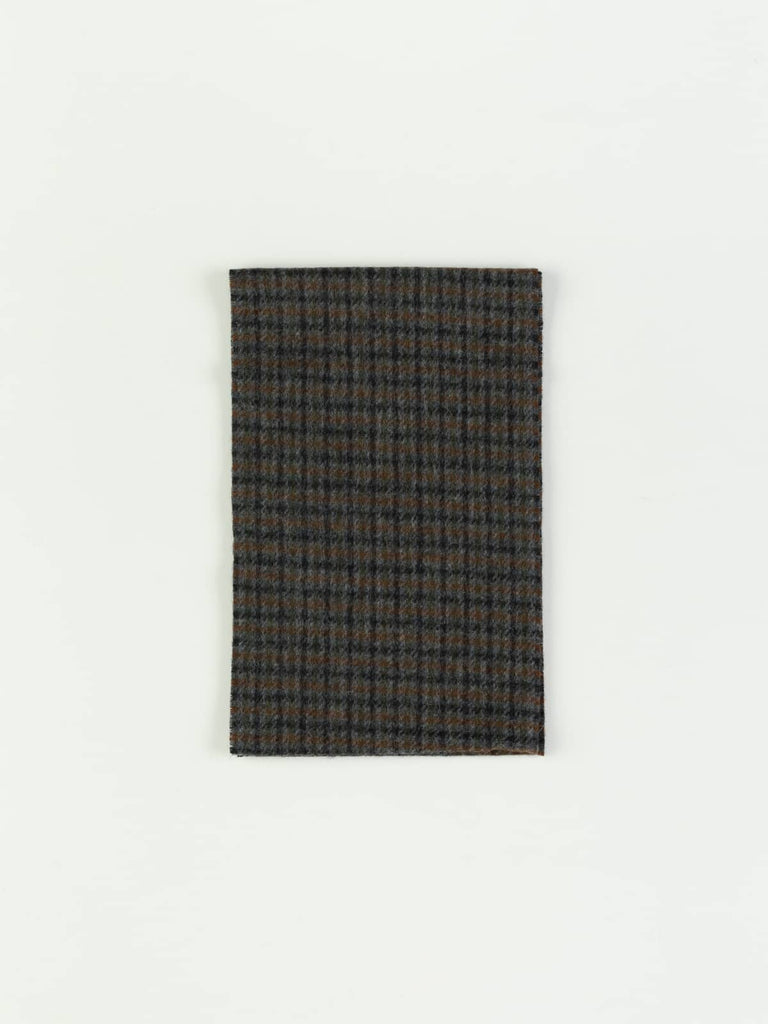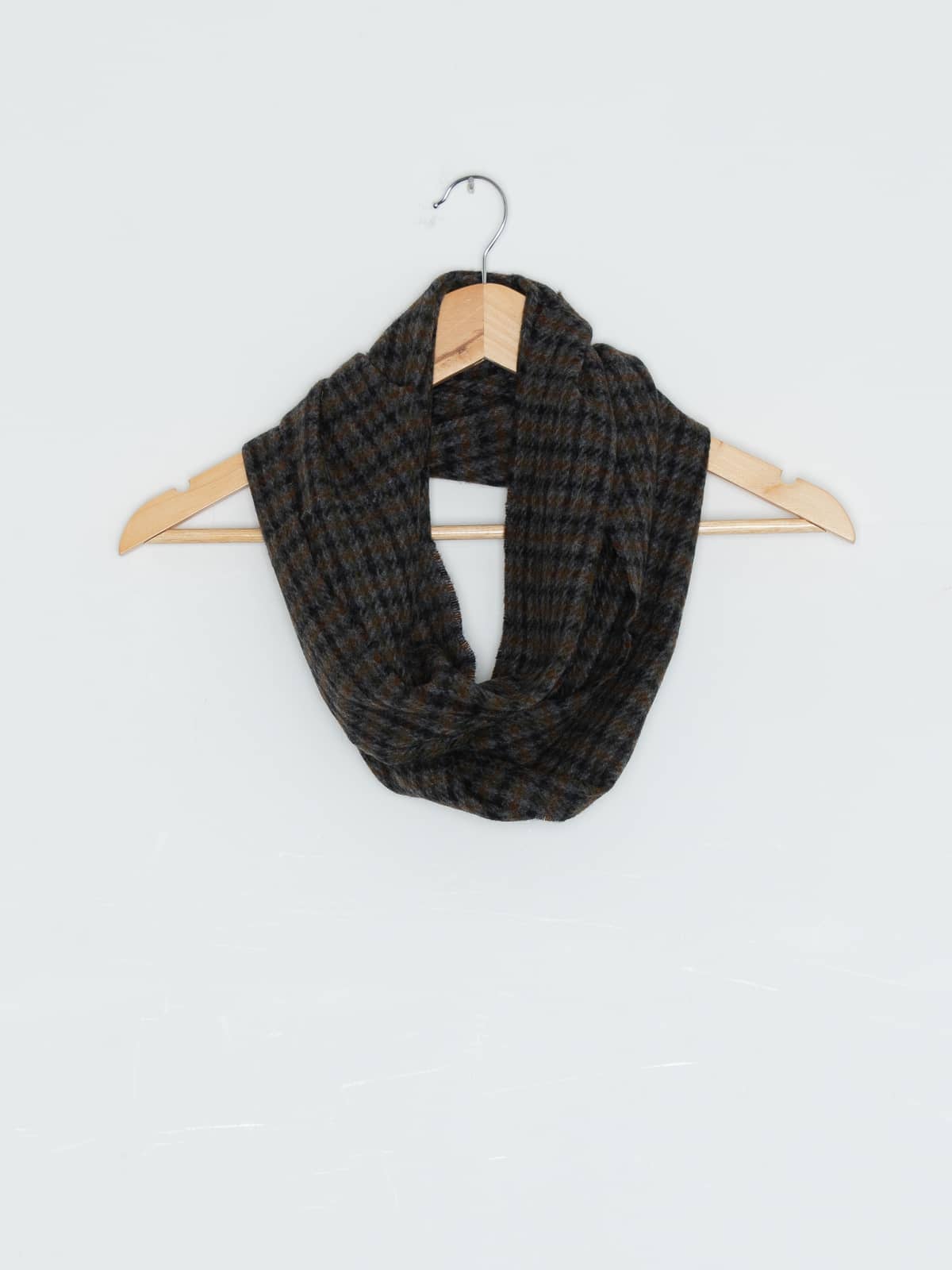 This classic checked merino wool infinity scarf features a moody palette inspired by industrial mill towns, with a smokey grey base woven through with coal black, dark moss and rusty brown to create a subtle sports-jacket-style check with delicate twill diagonals. Lightly brushed for softness and stitched into a secure loop with an overlocked, topstitched seam, it slips on easily and twists into warm, cosy layers of merino wool that stay comfortably in place all day.