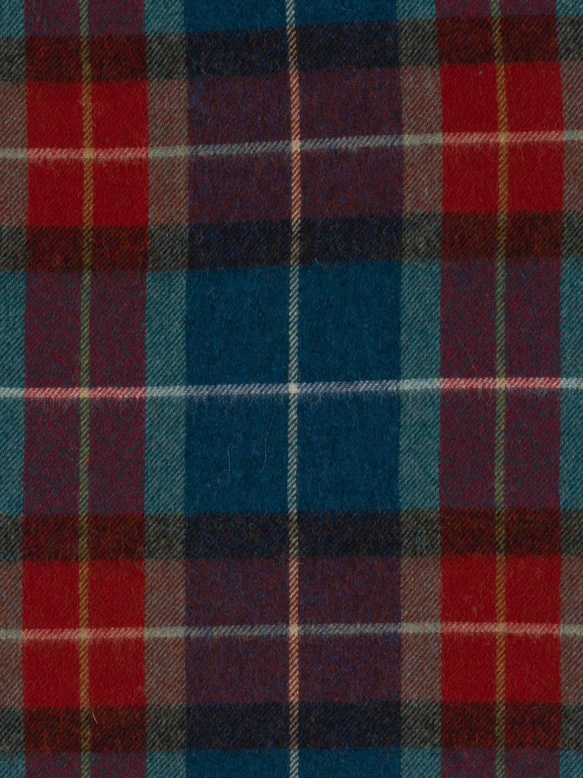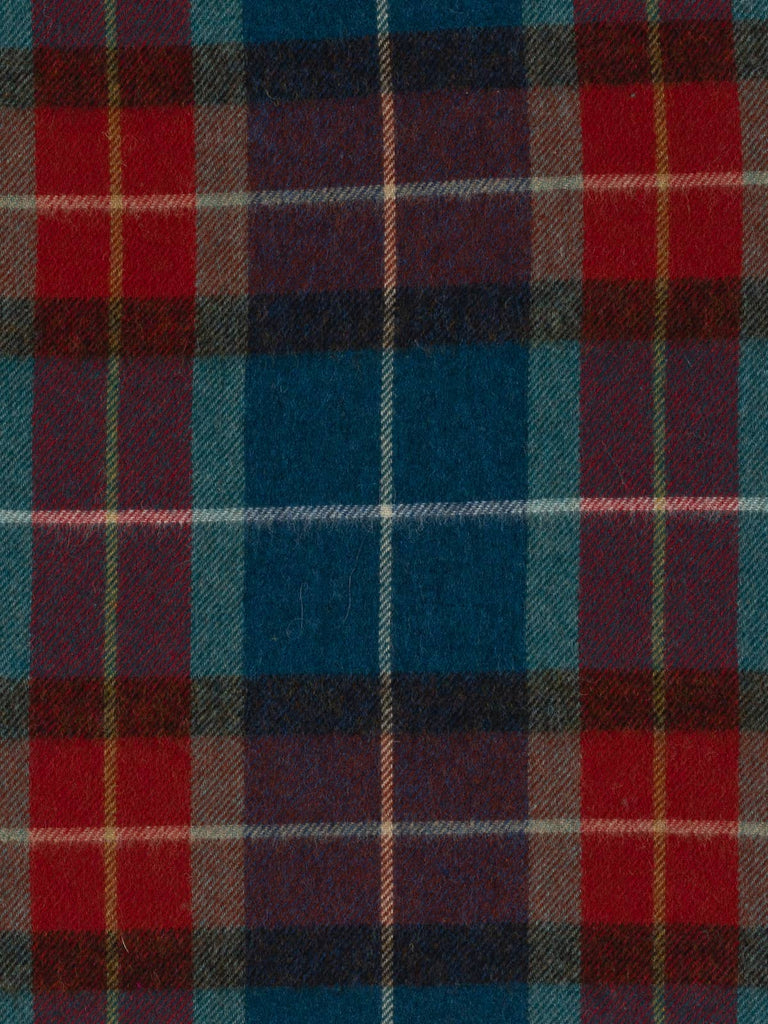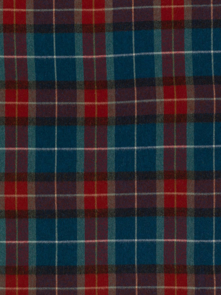 This classic twill woven plaid features bold overchecks that layer rich teal blue melange with warm rust red tones for a distinctly moorland inspired look. Turquoise melange threads add a cool lift while fine accents of white and harvest gold bring gentle contrast. Soft, warm and timeless, it offers effortless heritage style for everyday wear.
