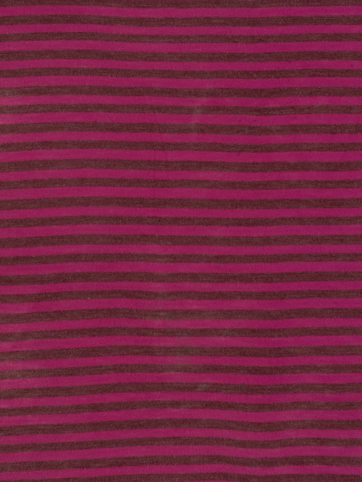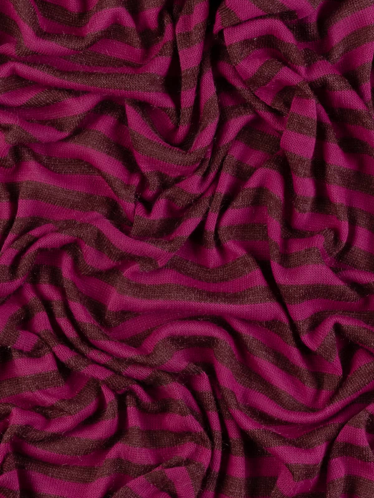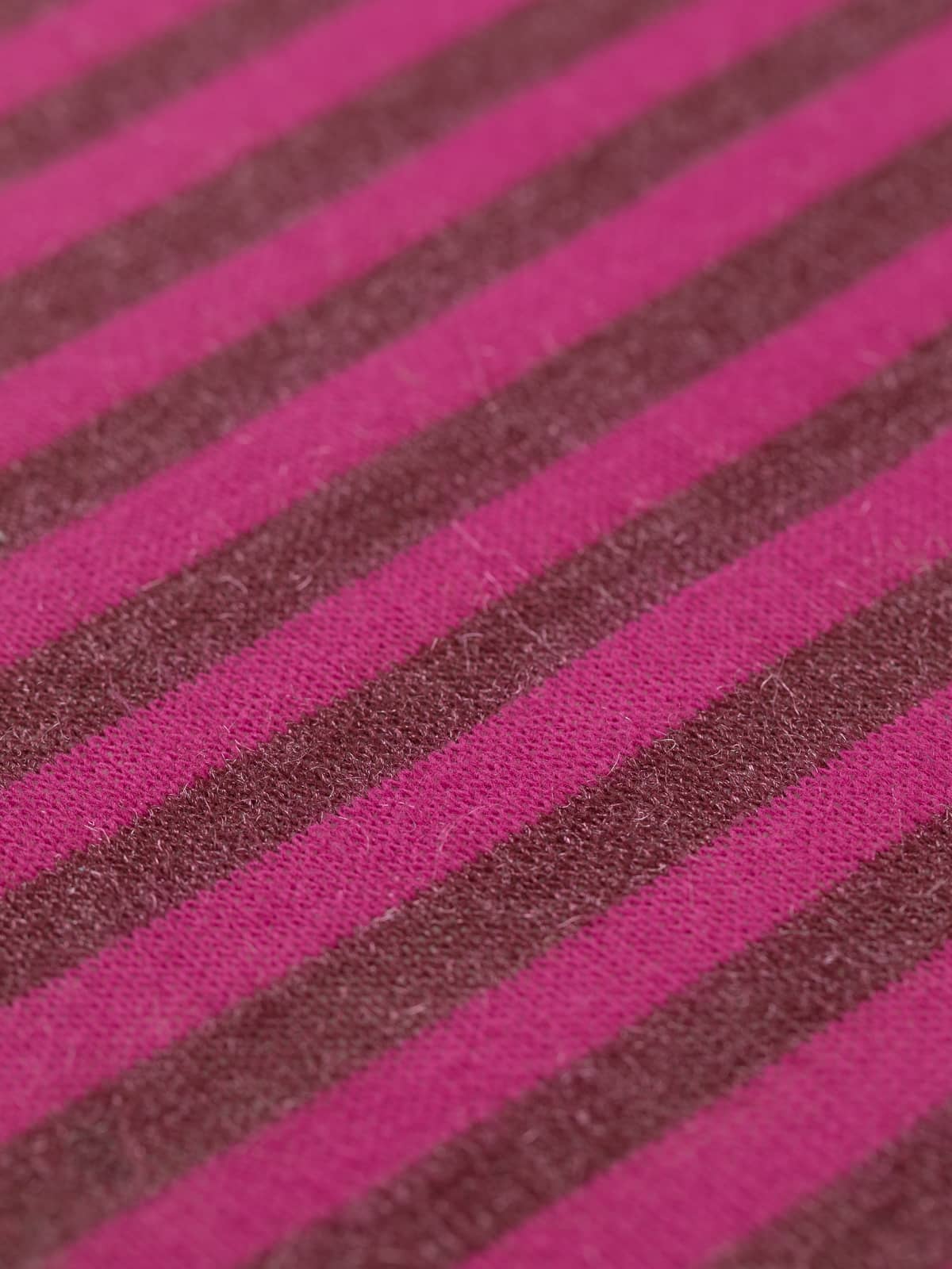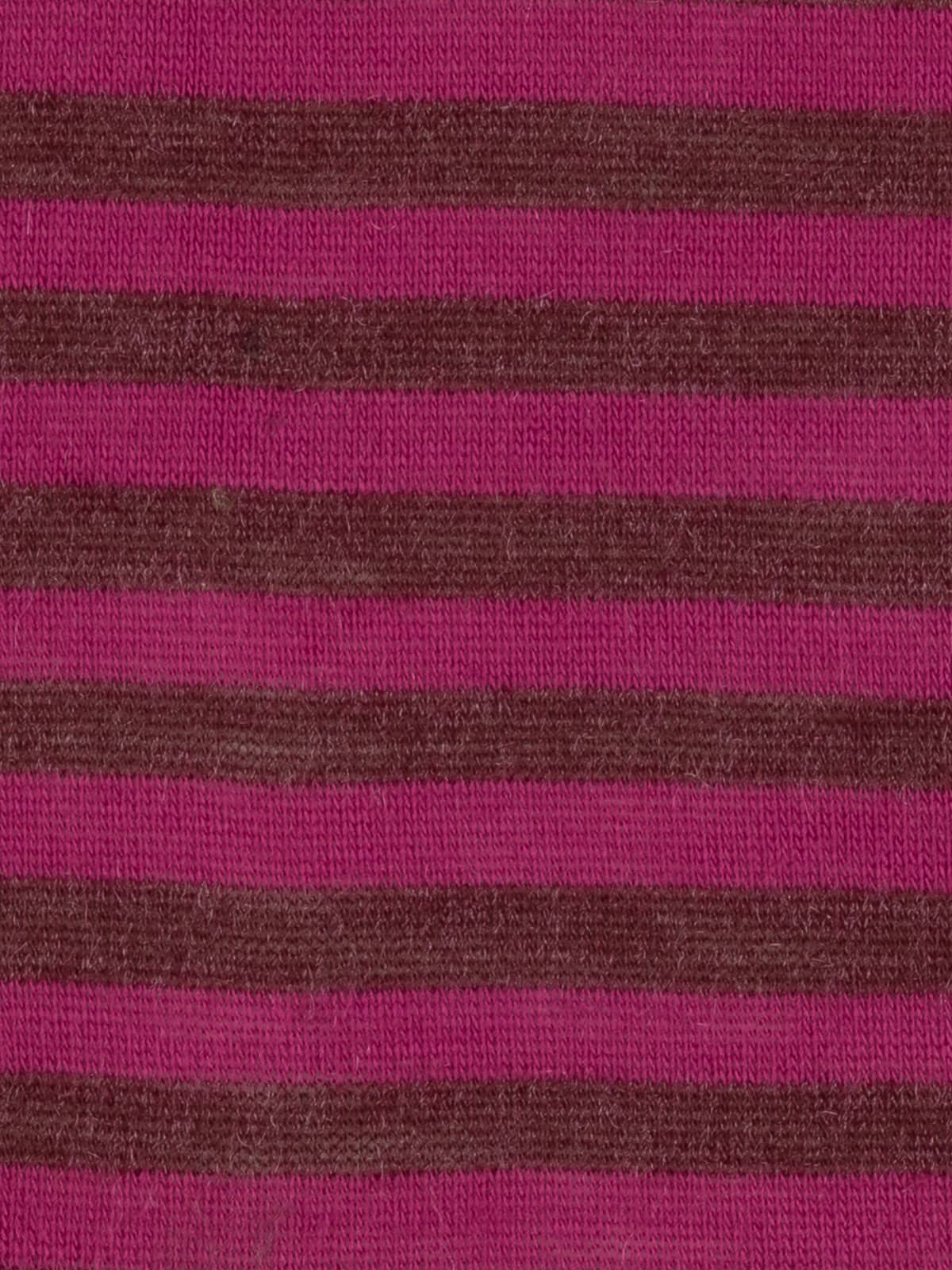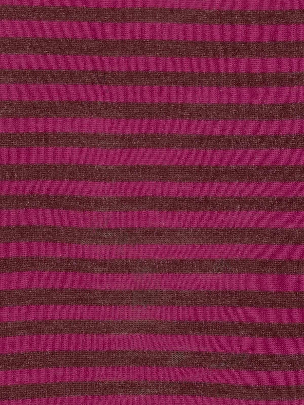 Design: A fine sweater knit worked in classic stocking stitch, featuring 1.7cm wide horizontal stripes in burgundy and magenta-raspberry tones, subtly enhanced with shimmering fibres for added depth and interest.