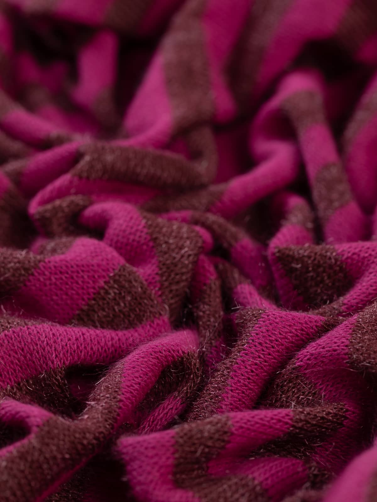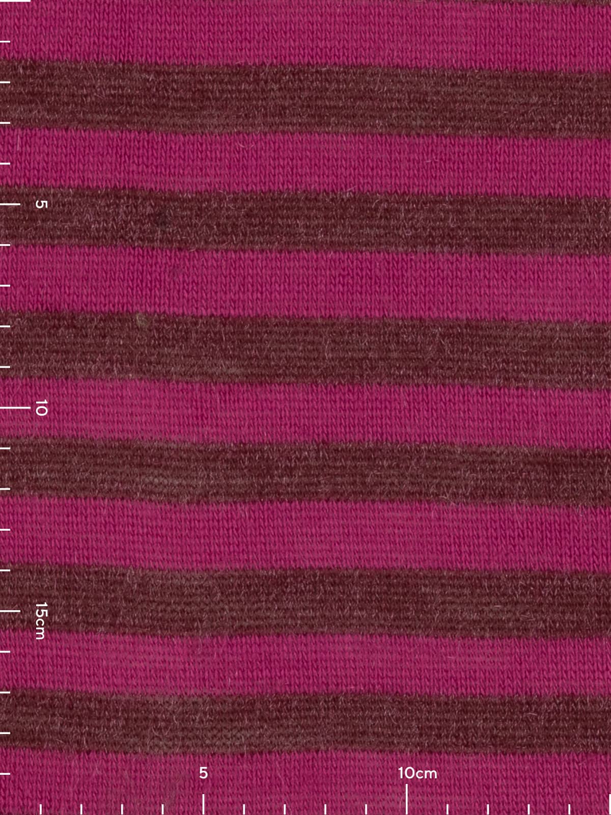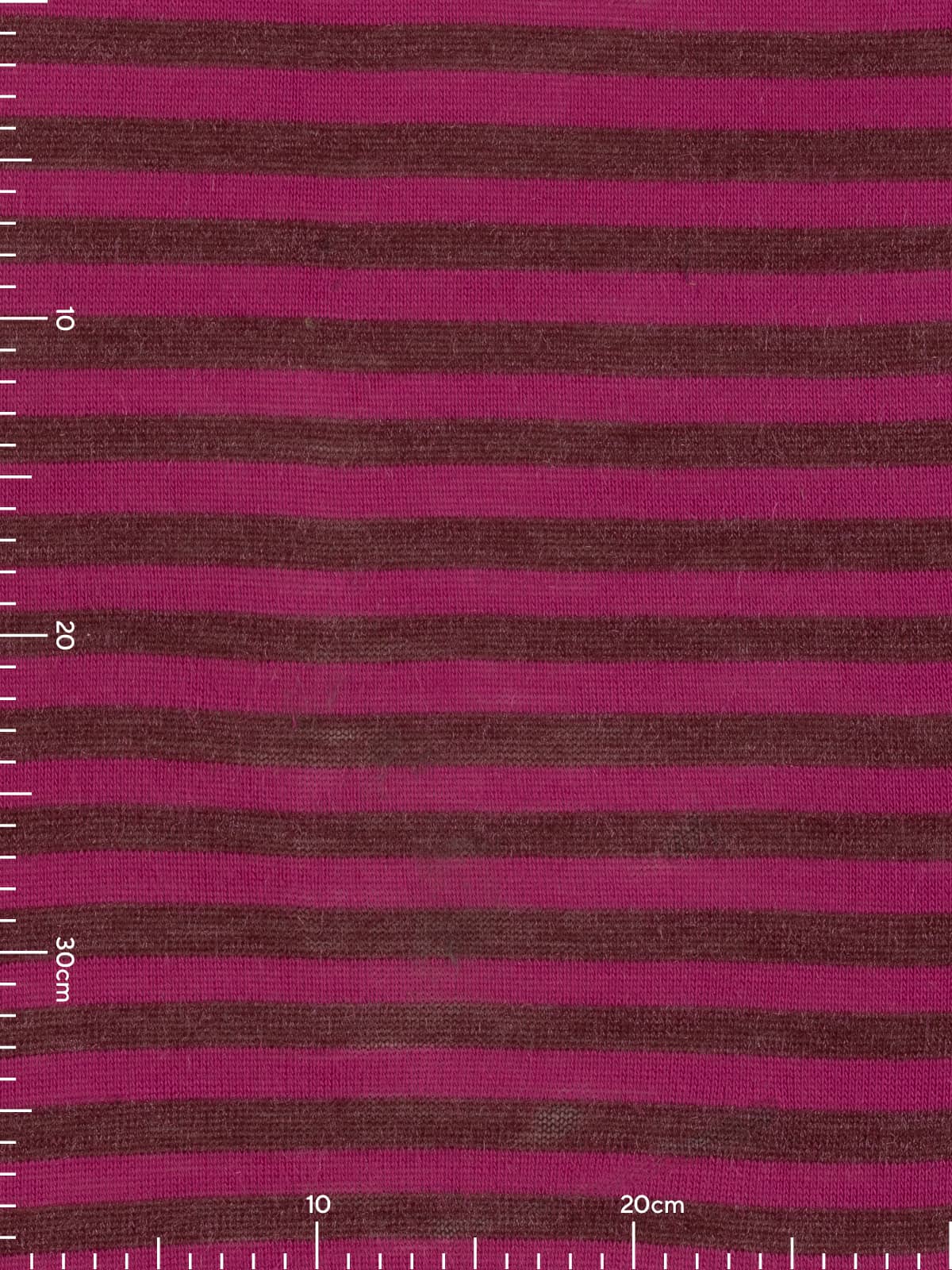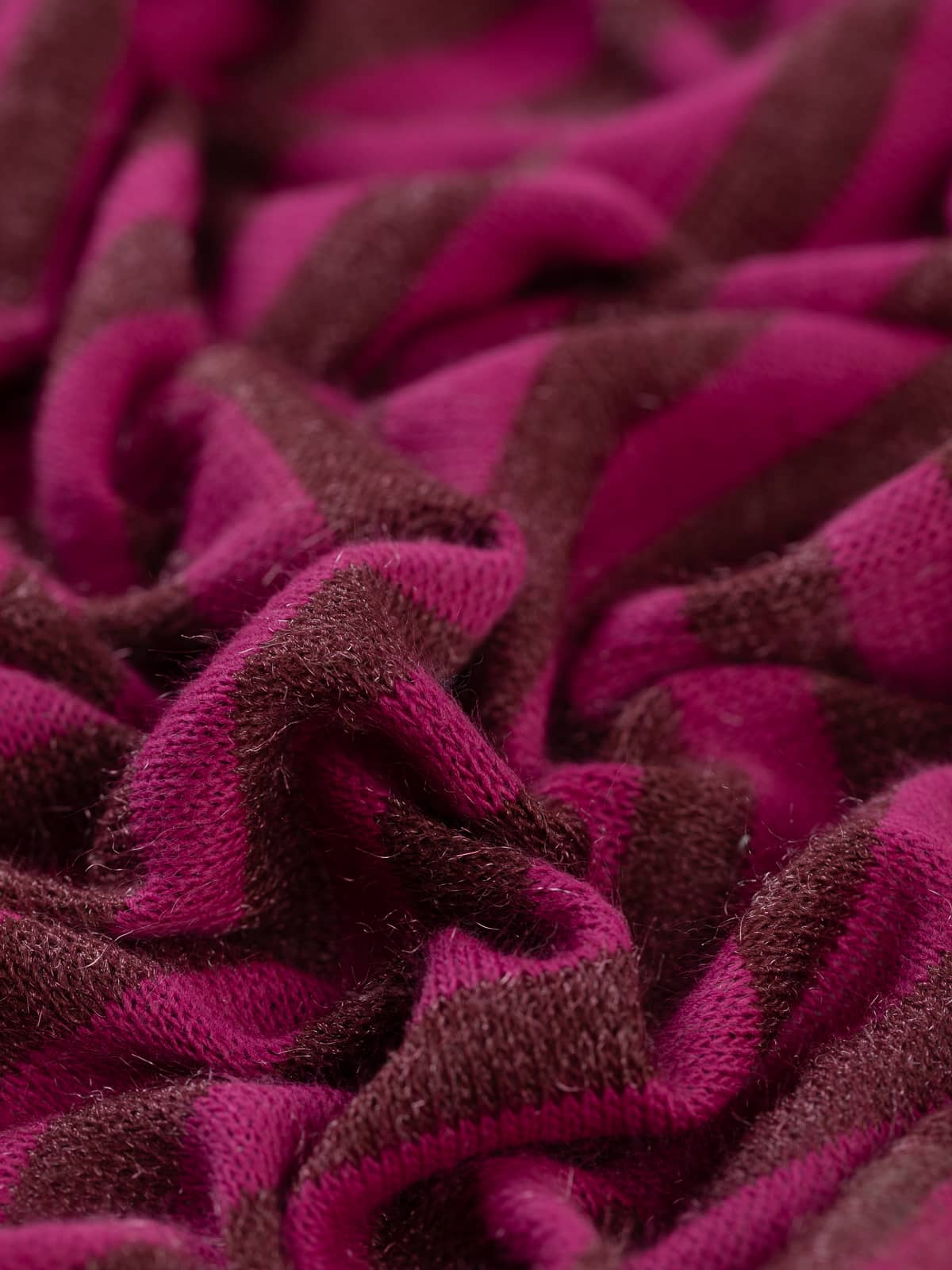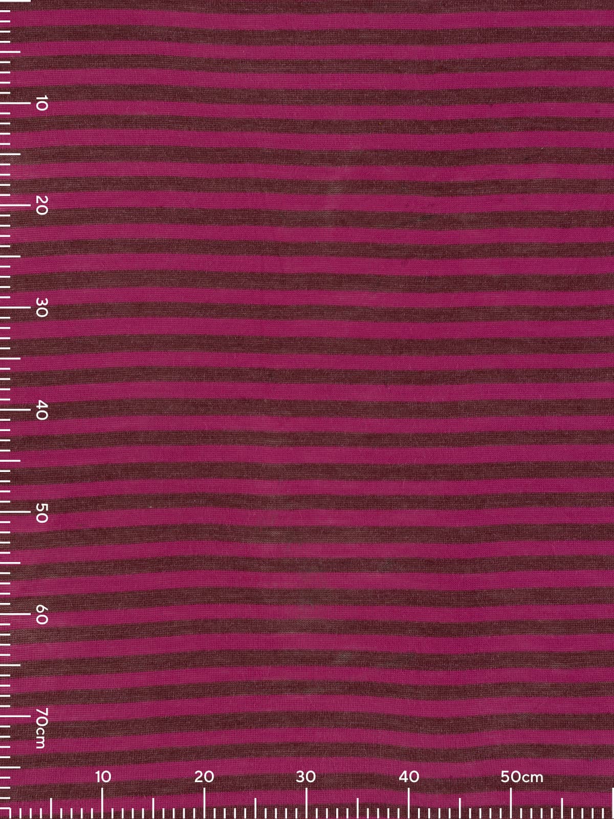 Design: A fine sweater knit worked in classic stocking stitch, featuring 1.7cm wide horizontal stripes in burgundy and magenta-raspberry tones, subtly enhanced with shimmering fibres for added depth and interest.