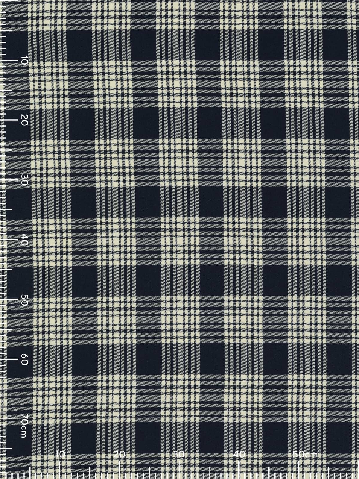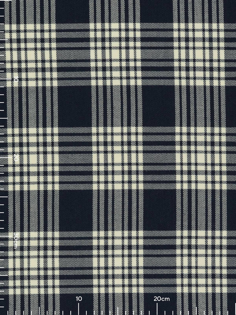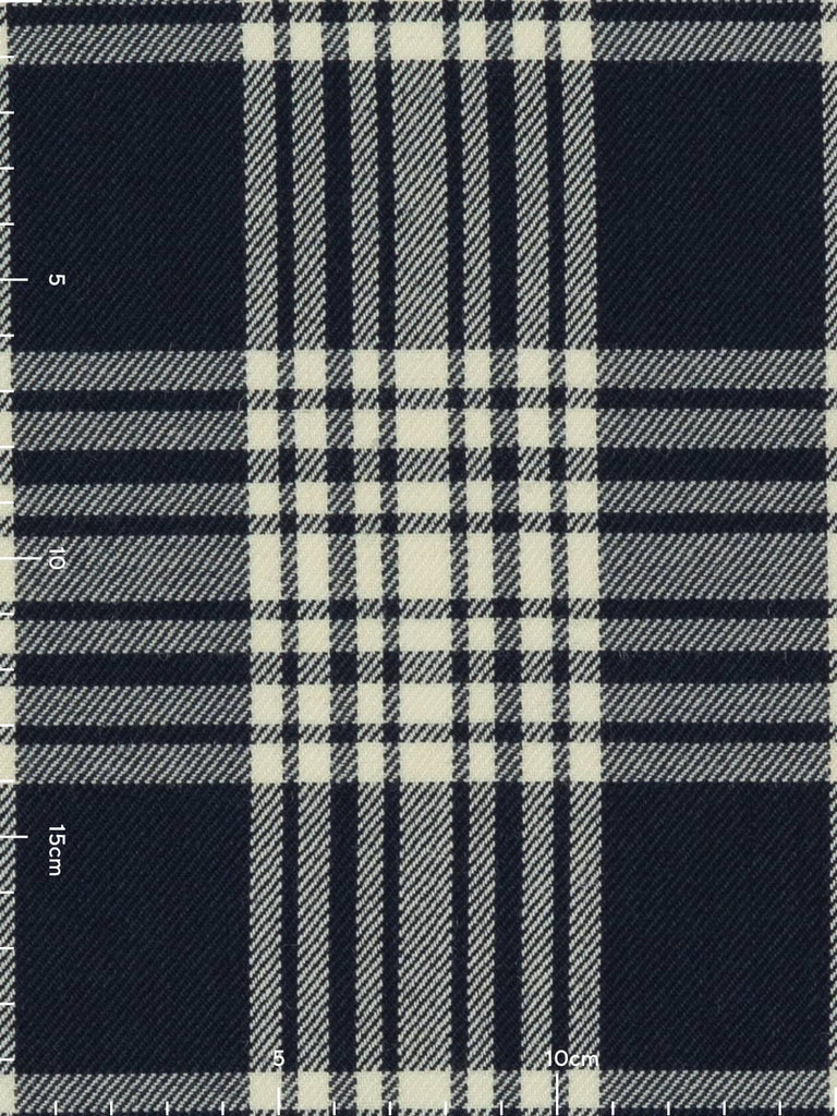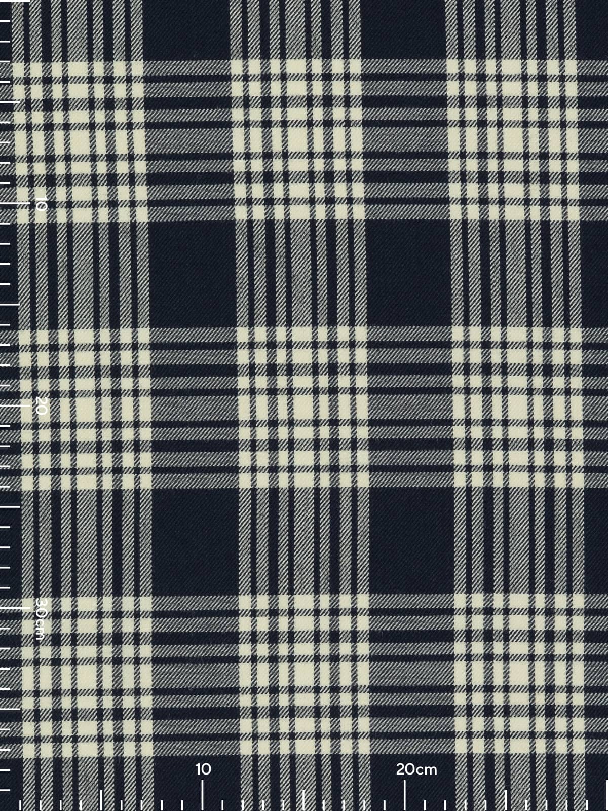 This version features a deep navy blue base that is interwoven with intersecting warp and weft stripes, creating a striking but unfussy tartan checked design. This bi-colour tartan is easily interpreted into a wide range of fashion and apparel.