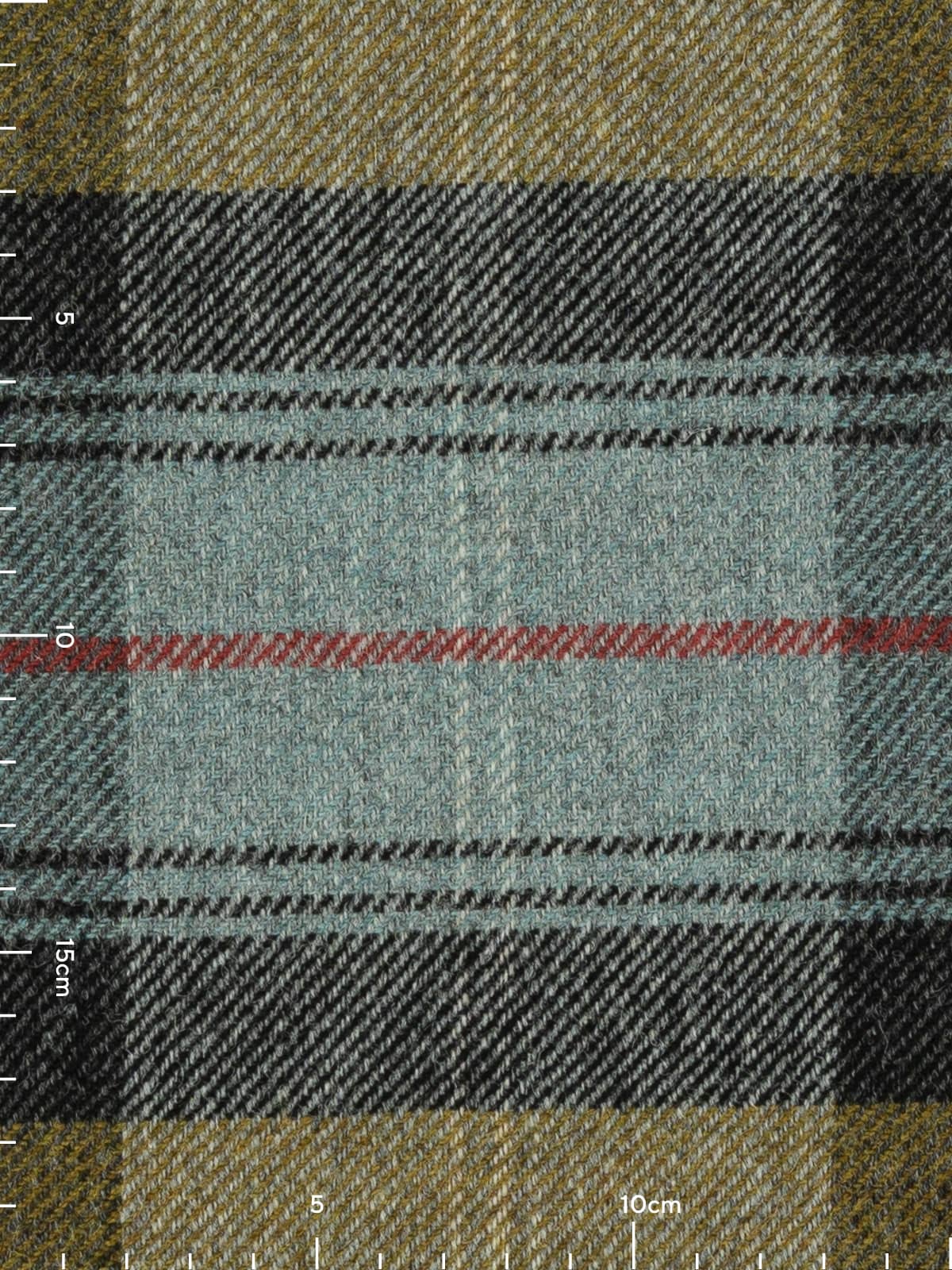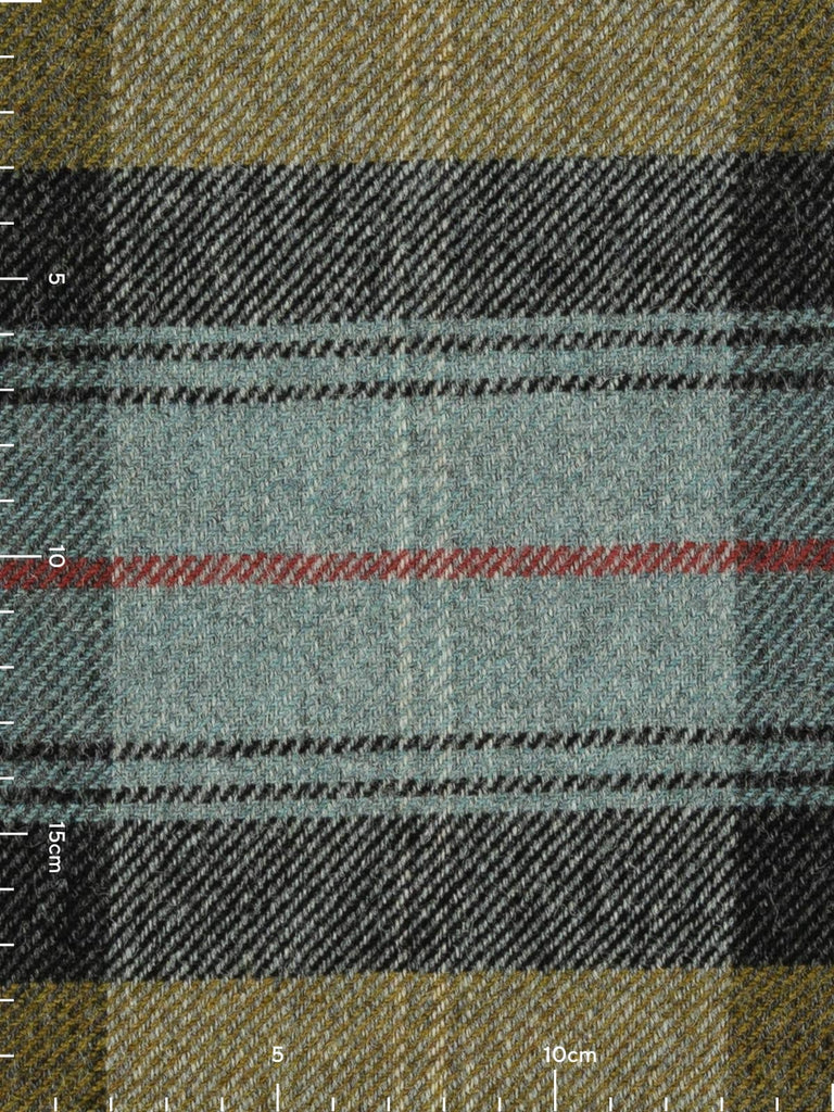 Shades: This delightful wool tweed plaid draws inspiration from the Seashore and features a sun-warmed, olive-gold green with a seaweed hue, redolent of graceful seaweed stirred by the gentle breeze. An overcheck of sea coal black flanks and defines the borders between the accent hues, where a melange yarn of soft, mineral blue with hints of grey and aqua evokes the cool water of rock pools mirroring the sky.
