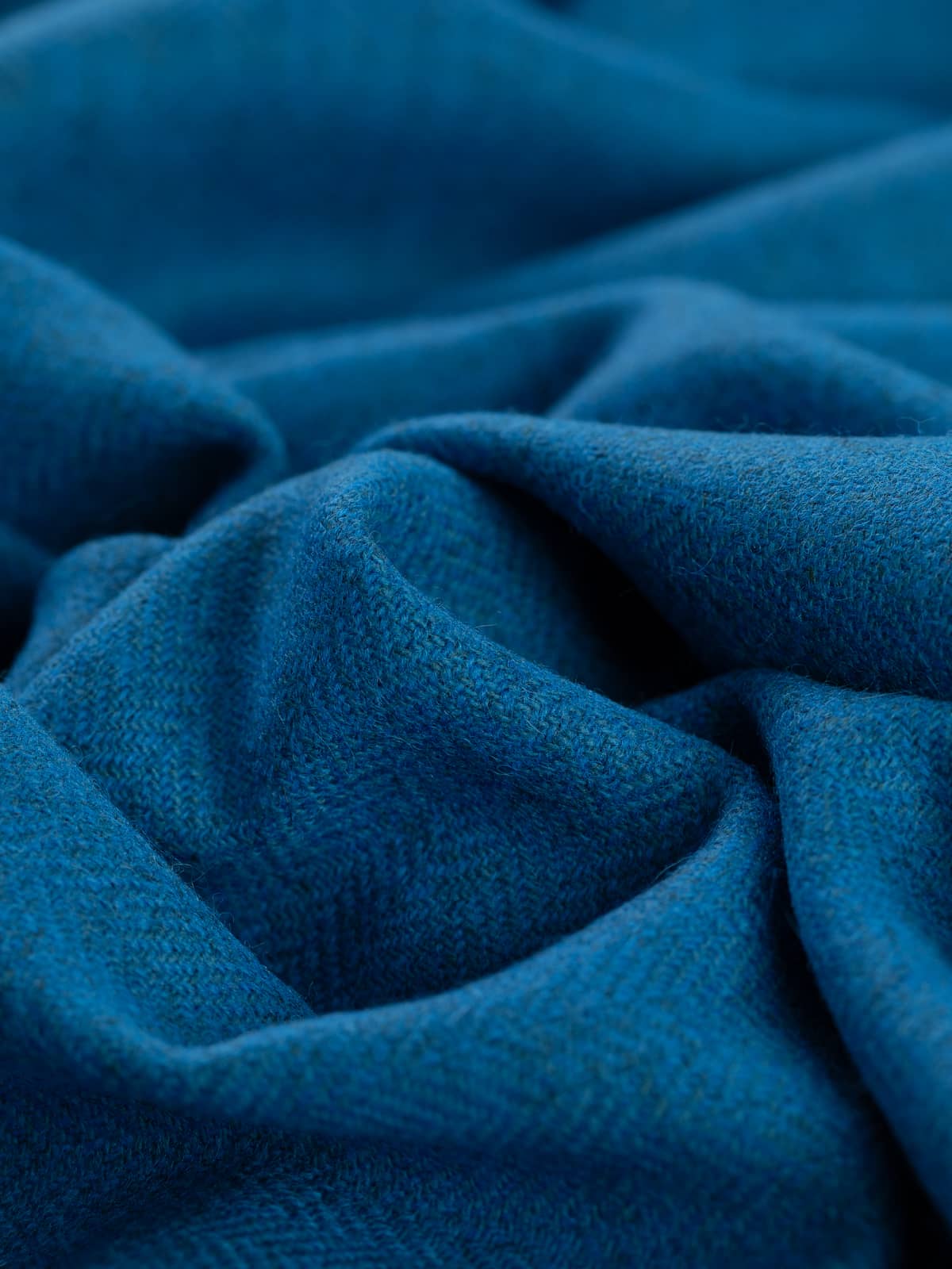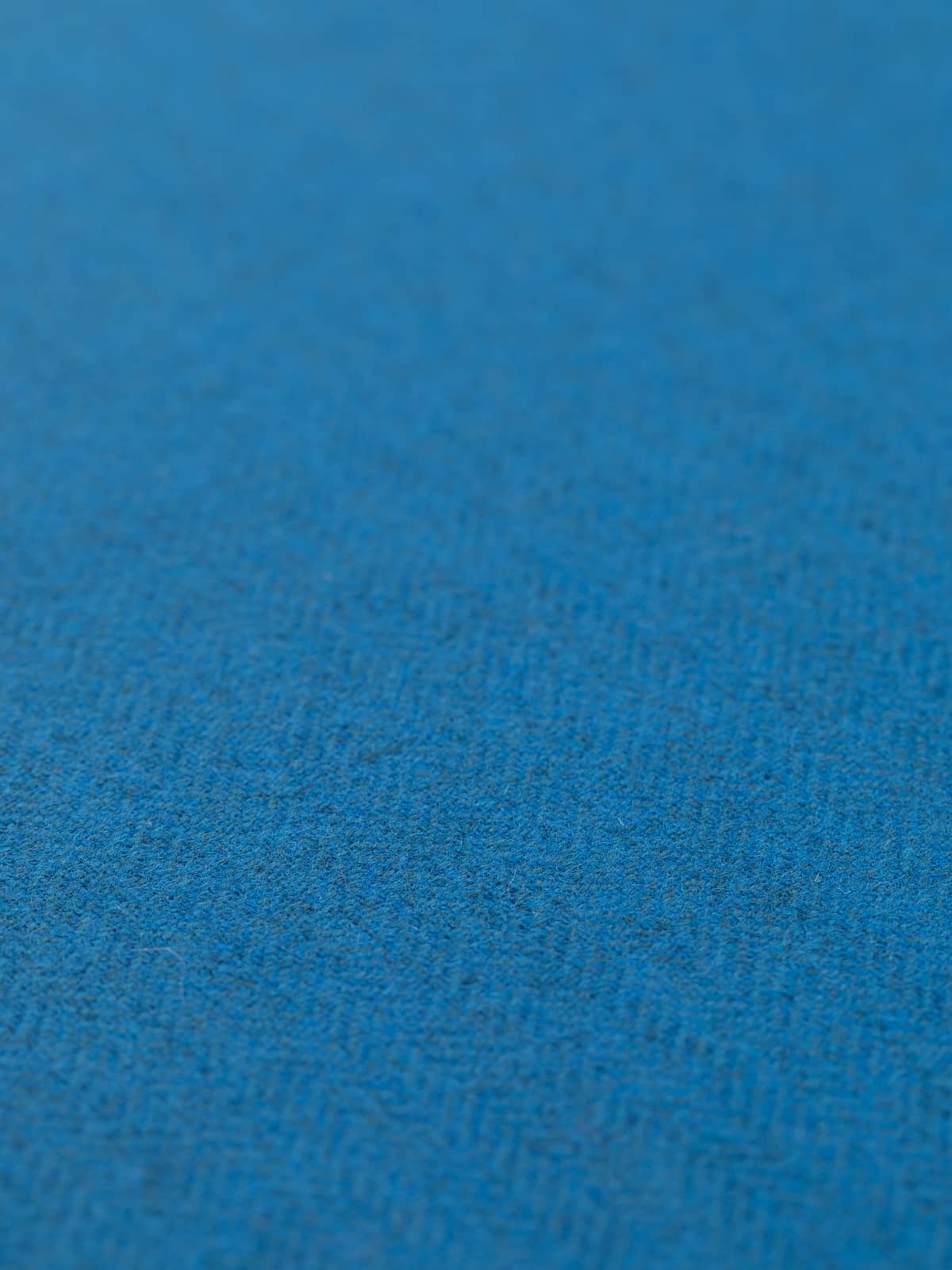 Shades: Autumn Azure is inspired by the blooming blue brilliance of autumn flowering Michaelmas daisies, captured against Yorkshire stone walls, under clear autumn skies that stretch over rugged hills. Their unexpected colour at the turn of the season mirrors the way this tweed brings freshness to a heritage pattern. The marled grey, natural wool, base yarn creates depth and a stony undertone beneath the vibrance of a true Azure blue dye.