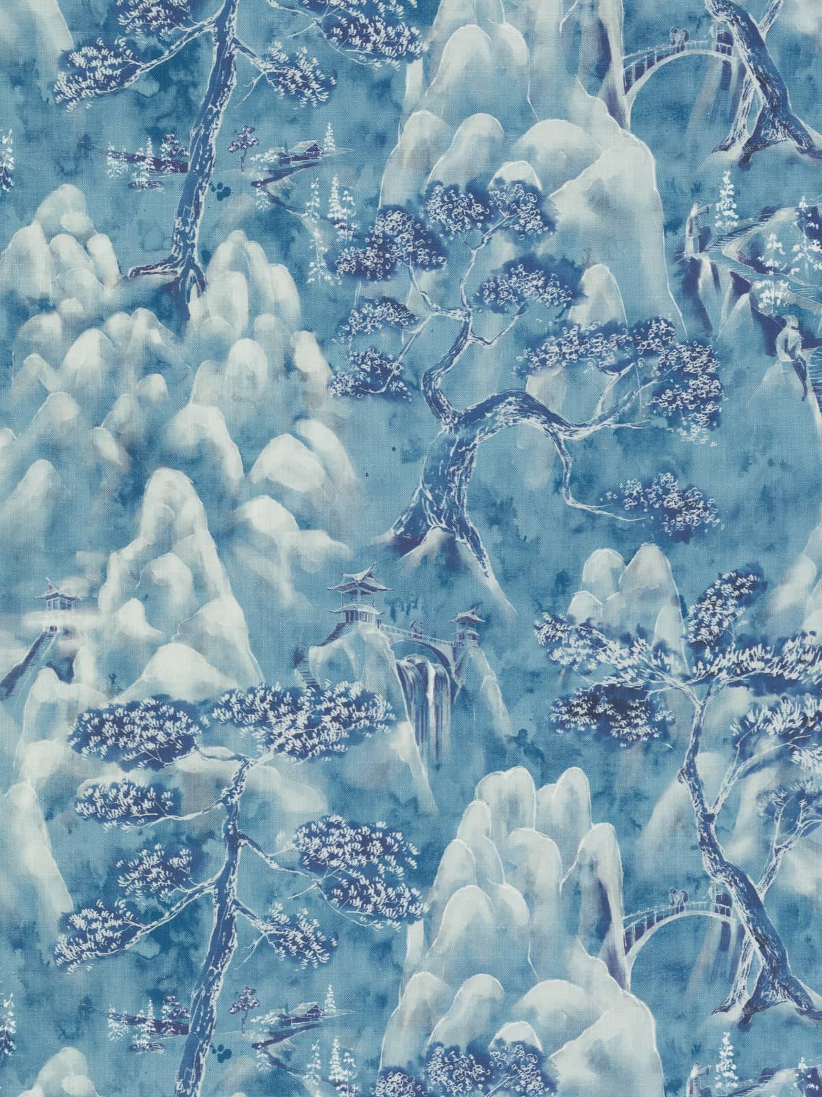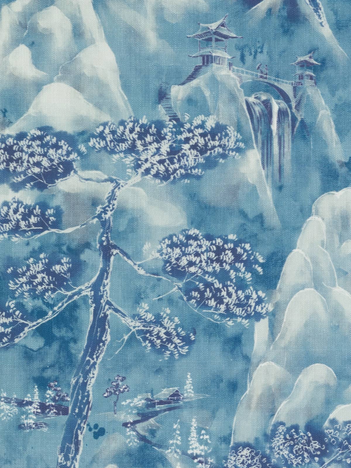 Design: Printed with a typically stylised Chinoiserie style design of  Mystical scenery where snow-topped mountain peaks tower over ancient trees, elegant pagodas and peaceful pilgrims.