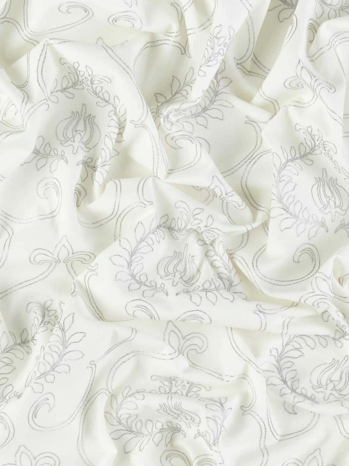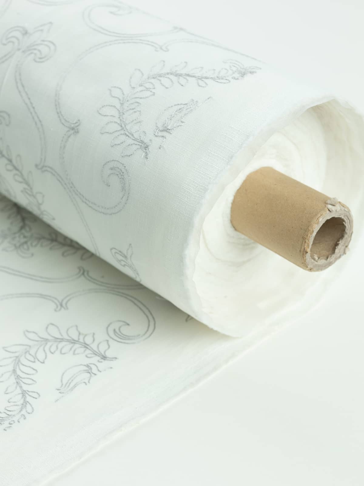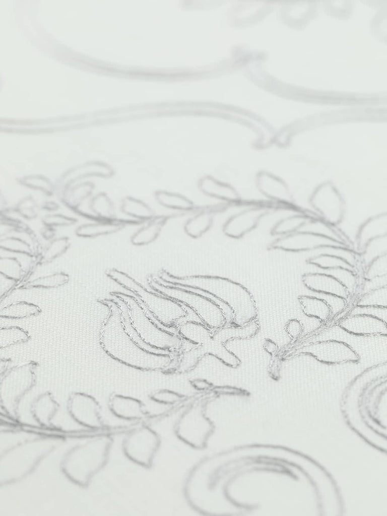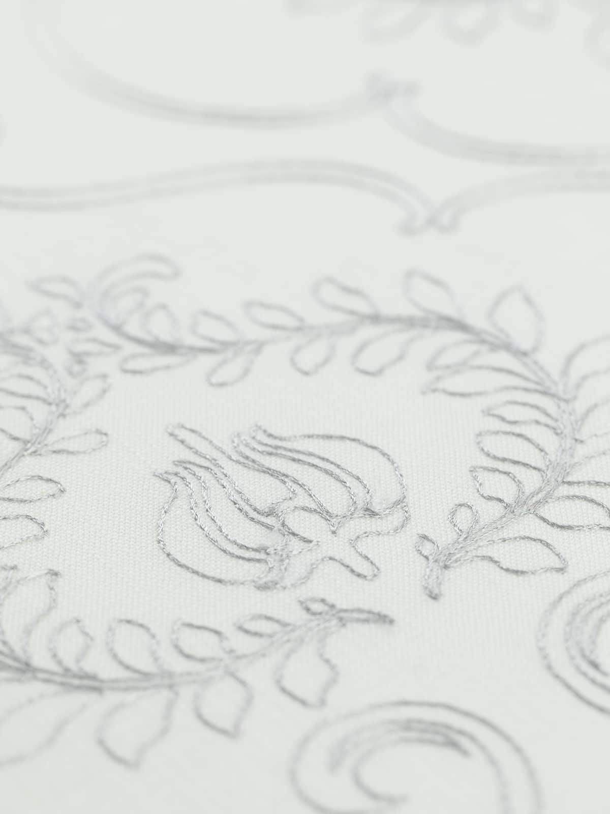 Shade: Laurel Wreath features a wonderfully fresh, light and airy natural white base and is embroidered with a subtle sparkling, silver grey, all-over design.