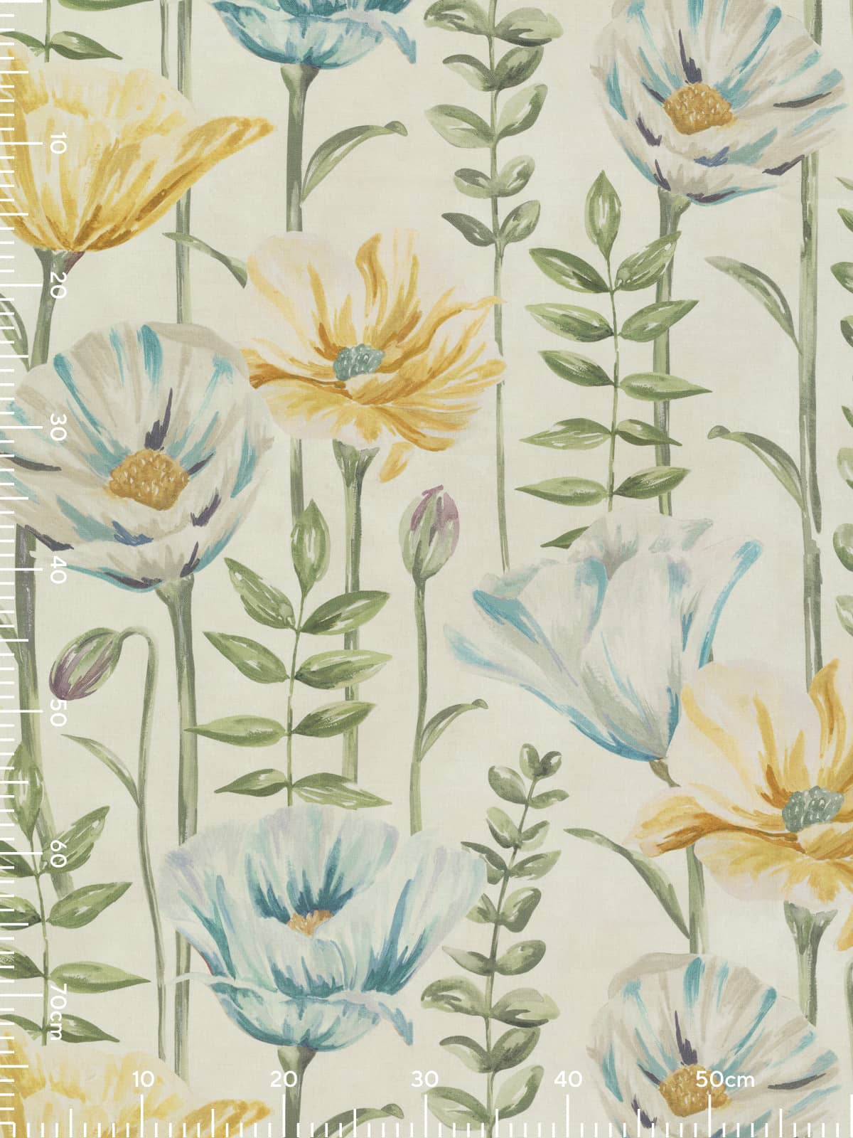Shade: Papaver Power is printed with a complementary palette of muted watercolour-like hues. A flax beige background gives the impression of natural linen and sports a design of grand Icelandic blue poppies sitting companionably with golden ochre hued poppies borne upon tall and slender stems of muted, dried herb-green. The recurring use of muted grey beige throughout the design gives an air of calmness in an otherwise bold design.