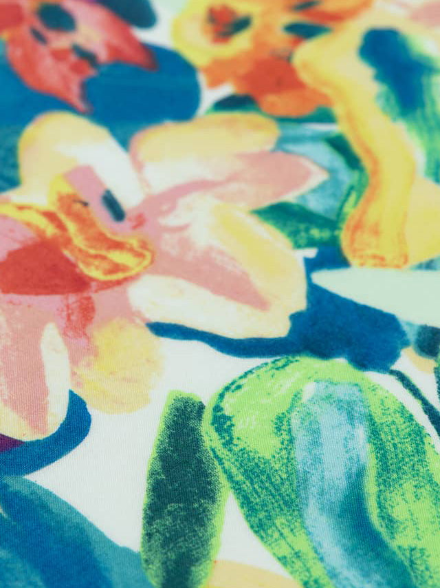 Design: Paint me a picture of paradise, and I would say the design on this Pima lawn is the perfect depiction. Eden’s Brushstroke is a lush, painterly botanical print, vivid, exotic, and full of warmth and movement. Since it’s a cotton lawn, there’s an elegance and lightness to balance the bold palette. A riot of blooms from the lily family jostle for position in this design, from the flushed pink centres of stargazer lilies to the fire hues of Frittliaries, all surrounded by jewel-hued foliage.