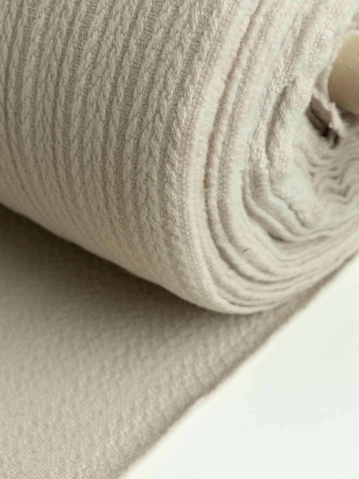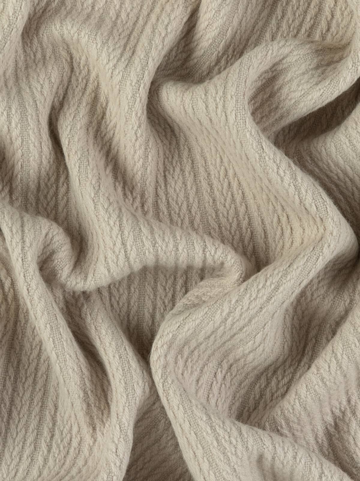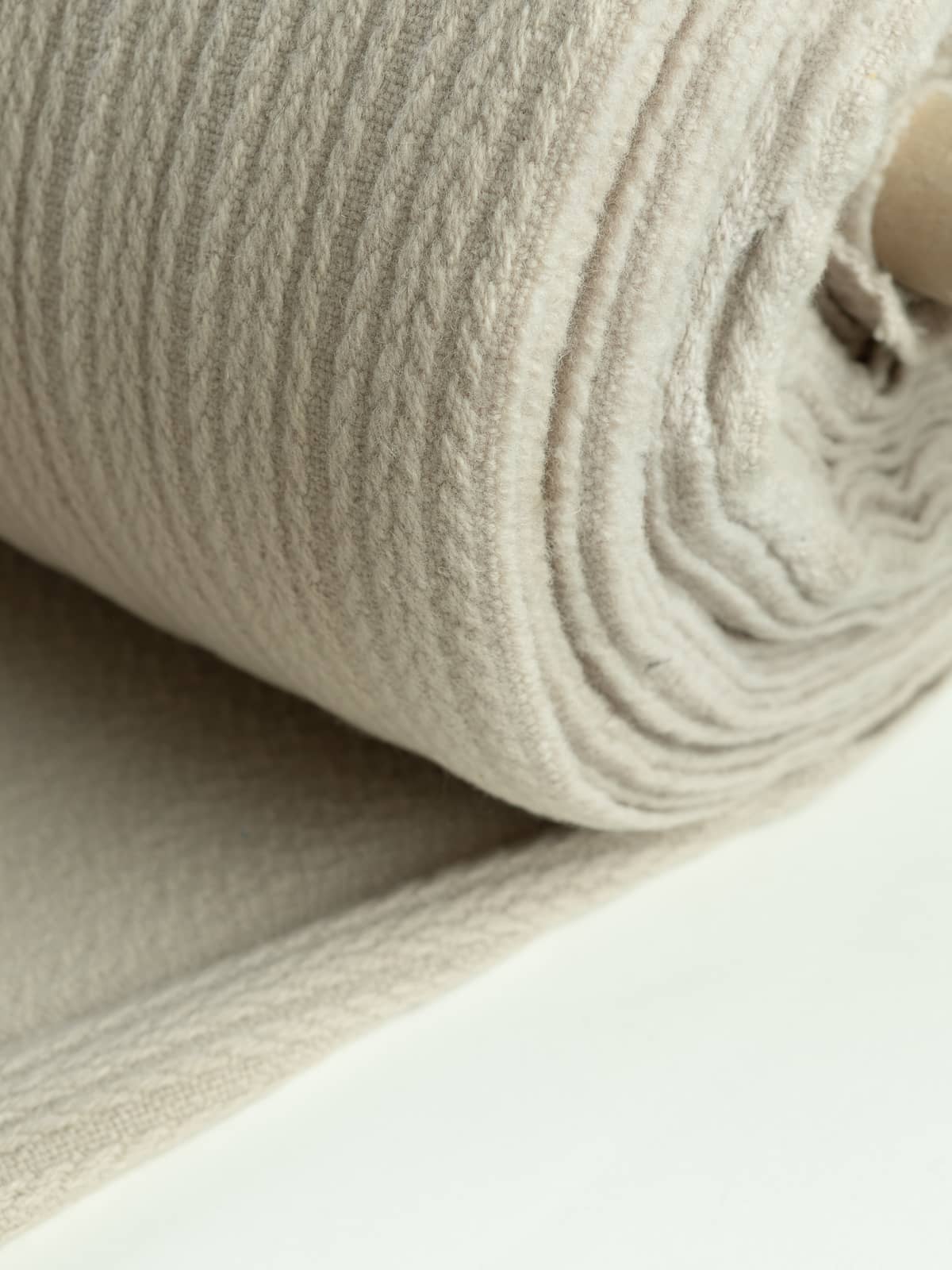 Handle: A base weave akin to a close basket weave, combined with the cables, produces a dense, heavy-weight fabric, with good stability and natural ease across the width and bias. A soft and cosy looking fabric with durable woolen properties.