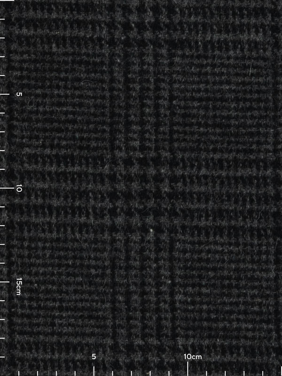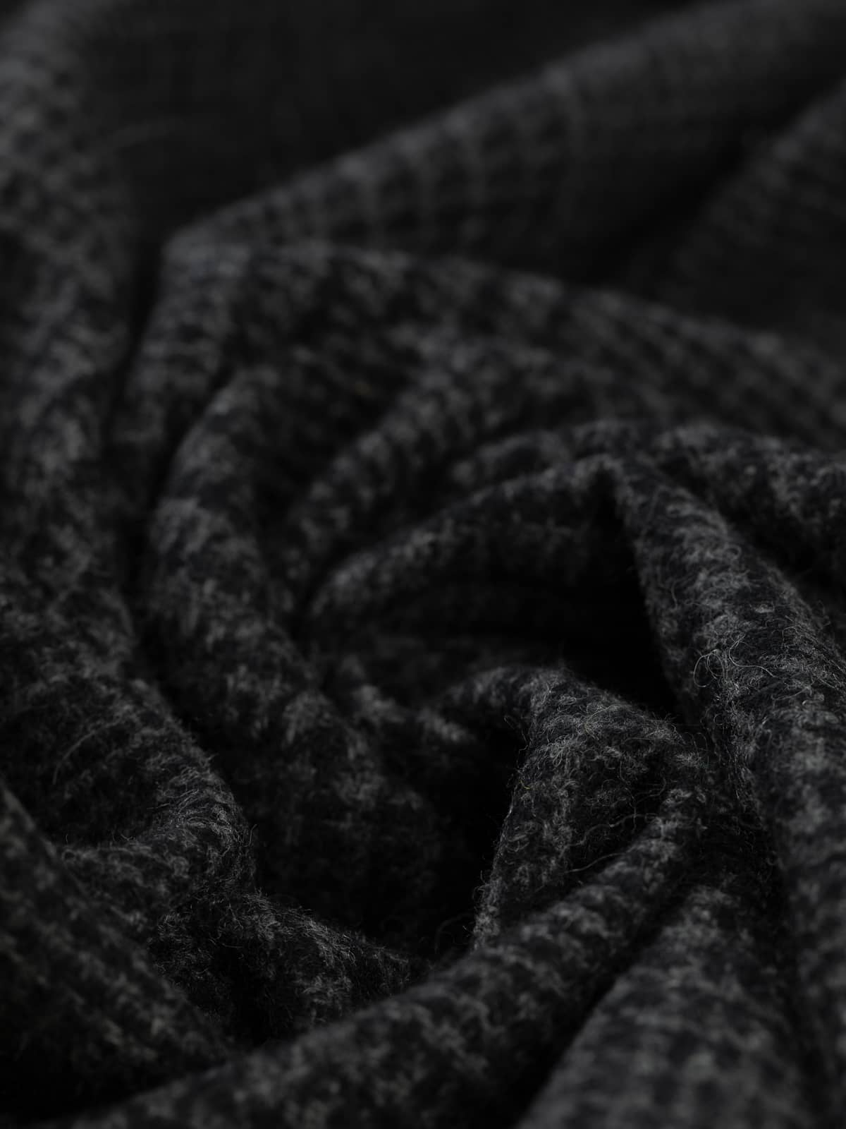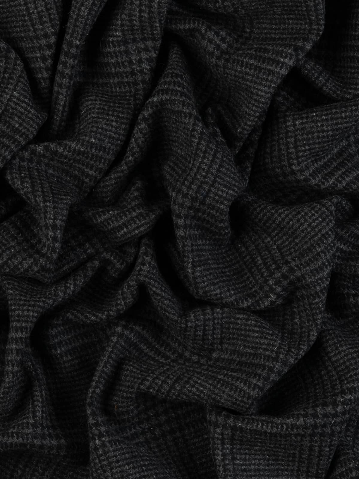 Shades: A moody palette of storm grey melange yarn woven alongside black makes this all wool  District Check a classic choice for  A/W outerwear. The perfect fabric to create protective coats where you can pull the collar up and flee from the Gathering Storm.