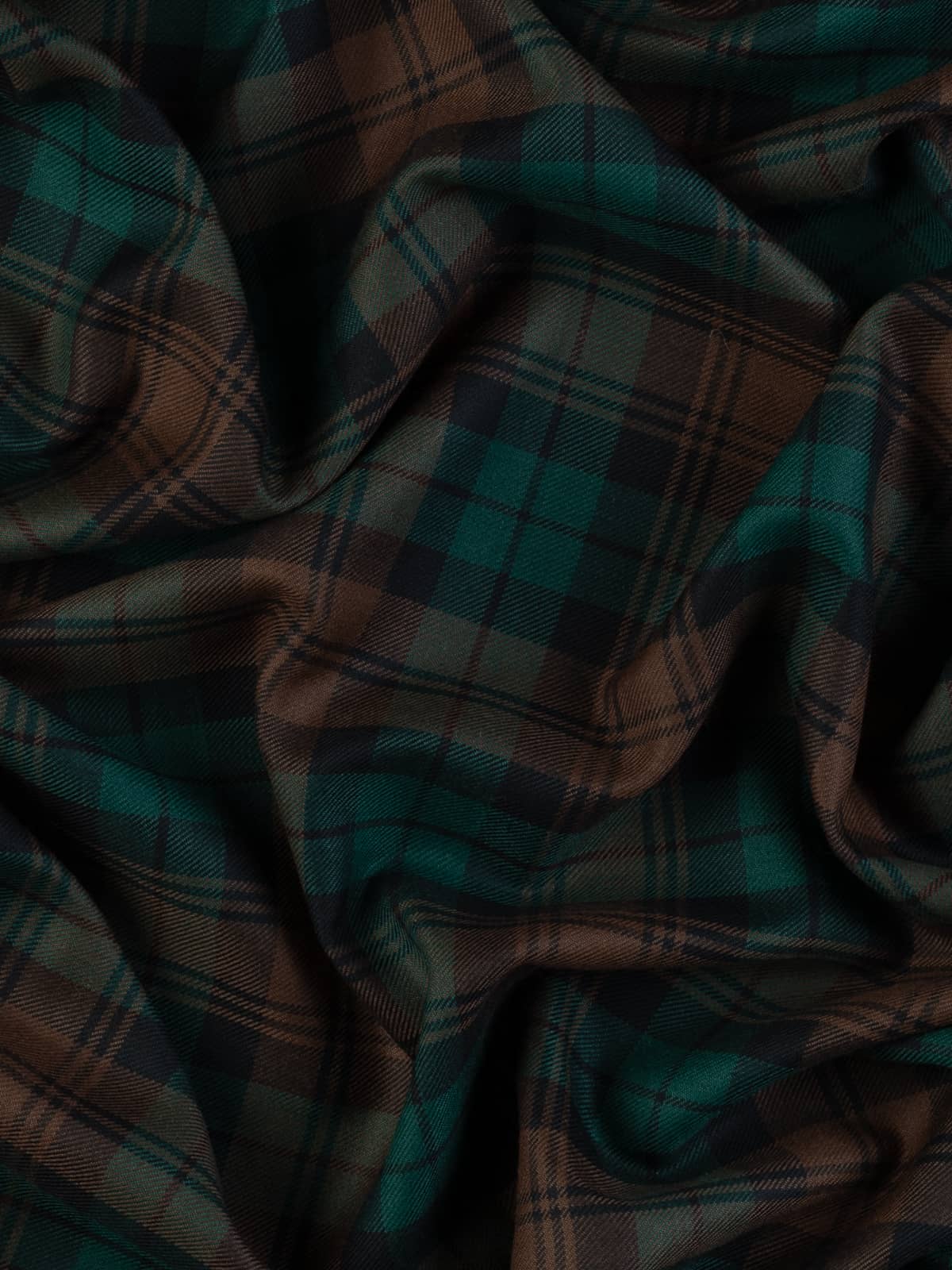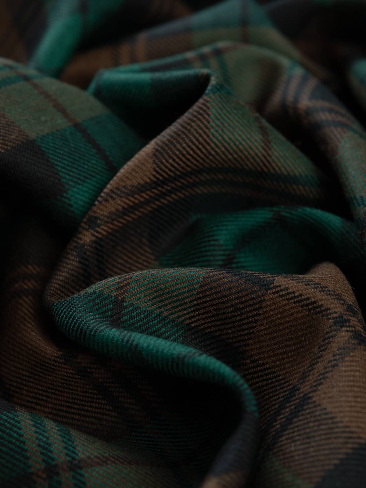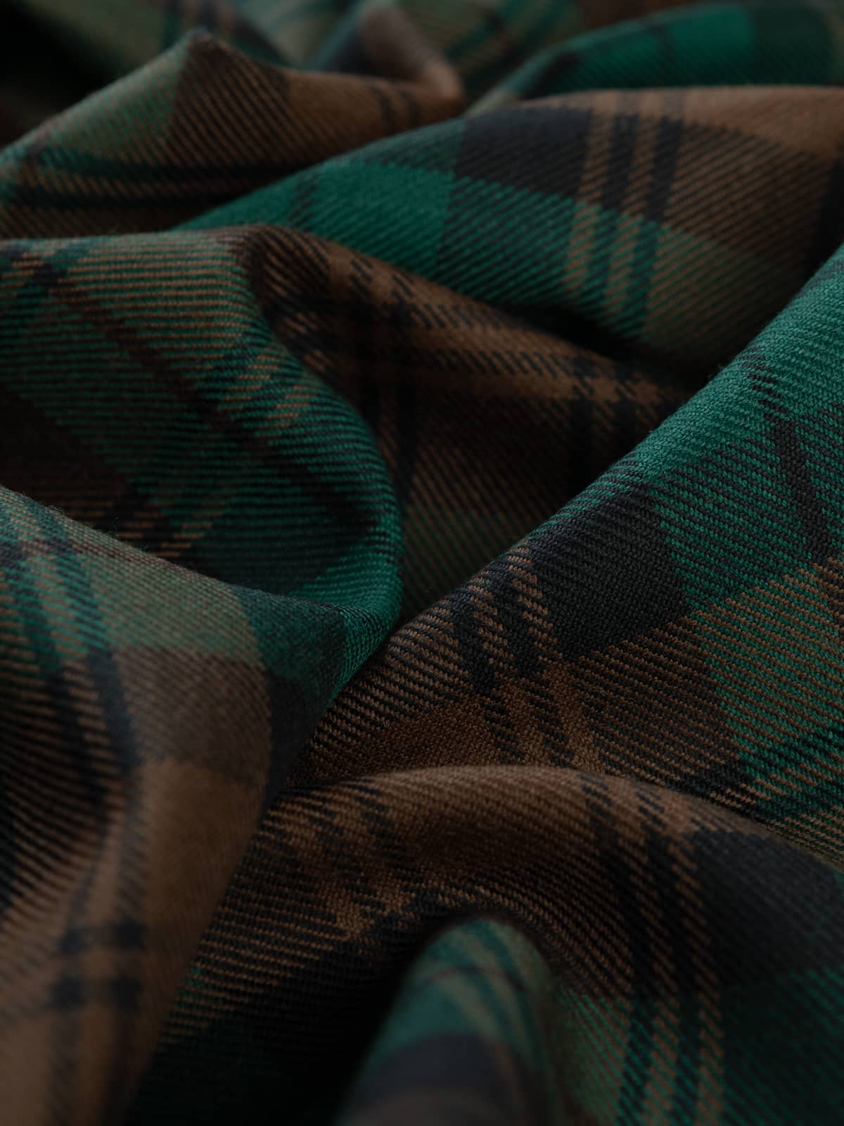Design: A watch‑style sett characterised by broad blocks of brown intersecting with green fields, overlaid with fine black overchecks. The geometry is disciplined and evenly balanced, producing a structured, traditional grid. The design corresponds with the established Brown Watch lineage recorded in official tartan registers.