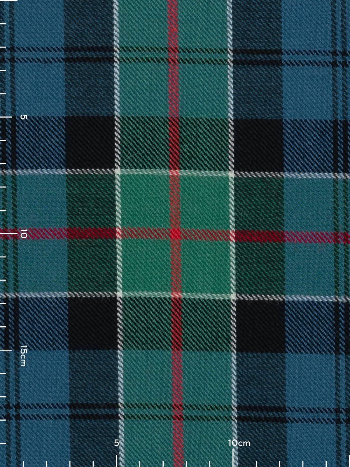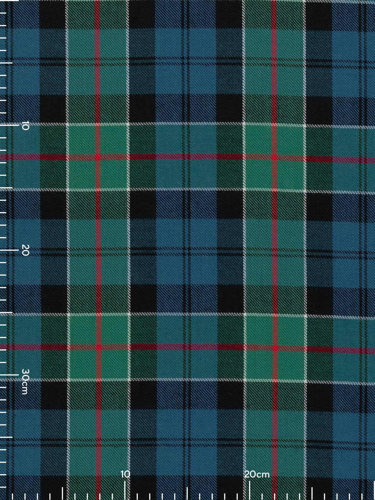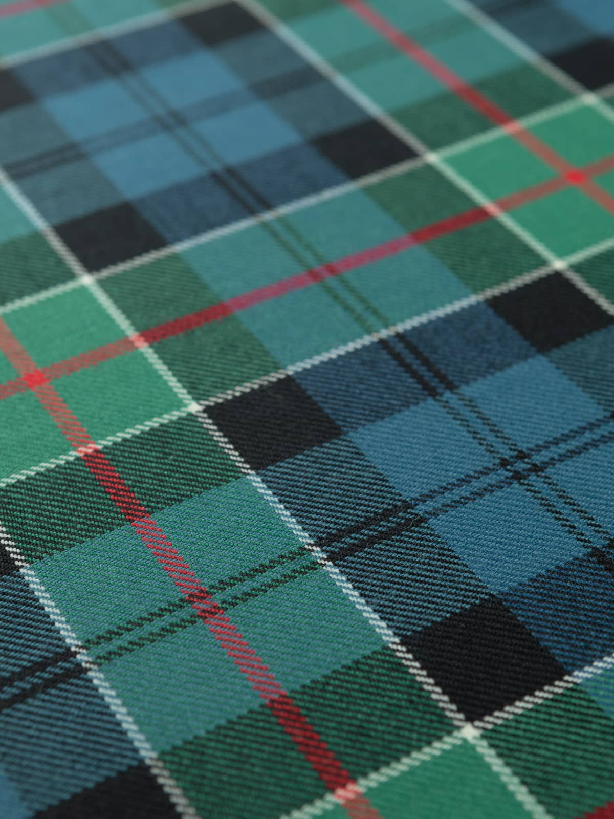 Design: A classic Colquhoun sett formed from alternating squares of blue and green, overlaid with black bars that establish the core framework. White lines cross the design at even intervals, creating a crisp, structured grid, while the red stripes run vertically and horizontally to highlight key intersections. The arrangement is symmetrical and orderly, with the softened colours giving the design a gentle, traditional character.