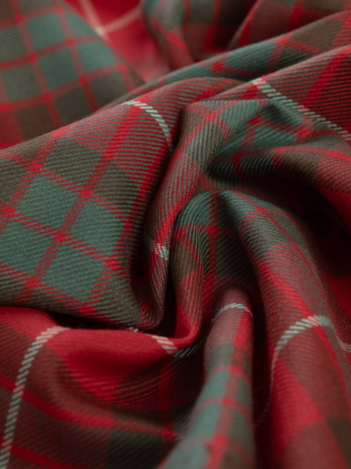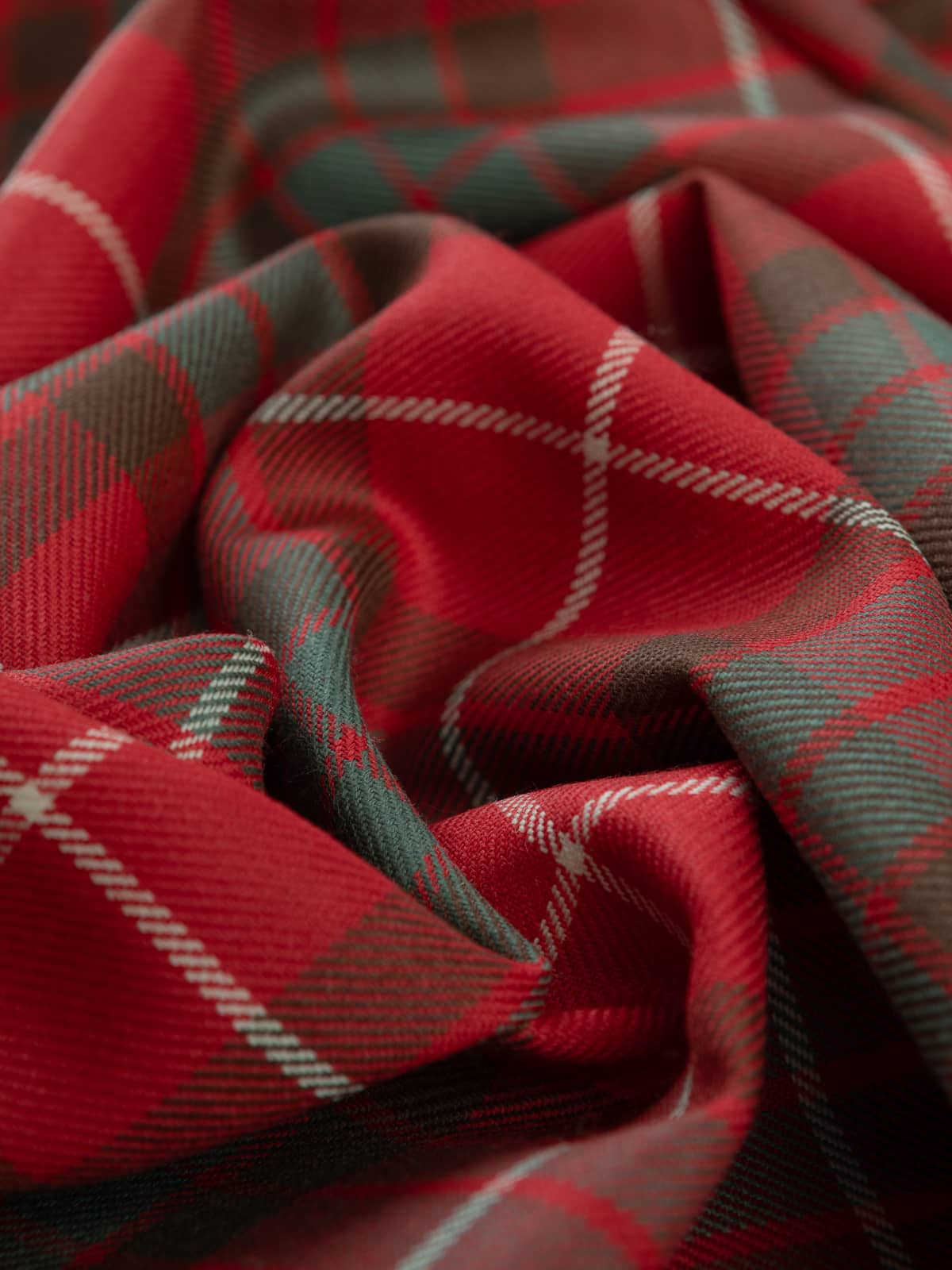 Design: A classic Fraser sett composed of balanced red panels intersected with green and charcoal checks, overlaid with fine white stripes. The pattern remains consistent with the established Fraser layout, with the muted palette providing a more understated, heritage‑toned expression while maintaining full sett integrity.